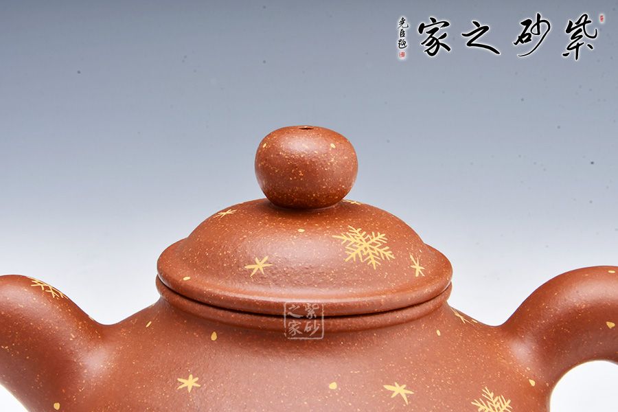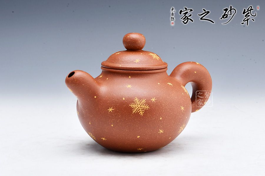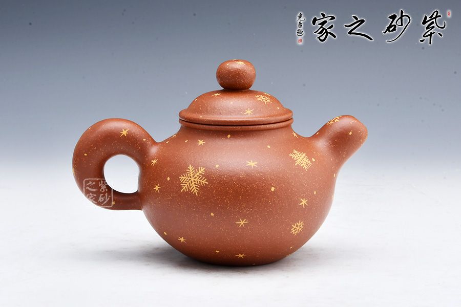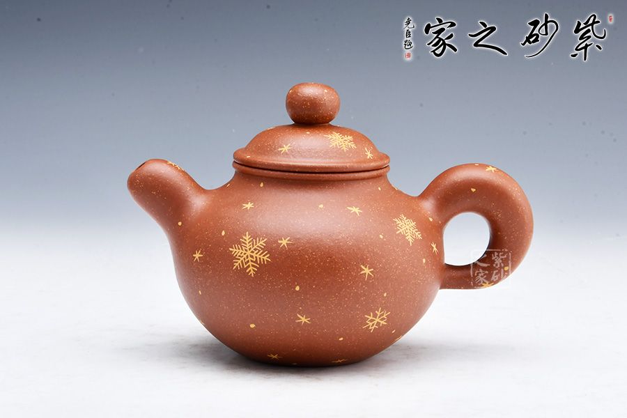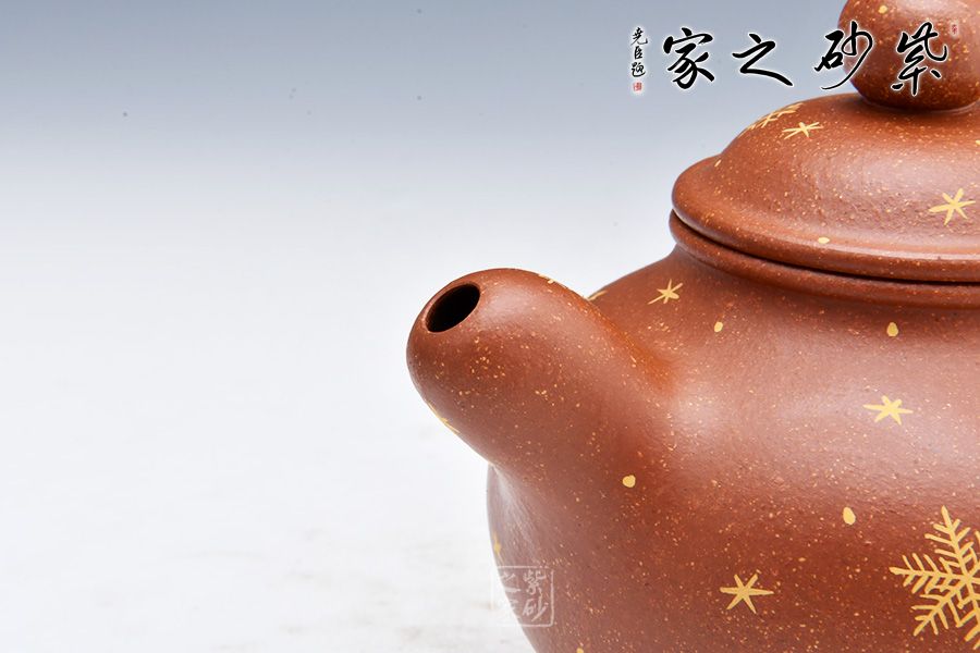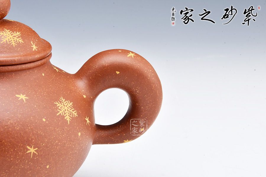 便便大腹的壺身美觀精致,飽滿輪廓溫潤可人。整體造型顯端莊矜持。壓蓋飽滿平整,圓珠鈕細膩精致。圓圈壺把美妙自然,粗細均勻。壺嘴設(shè)計出水利落,直瀉而出似清泉。壺把與壺嘴相呼應(yīng),頗具道洪風格。壺身描金雪花圖案,也有瑞雪兆豐年之意,得此壺者得祝福,傳達作者的祝福之意。