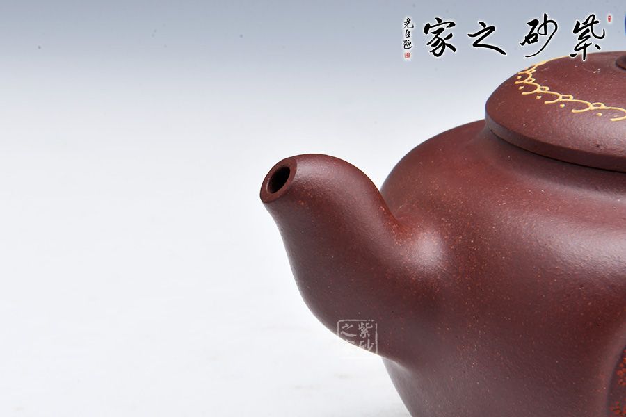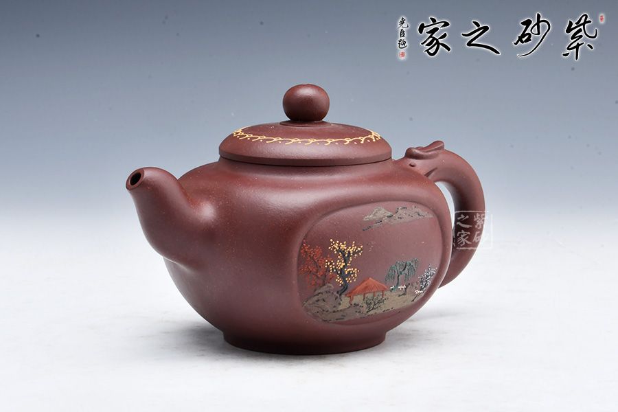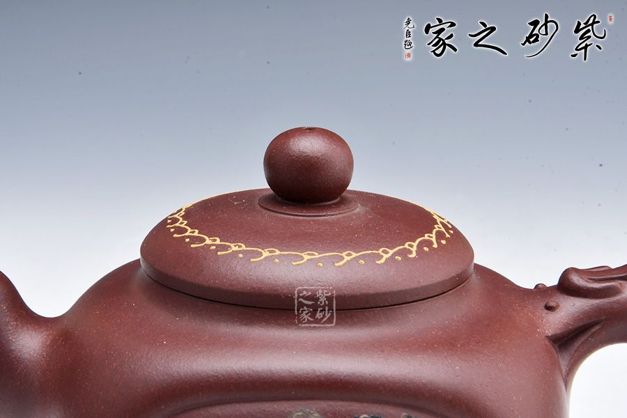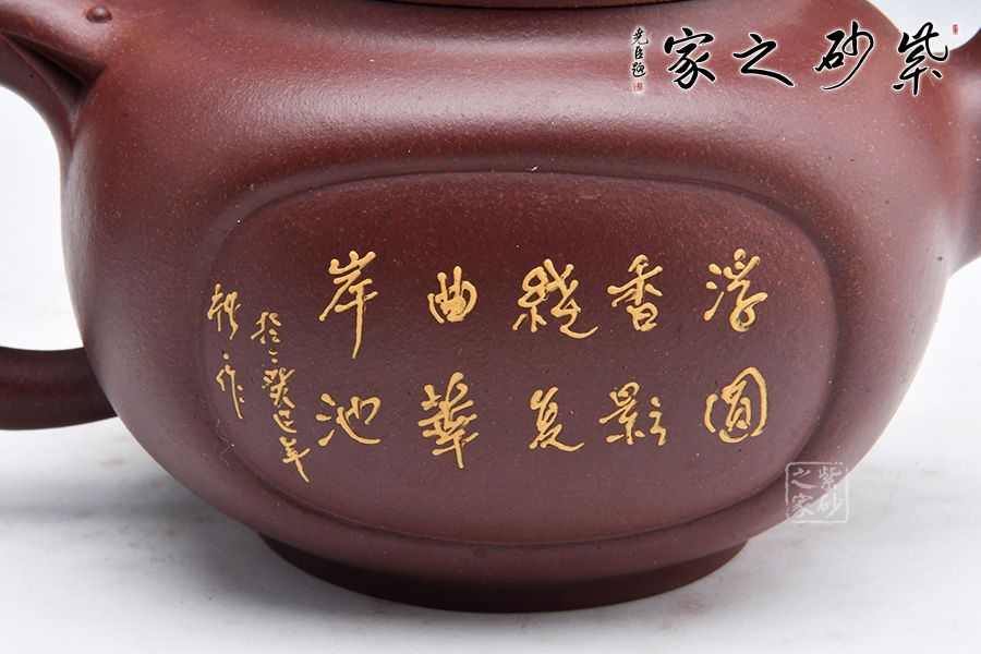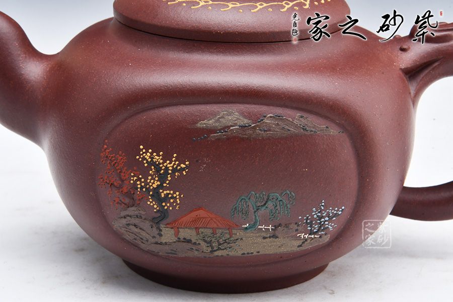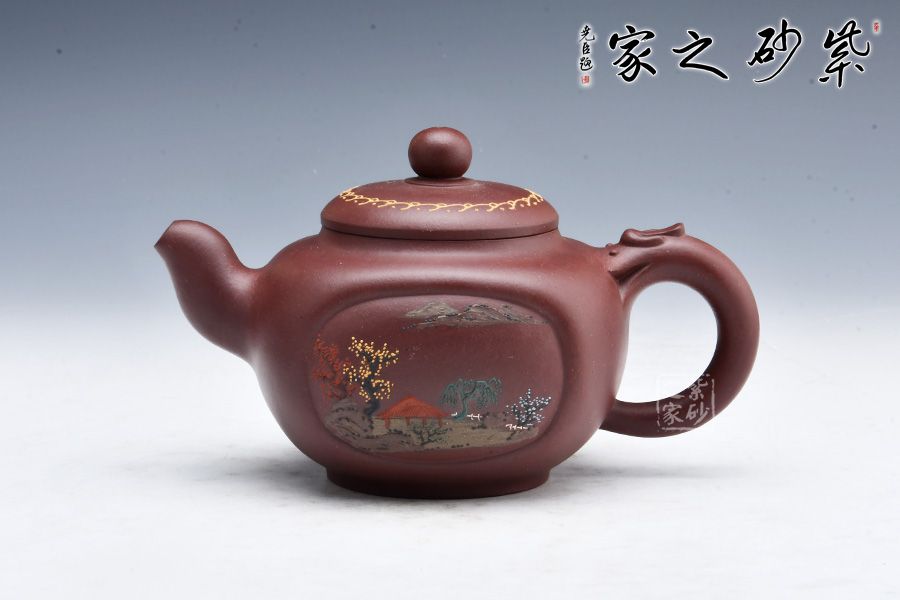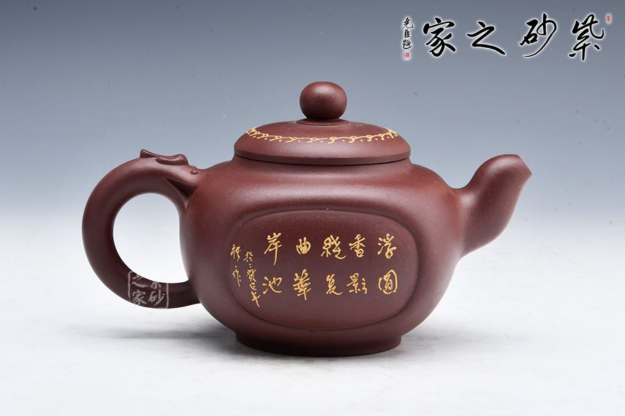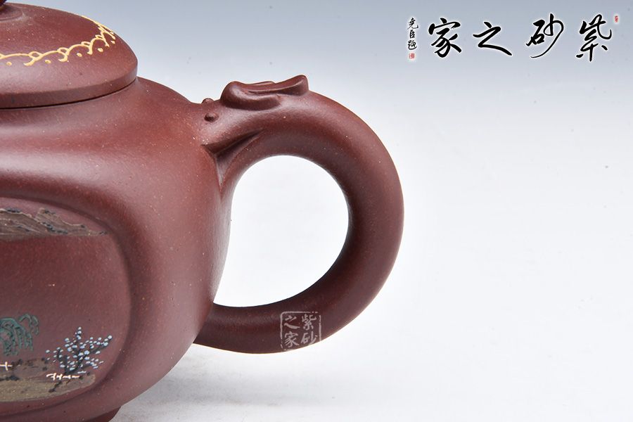 此壺圓中寓方,彎流紐皆采用暗接手法,彎流,耳形把上裝飾有龍,壺蓋咬合嚴密繪制紋飾,上有珠形紐。壺身兩面開窗,泥繪風(fēng)景詩詞,無論形體輪廓,還是結(jié)構(gòu)比例都恰如其分,造物造境,都經(jīng)得起長久玩味,充滿藝術(shù)魅力。