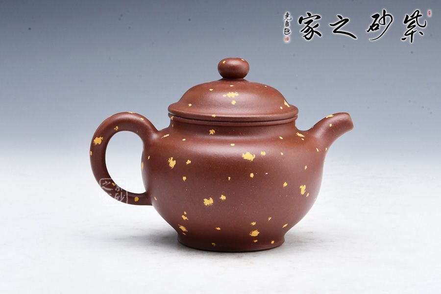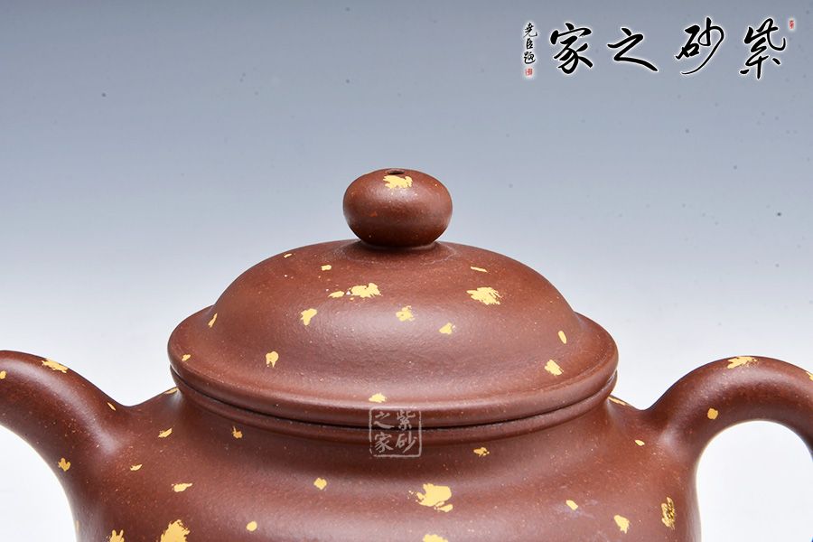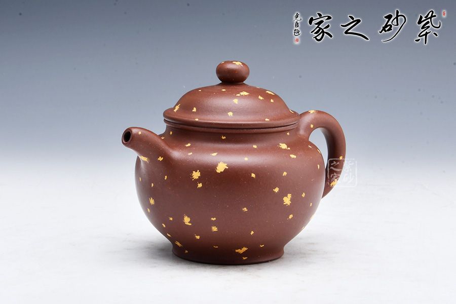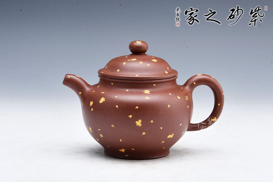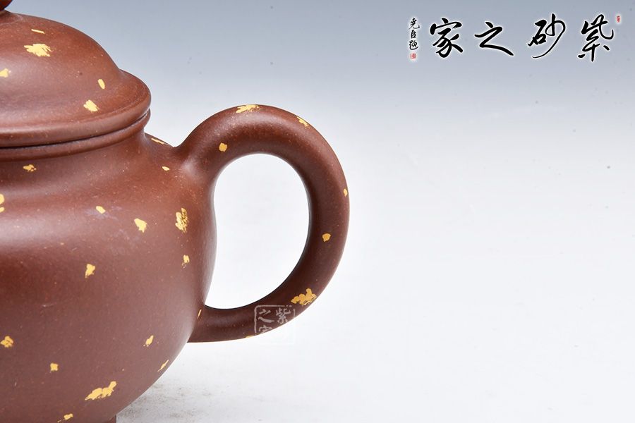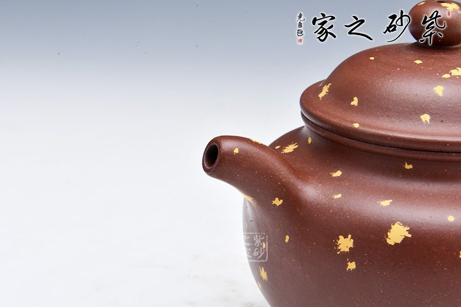 此壺有著渾圓的壺身,半圓的壺蓋,圓鈕,線條流暢,比例得當(dāng),不費(fèi)吹灰之力,壓蓋略微渾厚,呈鎖蓋之勢(shì),點(diǎn)線之間見(jiàn)出魅力,彎流嘴胥出,在端頭下壓,柔美之姿明顯,壺柄略微上抬之后優(yōu)雅滑落而下,形成一條圓潤(rùn)飽滿的弧線,樸雅大方。加上撒金裝飾,更添華麗富貴之感。