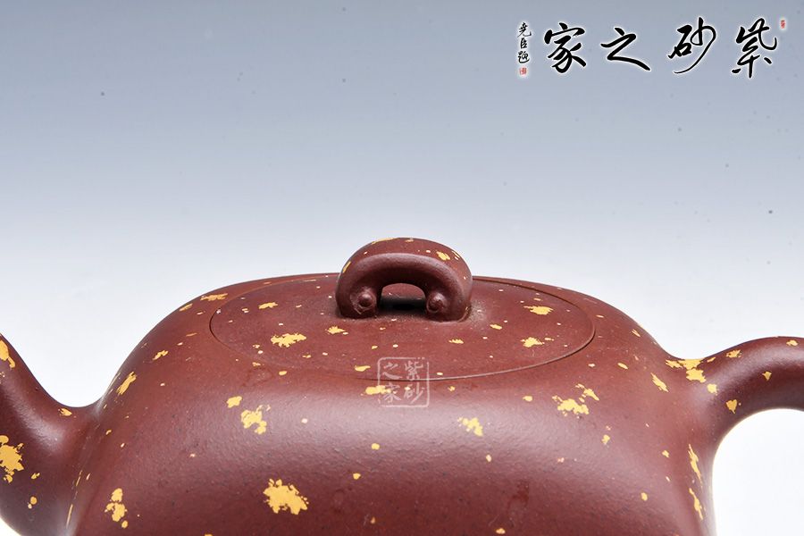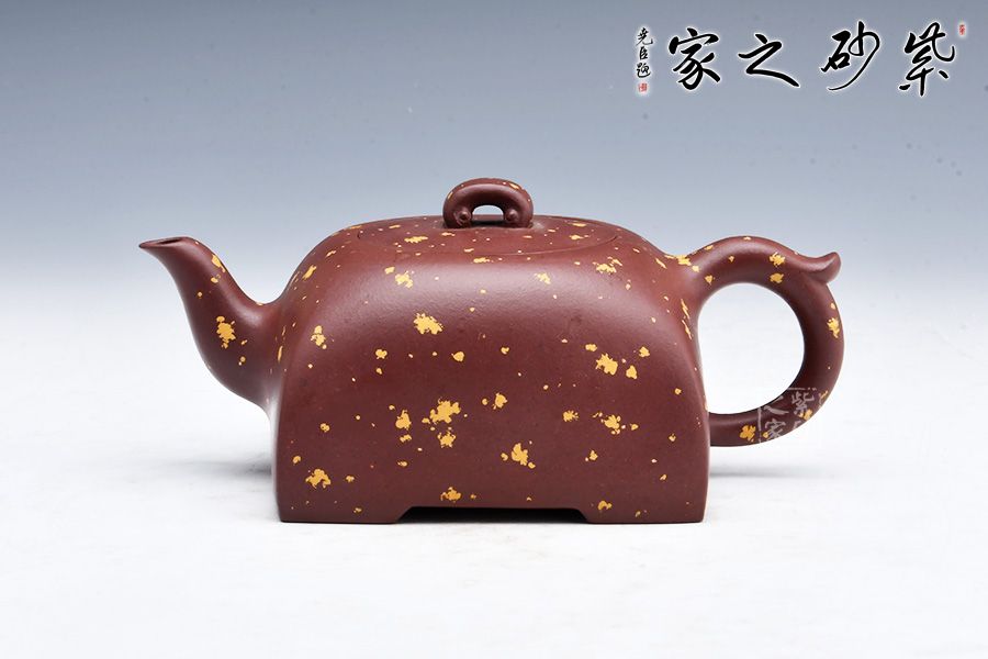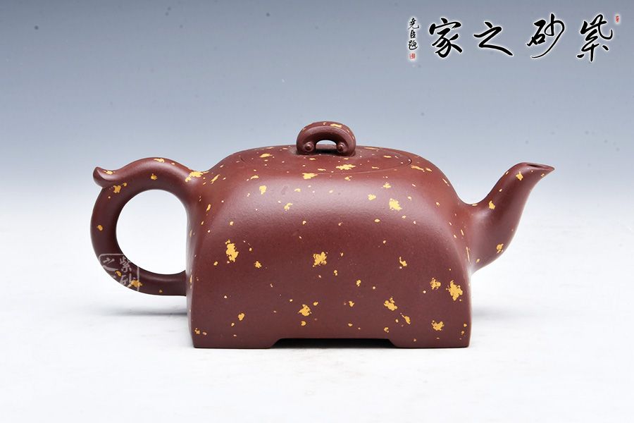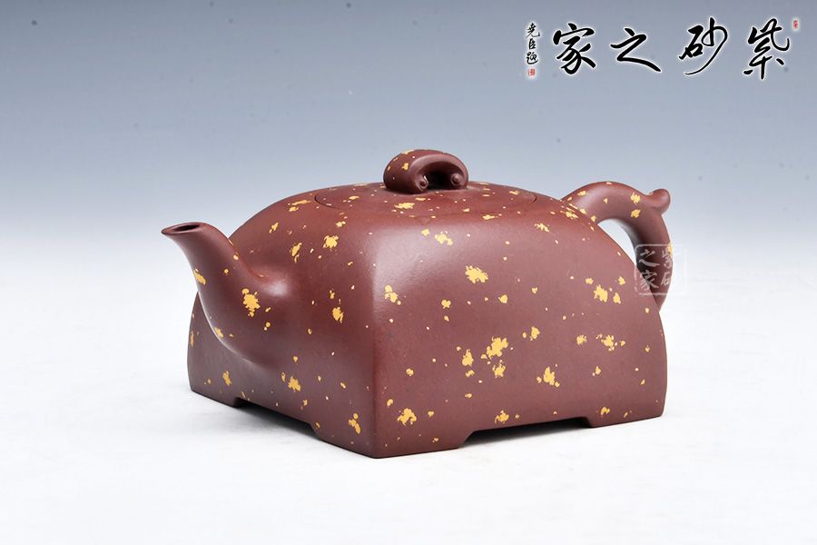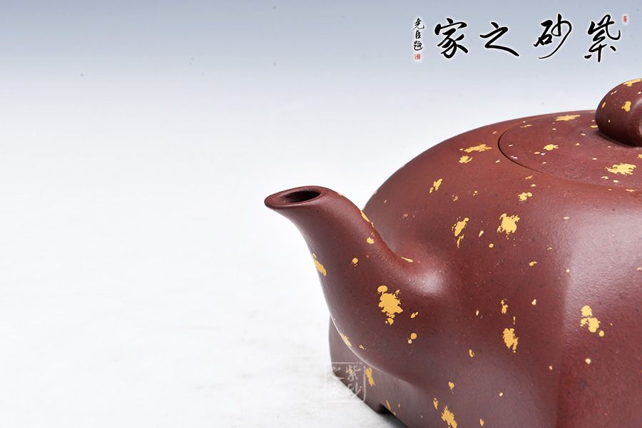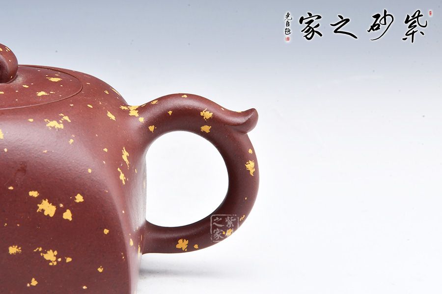 此款弧棱壺又有自己的特色,壺呈方形四角圓潤,方中寓圓,藏鋒不露。四底足與壺身渾然一體,堅(jiān)挺平穩(wěn),富有力度。彎流順胥,飛把與壺身協(xié)調(diào)一致。嵌蓋如意鈕,簡潔大方。壺身撒金工藝,整壺弧圓合度,是一款風(fēng)骨俱佳的紫砂精品!
