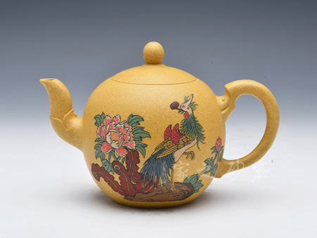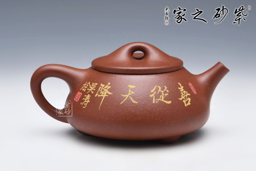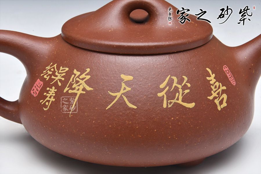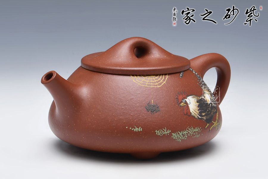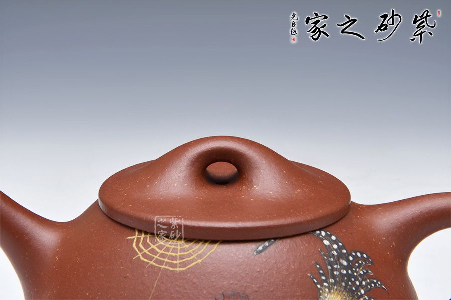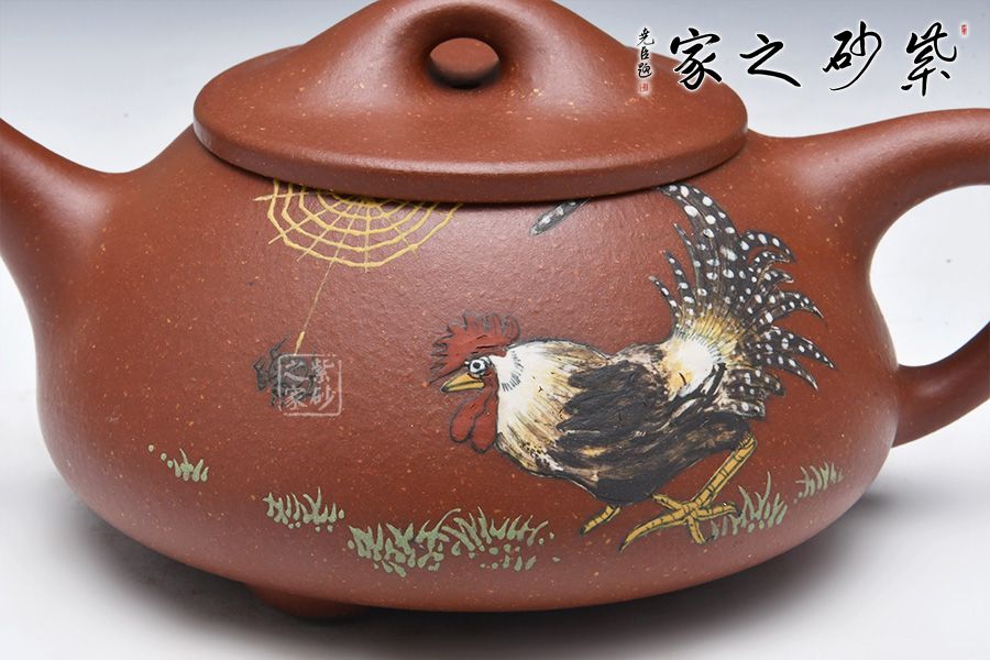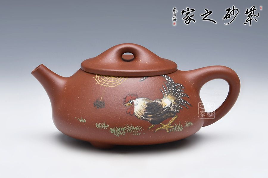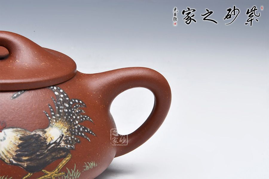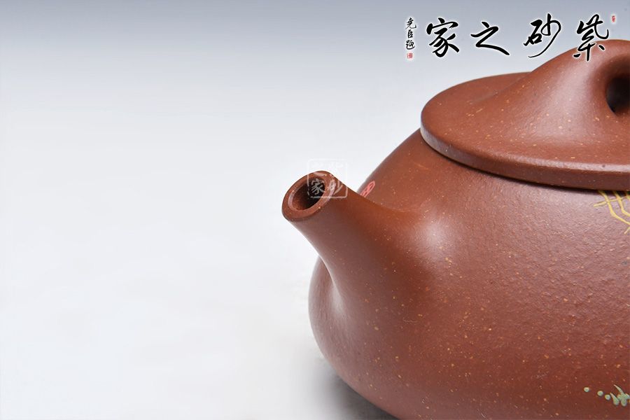 石瓢永不退不出潮流的器型之一,造型含蓋多種三角形,是一種形狀與平面的結(jié)合的美,整體壺型敦厚穩(wěn)實(shí),質(zhì)樸舒雅。壺鈕壓蓋極低,更見淳樸穩(wěn)重,壺嘴、壺身、 壺把比例協(xié)調(diào)。壺身彩繪裝飾,頗有閑趣,值得賞玩。