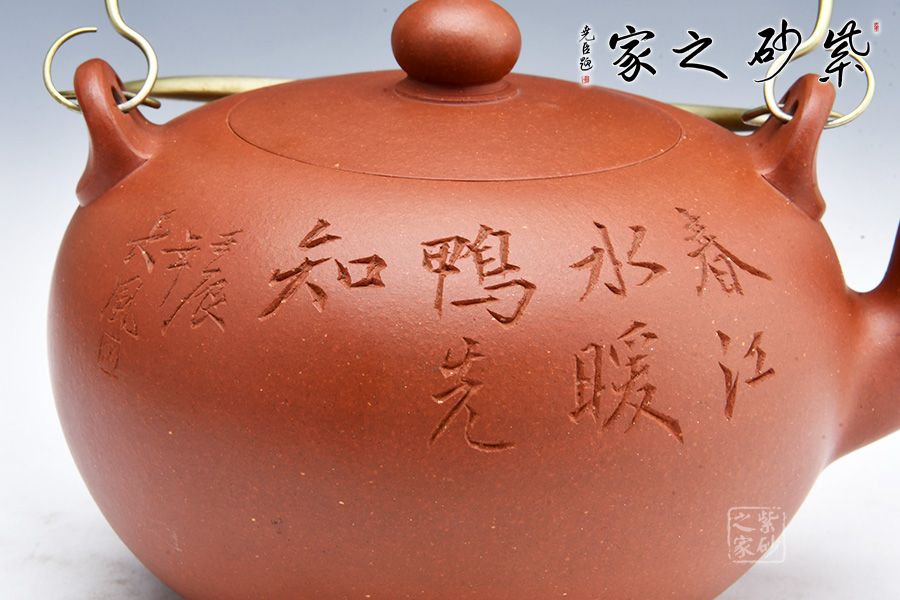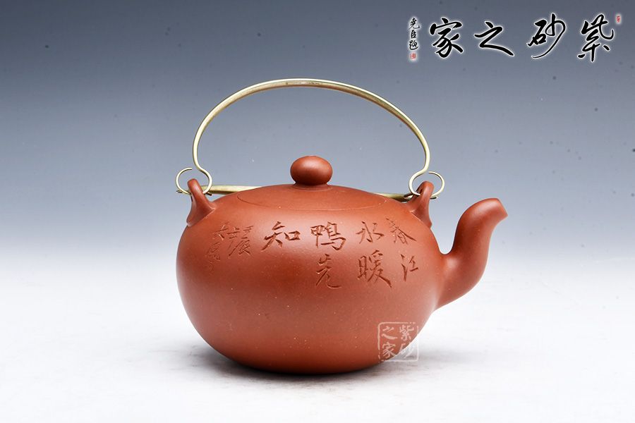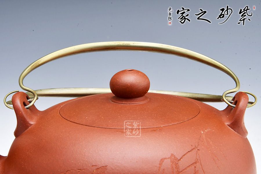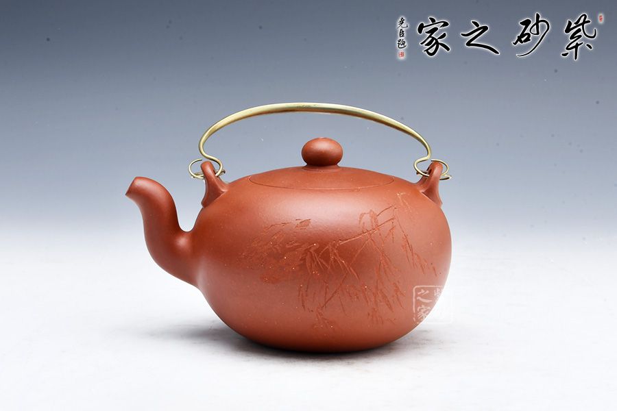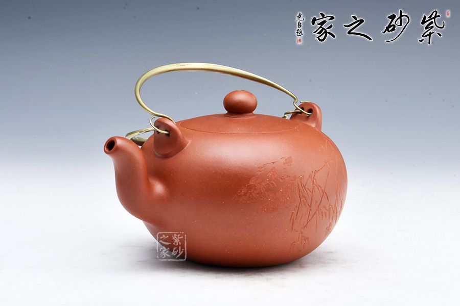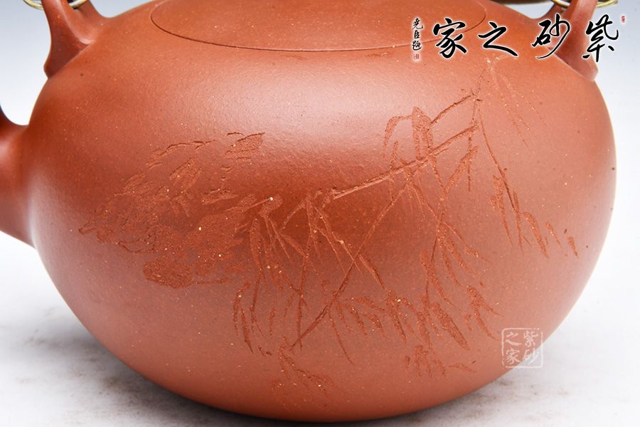 與傳統(tǒng)不同之處在于家里提梁,搭配550cc的容量,非常合適端握倒水。雙面刻繪更添文人氣,別具一格。