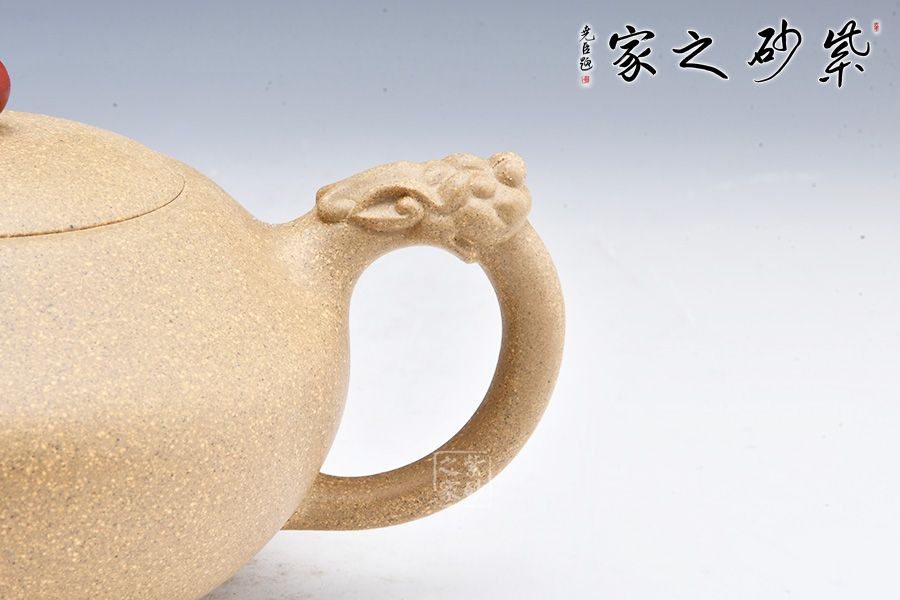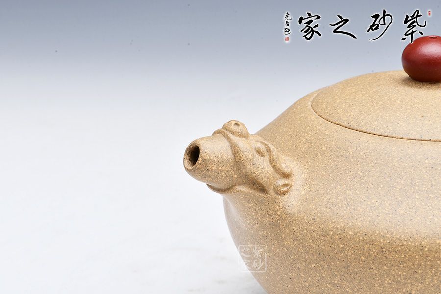 其壺身飽滿圓潤,壺嘴壺把呈龍吐水之形,彎流大氣,胥出利落自然;截蓋平薄工整,與壺身嚴(yán)絲合縫,氣密性極好;壺鈕為祥珠,寶氣十足,龍尾作把,曲度流暢,毫末之間精致入微,瑞意滿滿。