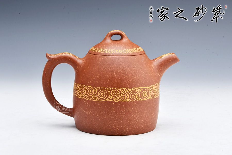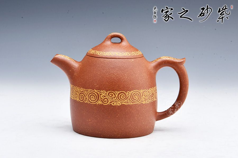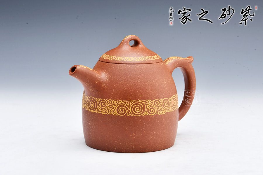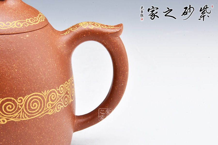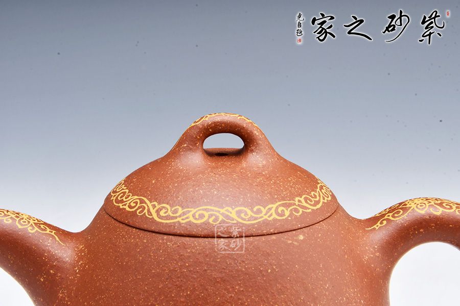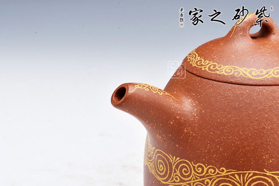 整款壺極其簡練、古樸,橋鈕壓頂,與壺身形態(tài)相應(yīng)和;可以看出鈕狀略平,顯內(nèi)斂、沉穩(wěn),正切合秦權(quán)古韻。此壺壺身、壺嘴、壺把及壺蓋處描金,平添華貴之感,整體簡潔而大方,喜歡的壺友不妨細賞一番!