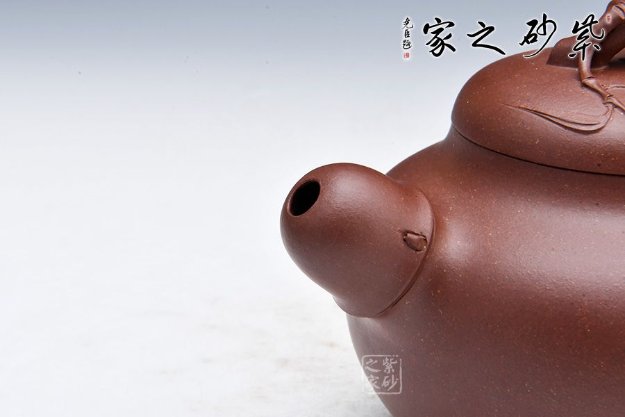 飽滿渾厚的壺身配以古樸的粗壺嘴和壺把,有何道洪風格,造型統(tǒng)一,以竹節(jié)為型。壺把胥出一支竹葉貼花。壺壓蓋自然如玉,壺鈕與竹相應,淡雅自然。整體生機盎然,造型立體,裝飾逼真富有生趣。