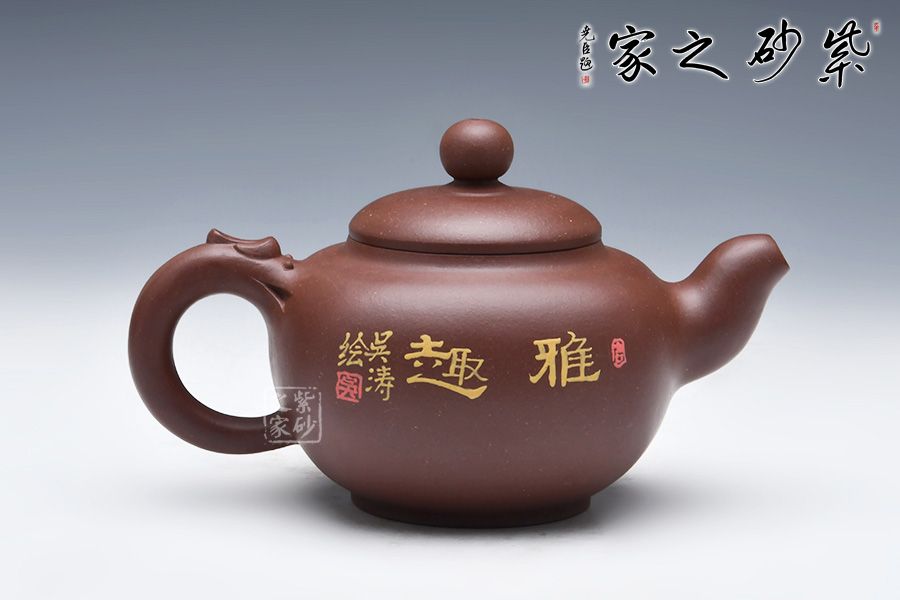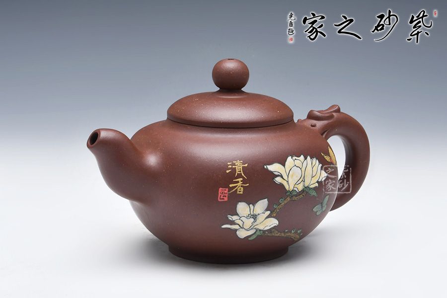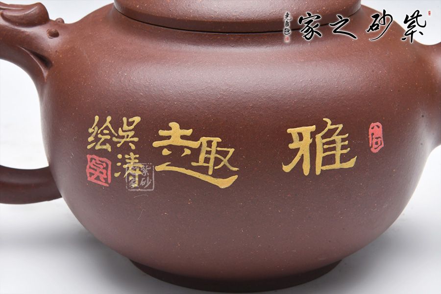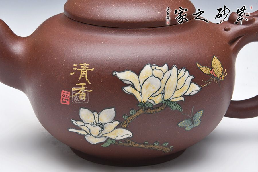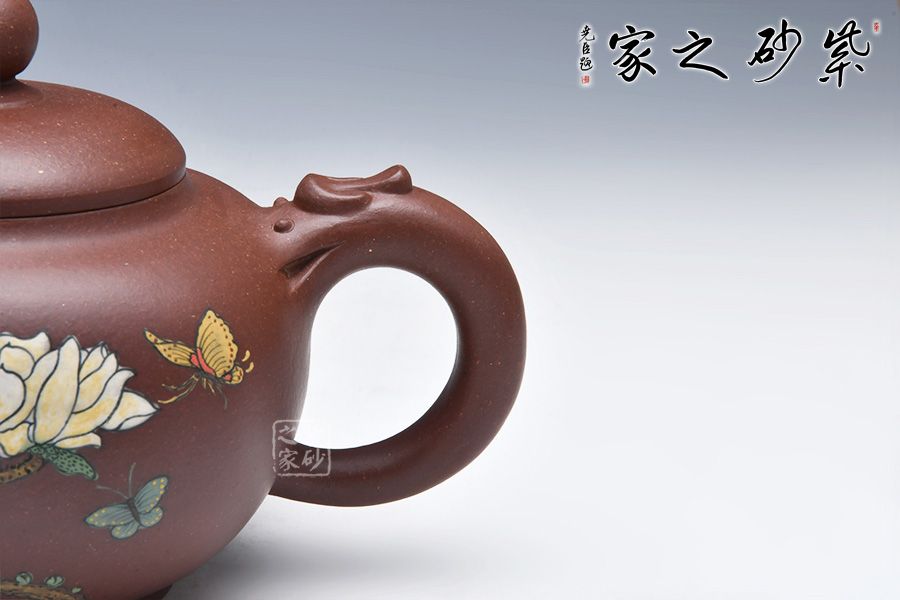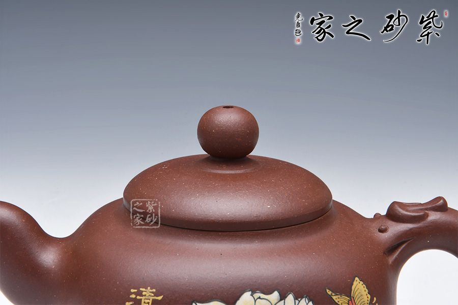 此壺圓中寓方,彎流紐皆采用暗接手法,彎流,耳形把上裝飾有龍,壺蓋咬合嚴密,上有珠形紐。壺身彩繪,惟妙惟肖,無論形體輪廓,還是結(jié)構(gòu)比例都恰如其分,造物造境,都經(jīng)得起長久玩味,充滿藝術(shù)魅力。