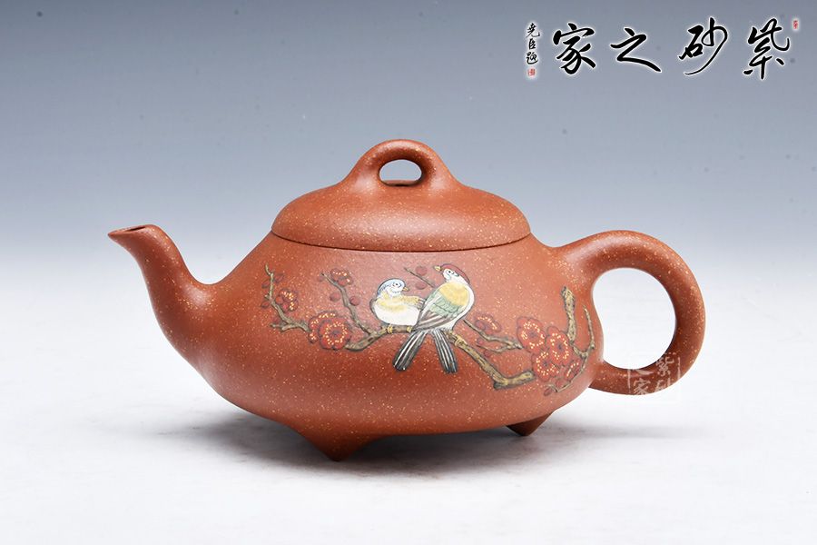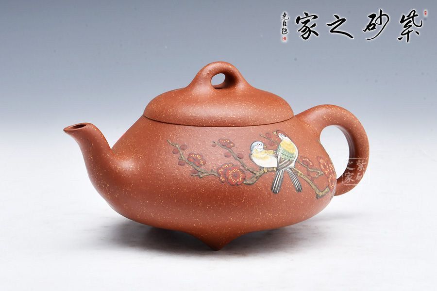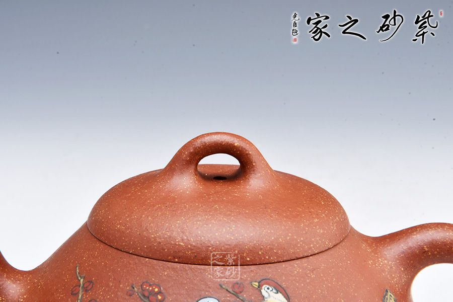 此款漢棠石瓢造型簡潔,壺身略扁,呈圓臺(tái)形,寧靜中彰顯雍容之勢(shì)。橋型鈕精致典雅,截蓋與壺身為一體,似天工自然削成。彎流蜿蜒而出,耳形把,握持舒適。壺底三個(gè)小尖足支撐起整個(gè)器型,雙面繪制,又添精致,值得賞藏。