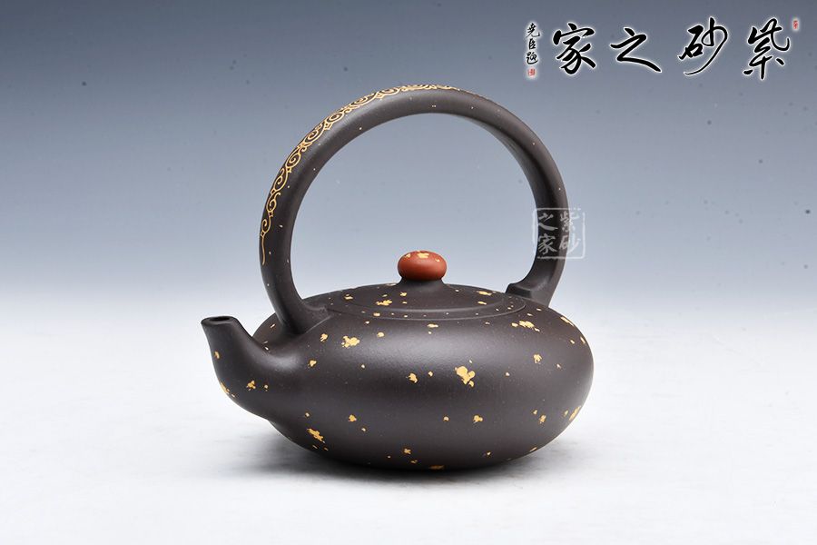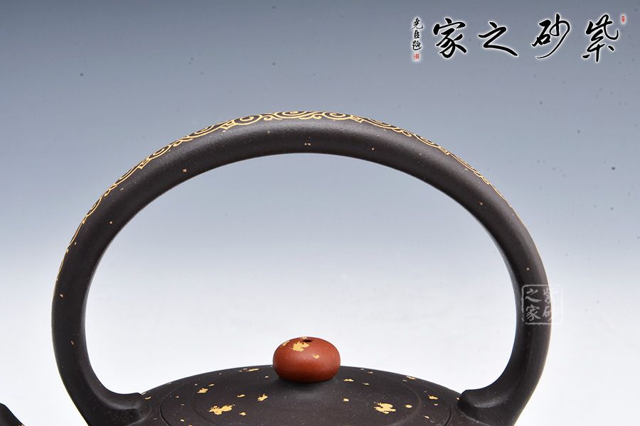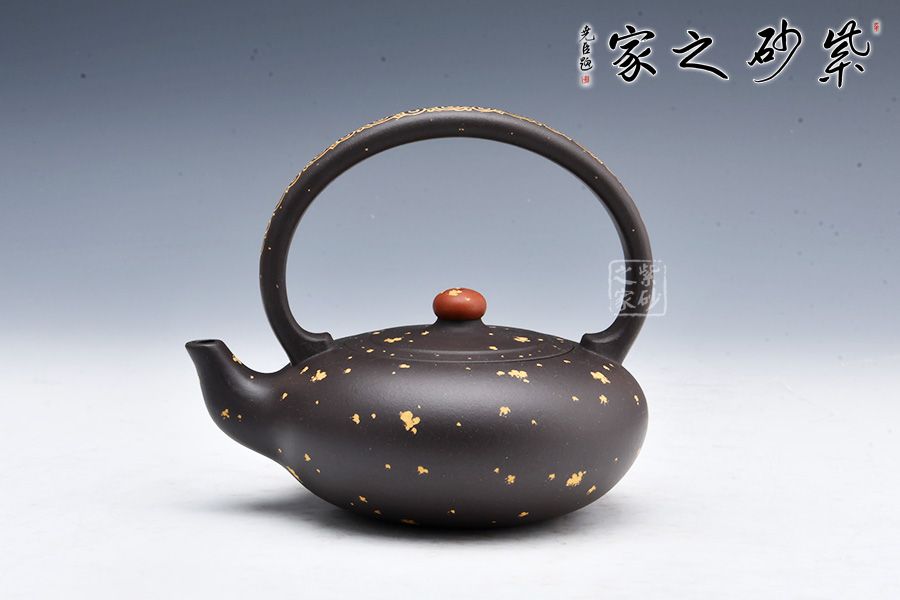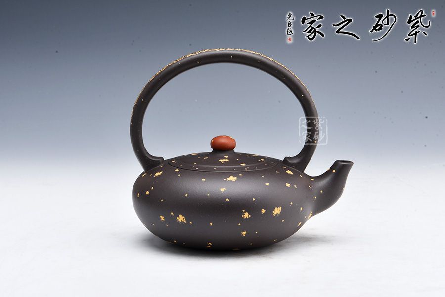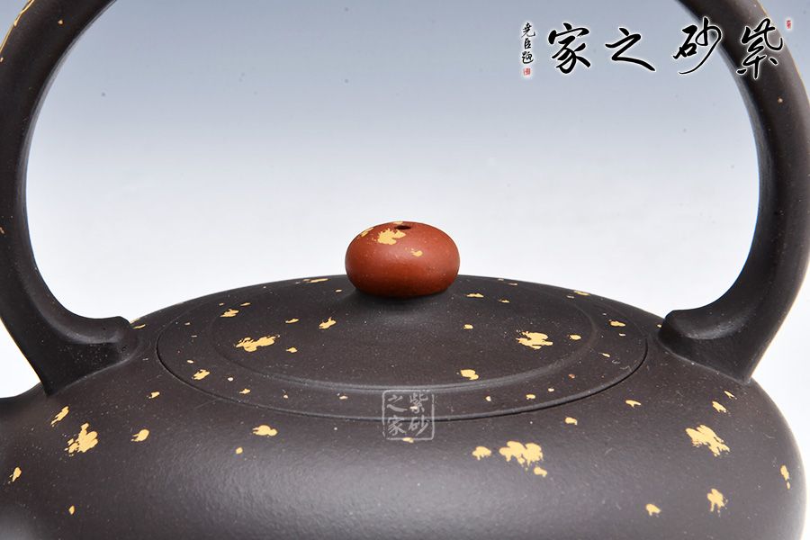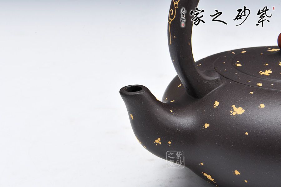 這款提梁壺,質(zhì)感極為細(xì)膩,且富有一股厚重的神秘感,壺的點(diǎn)睛之處便是紅珠壺鈕,整體殷實(shí)又不失雅致,色澤帶著一股古樸的味道,造型極致簡(jiǎn)約,壺身又極致飽滿圓潤(rùn),壺身造型呈橢圓形,歉蓋設(shè)計(jì),恰似無(wú)縫相接,氣密性極佳;暗接壺嘴呈牛角狀蜿蜒向上,出水勁道有力,一彎?rùn)E圓形的大提梁橫貫半空,氣勢(shì)雄渾,壺身撒金,增添華貴之感,值得珍藏。