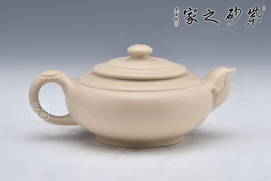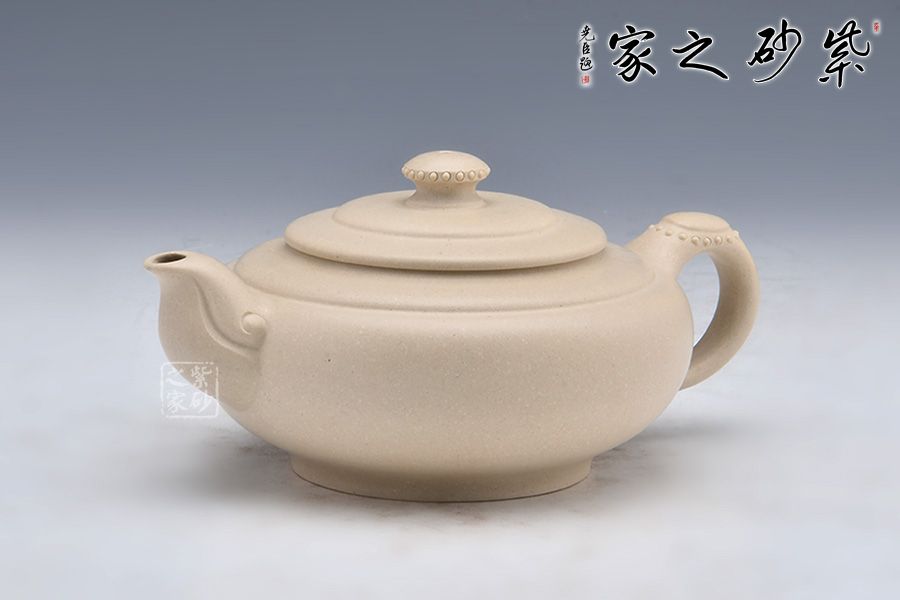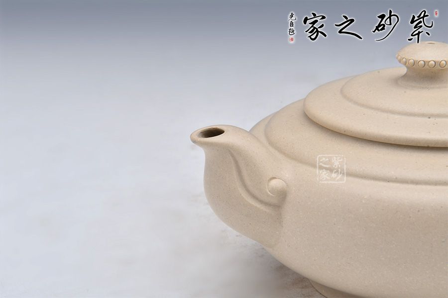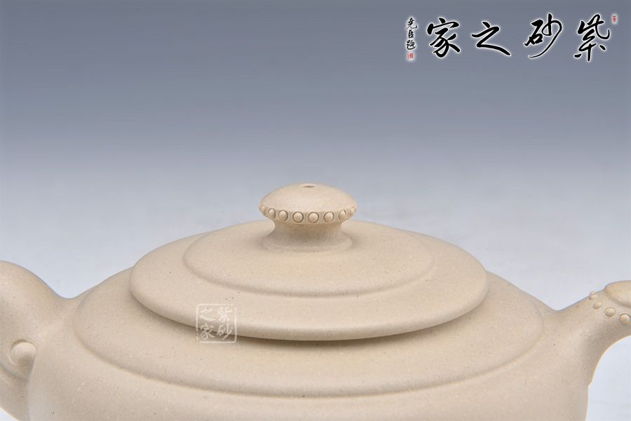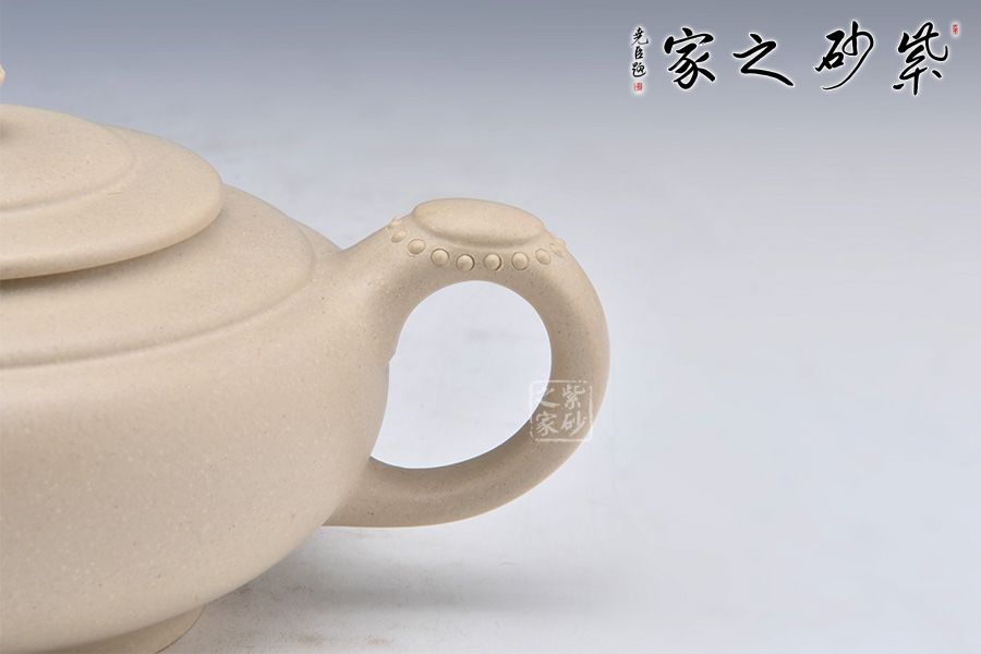 壺身呈扁圓形,折腹圈足。曲流,環(huán)狀柄,柄上有方寸之地可安放拇指,見匠心獨運。壓蓋式,圓壺鈕,蓋部及肩部均以凹線分割空間,自上而下觀之,有“一環(huán)扣一環(huán)”之感。此壺氣韻流暢自然,精氣神婉約蘊藉,值得細(xì)細(xì)把玩體會!