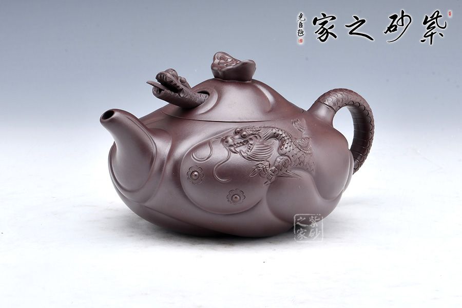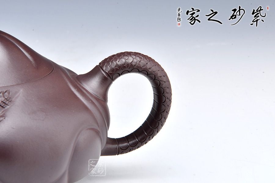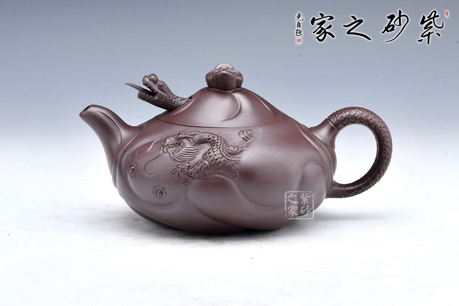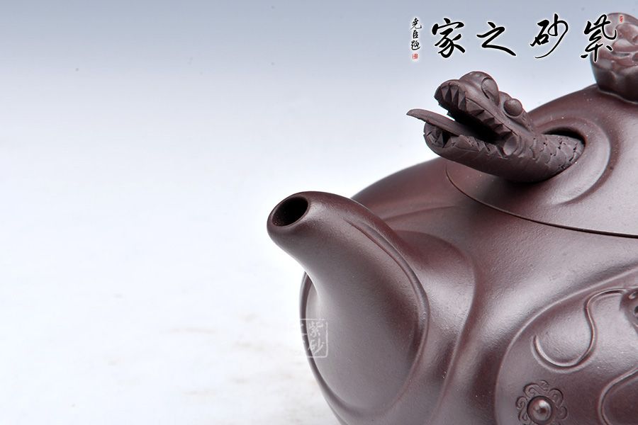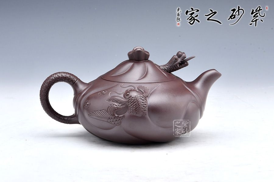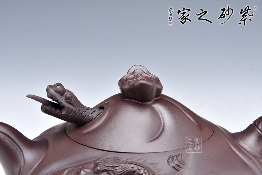此壺選用紫羅蘭精制而成,質(zhì)地細(xì)膩,泥色瑩潤雅致。壺身通體雕塑海水波紋,一面塑龍騰,一面塑鯉躍,神韻靈動(dòng)。壺蓋一龍首聳出云端,龍舌伸縮吐注,妙趣橫生,配以龍尾執(zhí)把,渾然一體。整壺形制豐滿,造型華美大方,線條流暢明快,刻畫精致細(xì)膩,極富藝術(shù)表現(xiàn)力,將魚躍龍門之姿描繪得栩栩如生,表以步步高升之美好寓意,實(shí)屬欣賞、把玩、實(shí)用之佳作,頗具收藏價(jià)值。