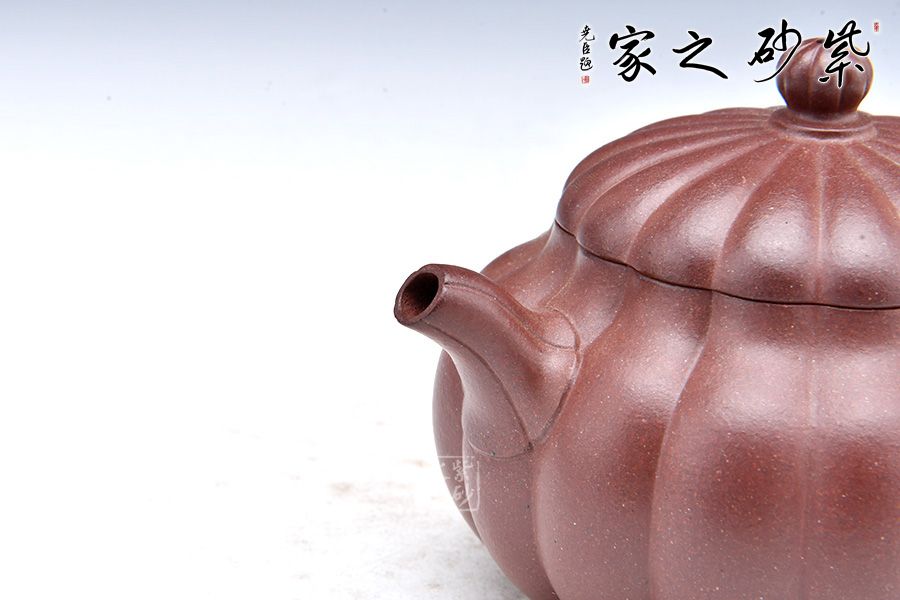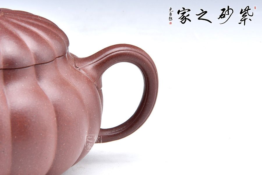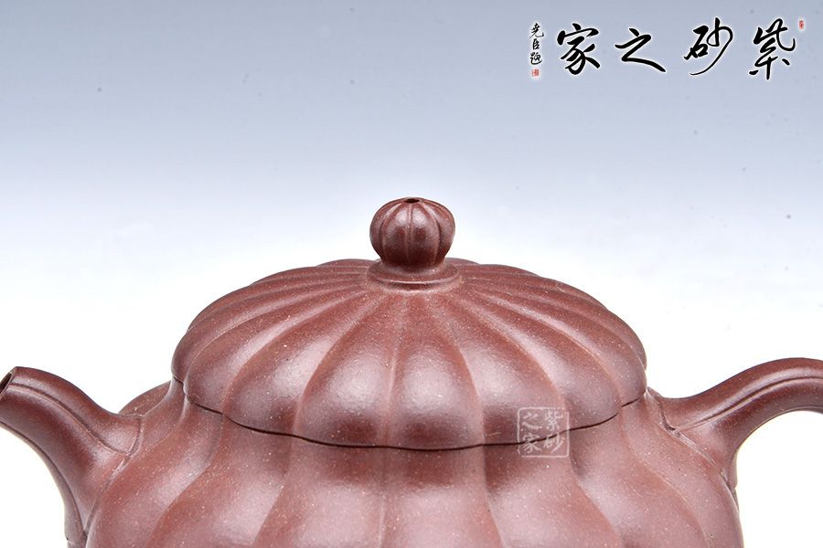 此壺為筋紋器,壺身等比例分割為多瓣菊蕾,熱烈盛放,彰顯秋日最后的那抹鮮亮生機(jī)。壺腹寬和飽滿,身上筋紋凹凸有致,正若菊瓣自然舒展之形,貼切入微。壺底加足,足的筋紋與壺身筋紋暗合,渾然一體。壺口縮攏,平蓋壓身,蓋上筋紋與壺身吻合,線條流暢;壺蓋制作規(guī)整,六瓣隨意扣壓均可與壺口精美吻合,整壺氣密性佳。俯視此壺,層層菊蕾依次綻放,美韻非凡!