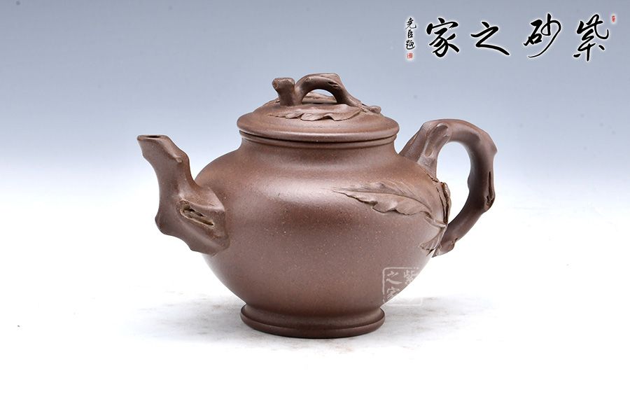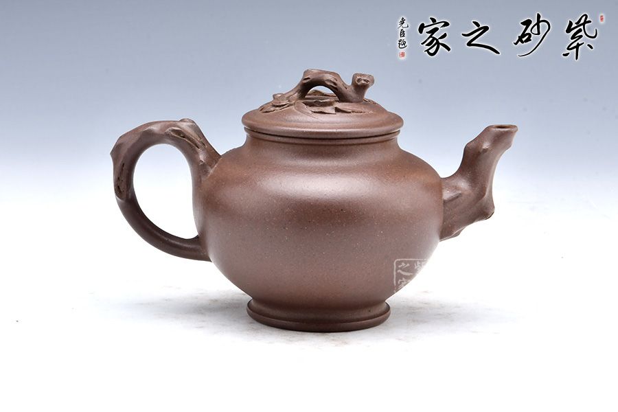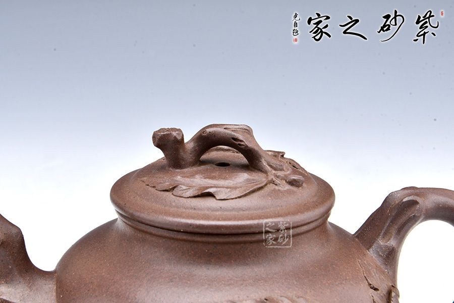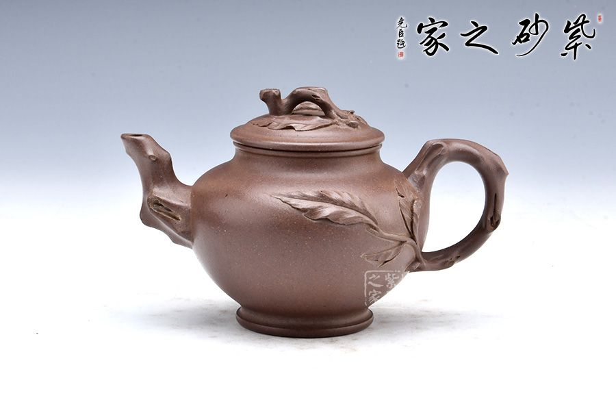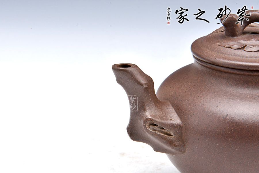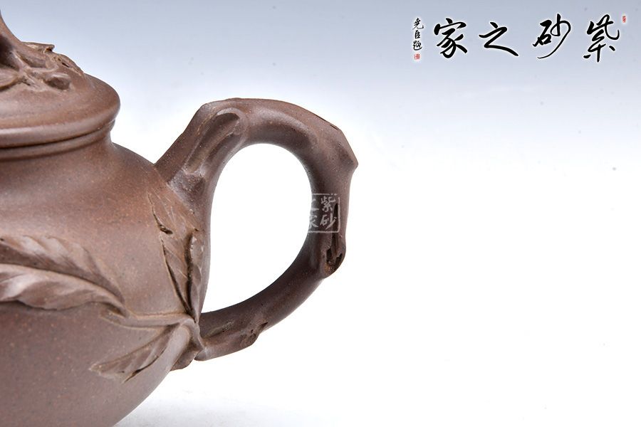 該壺以傳統(tǒng)造型為主狀態(tài),以桃入題,枝干蒼勁,果實豐滿,布局合理,結(jié)構(gòu)嚴(yán)謹(jǐn),古典中見現(xiàn)代創(chuàng)意,雅致中見精湛工藝。壺腹圓潤,飽滿精實,精工細(xì)膩無雕琢痕跡。粗桿做嘴,細(xì)枝為把,桃結(jié)是的,桃葉舒展,小桃一、兩顆,秀雅有神。顯得神采奕奕,愉悅可喜。 報春之意體現(xiàn)在壺嘴的桃枝、壺身一枝隨風(fēng)搖曳的桃葉、壺蓋的枝干紋飾上,報得春意不須萬花遍叢,也不似一枝梅暗自開放,“俏也不爭春,只把春來報,待到春花爛漫時,它在叢中笑”;而是幾片嫩葉,幾顆小桃,于枝頭悄悄的生長。渾厚的褐紅色壺身把桃樹的古樸和春天的喜慶表現(xiàn)的淋漓盡致,雅致出塵!