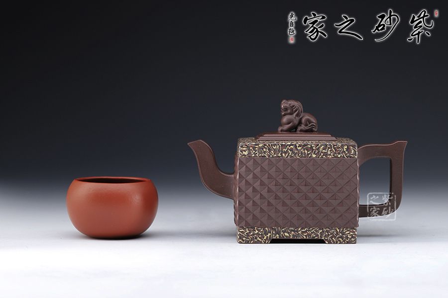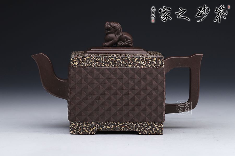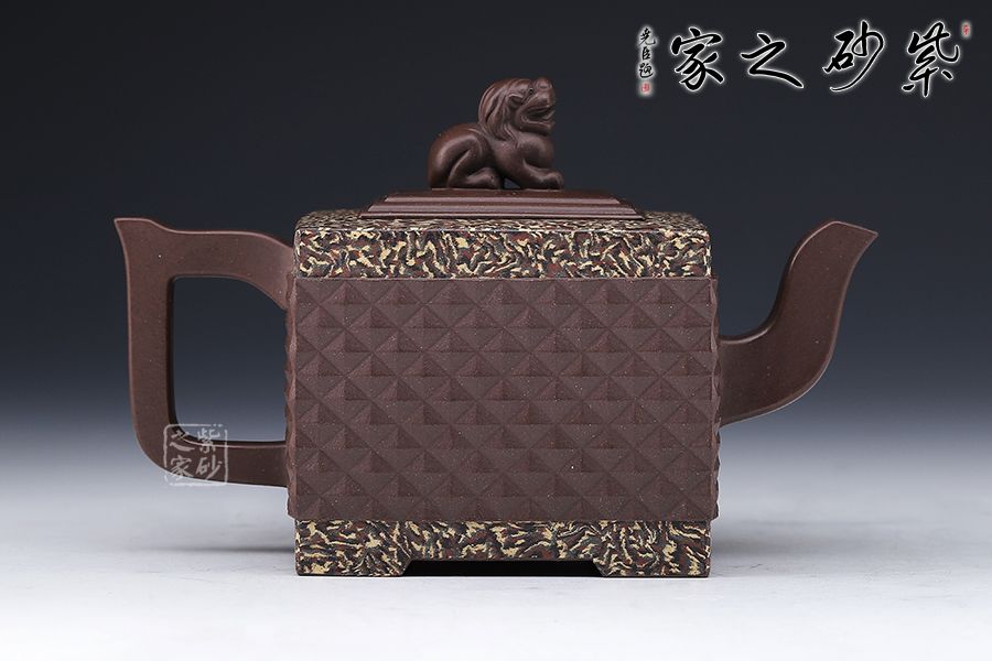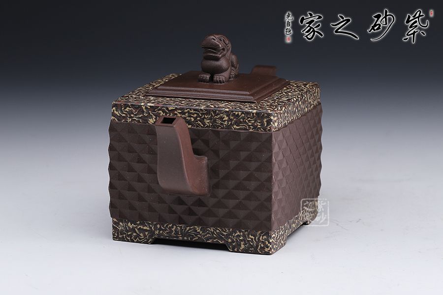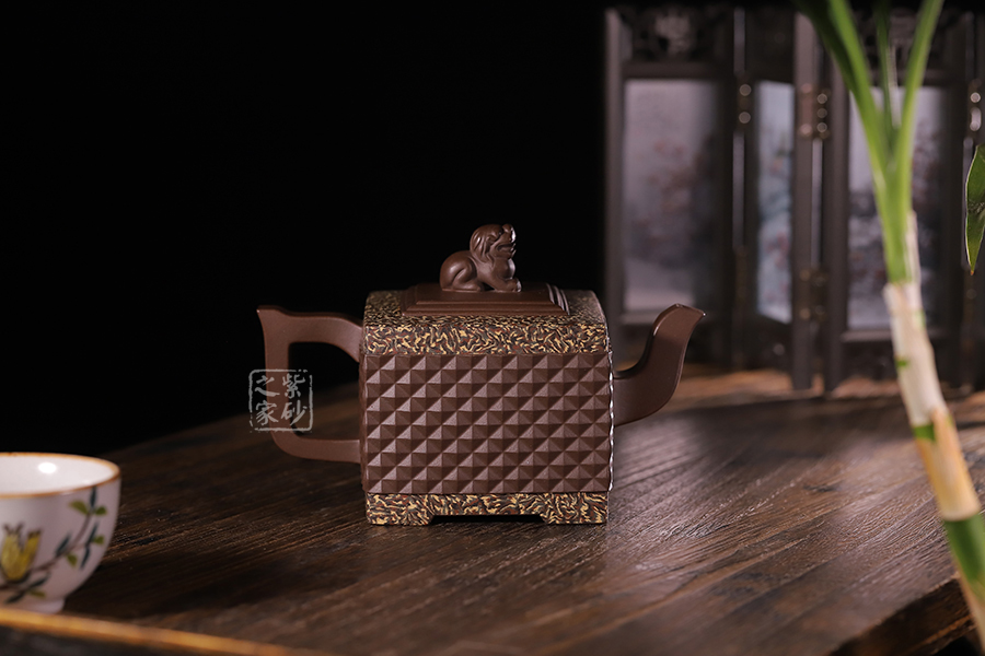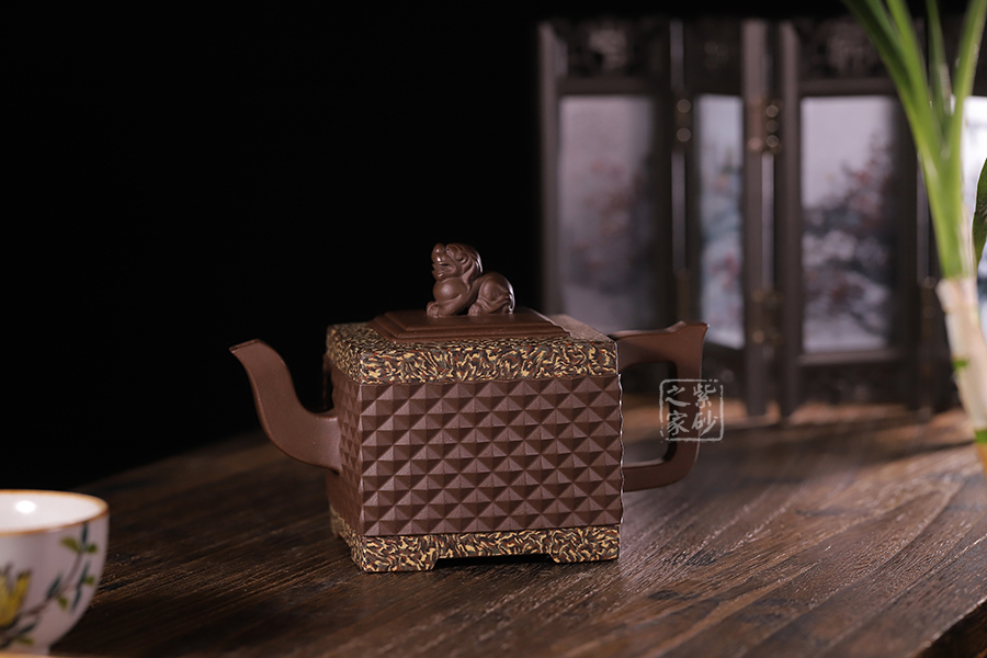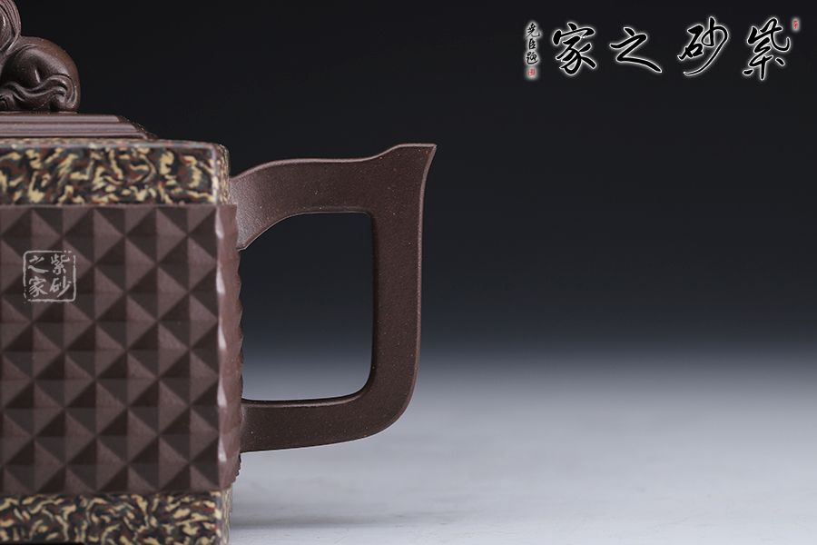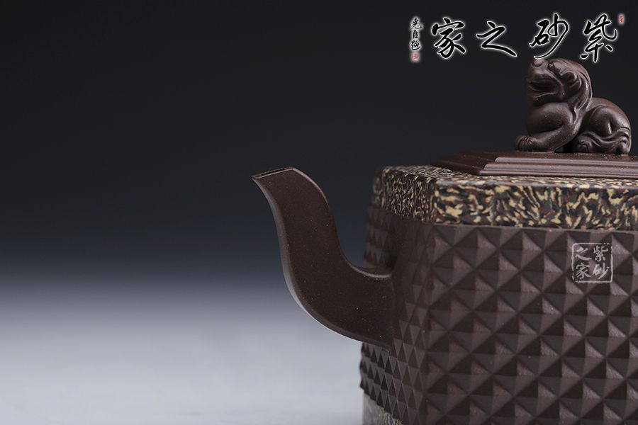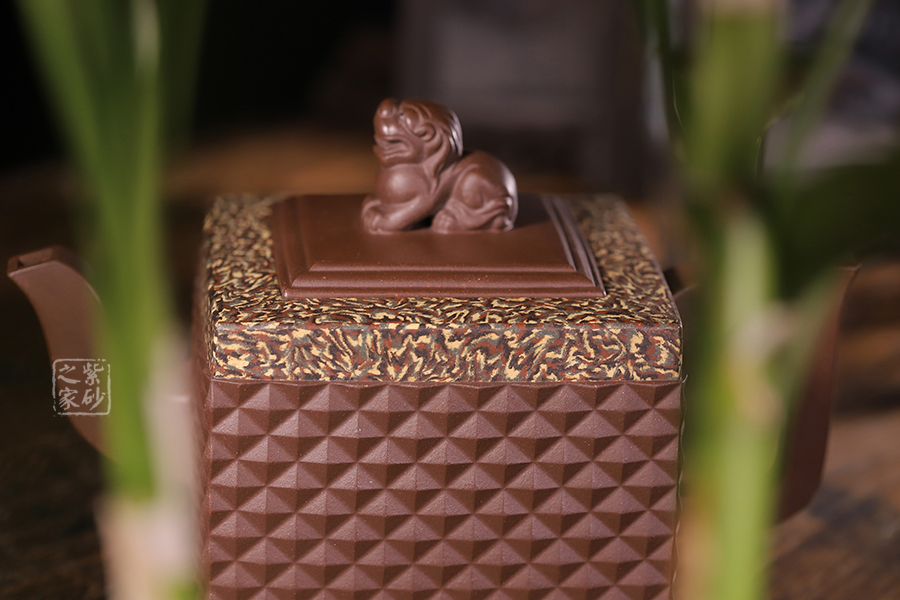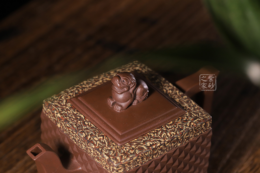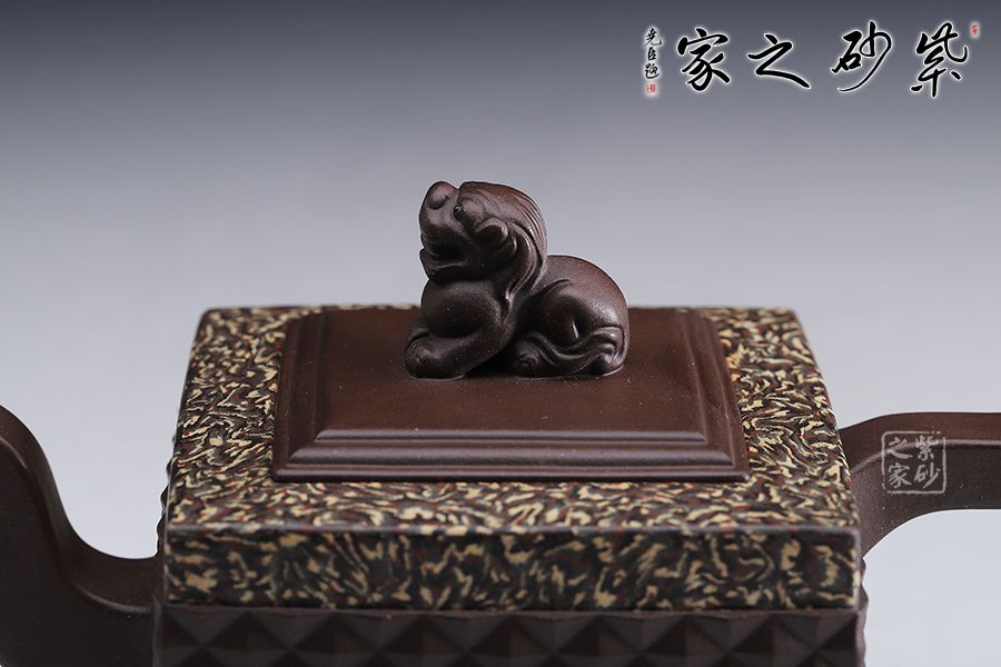 此《鉆獅壺》秉承了孔小明老師一貫的大氣風(fēng)格,以我國古代的鎮(zhèn)宅瑞獸作為創(chuàng)作主題。整壺以四方定型,線條剛正硬朗,壺把與壺嘴照應(yīng)壺身,做成方形,一掃陰靡纖弱之風(fēng)。