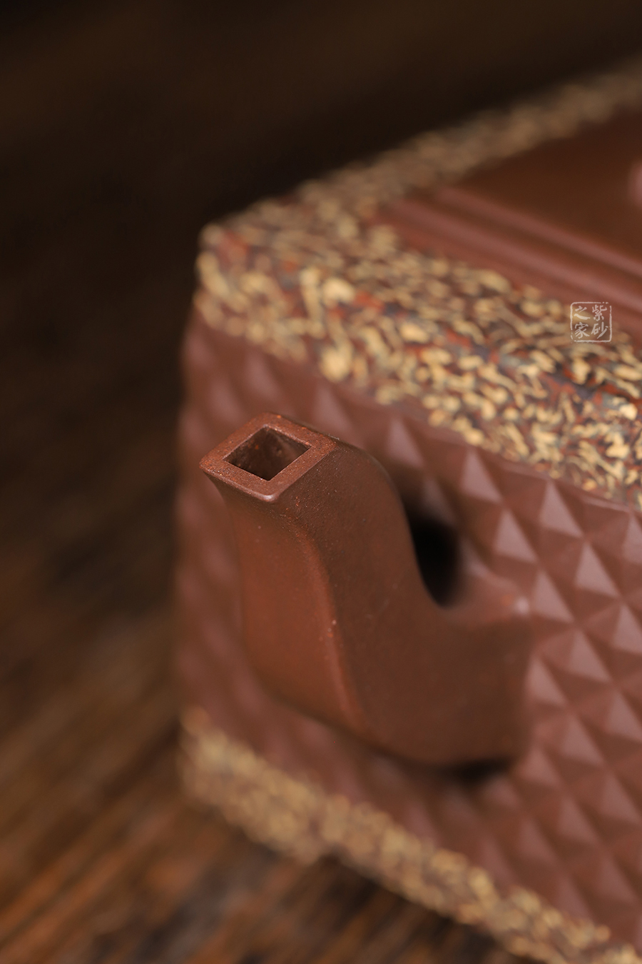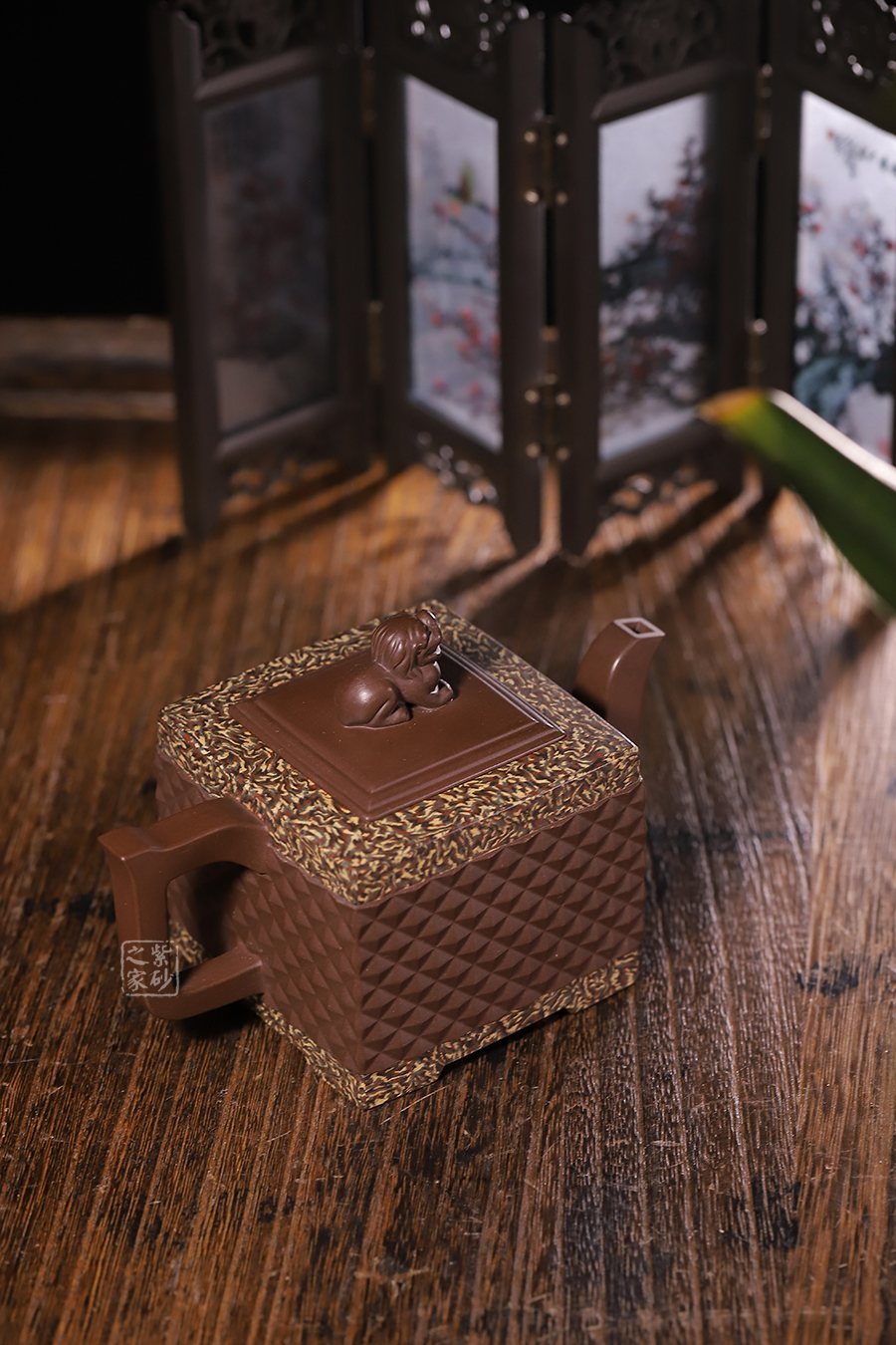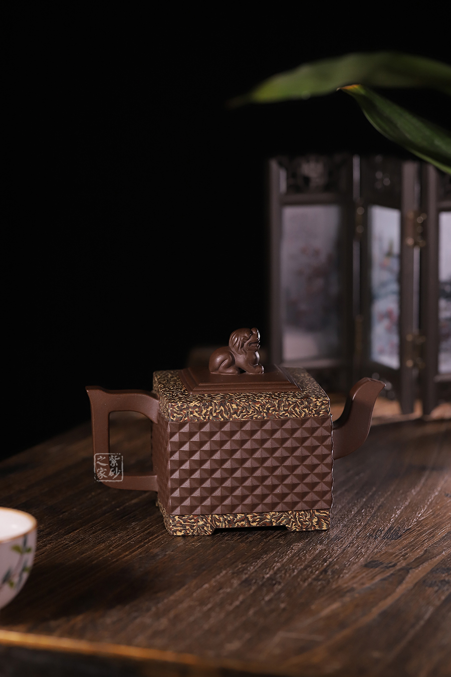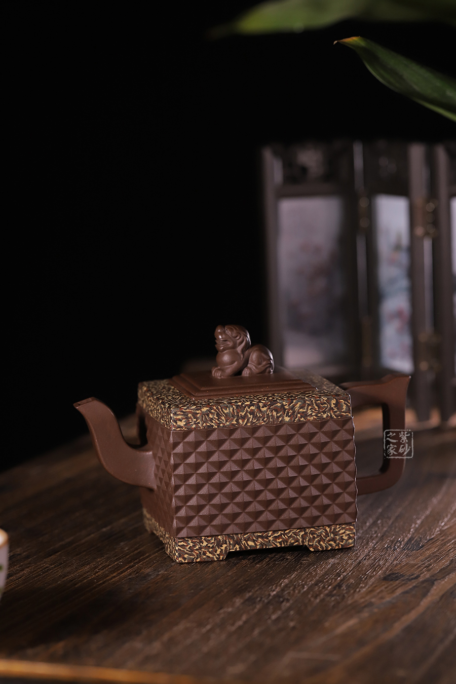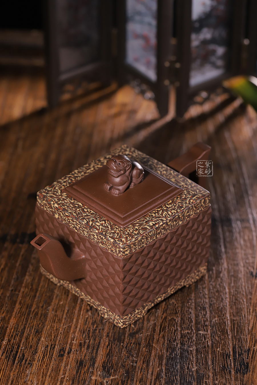 此《鉆獅壺》秉承了孔小明老師一貫的大氣風(fēng)格,以我國古代的鎮(zhèn)宅瑞獸作為創(chuàng)作主題。整壺以四方定型,線條剛正硬朗,壺把與壺嘴照應(yīng)壺身,做成方形,一掃陰靡纖弱之風(fēng)。