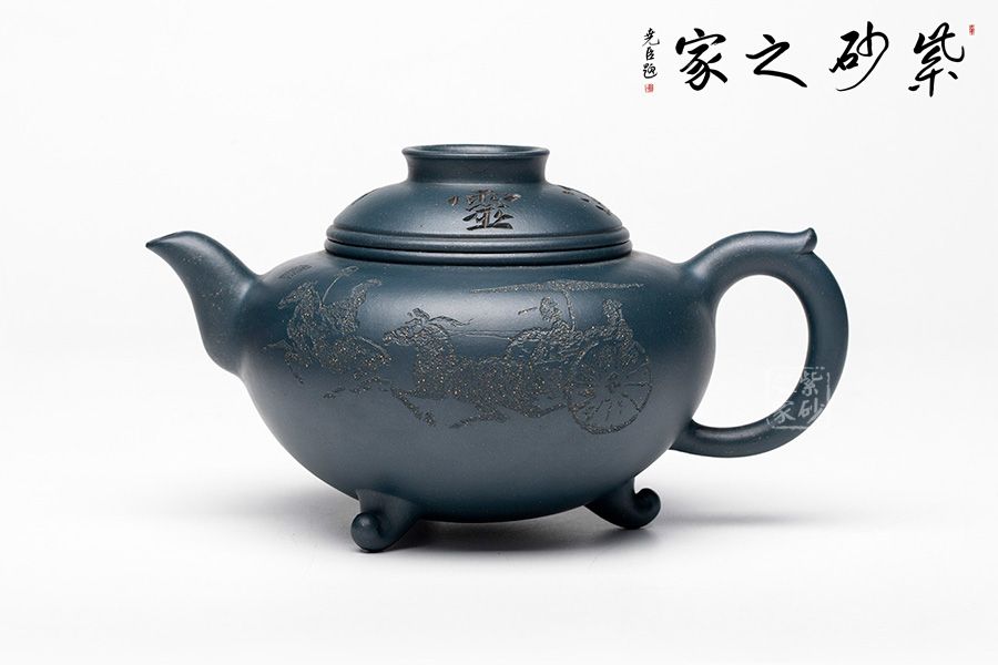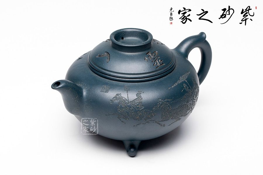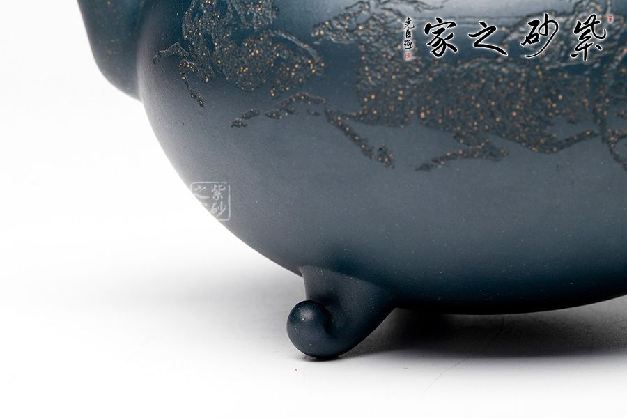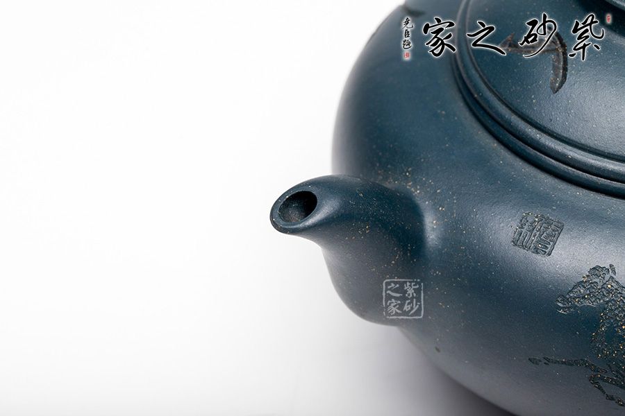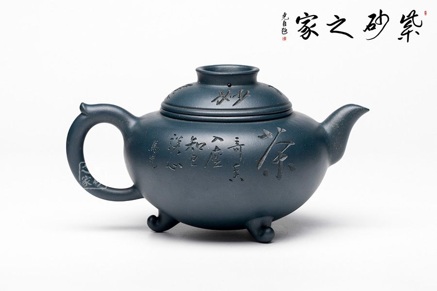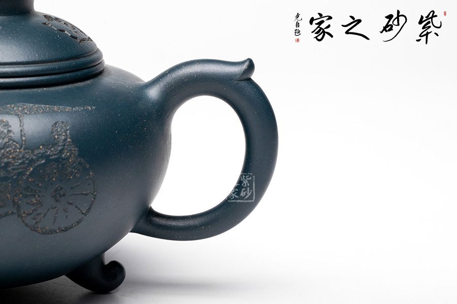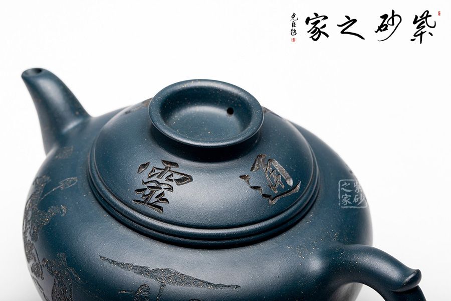 本壺整體圓潤大方,壺腹飽滿隆圓,不顯腴膩。壺蓋設計精巧,呈半圓狀與壺身妙若天成,渾然一體,壺蓋上刻“妙入通靈”力道深刻。壺嘴順延而出,優(yōu)美自然,飛把設計與壺嘴兩相呼應,飄逸靈動。壺底三足的設計給整壺增添了輕靈之感,搭配清新淡雅的色澤,使人望之快逸。