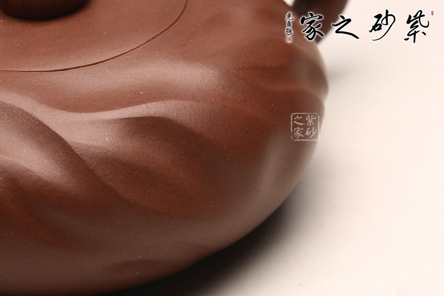 此壺個(gè)性化色彩濃厚,手工捏制,傳統(tǒng)成型,以不規(guī)則的褶皺融合、包裹壺身,似火舌在猖狂舔舐、如烈焰在灼燒起舞,給人以熱烈激昂、迸發(fā)亢進(jìn)的藝術(shù)思考。壺嘴和壺把處銜接融洽,也似有烈火蜿蜒而過,留下火焰的足跡。蓋為嵌入式,口蓋吻合嚴(yán)密,嘴、把、紐、壺身渾然一體,婉轉(zhuǎn)流暢。壺鈕仿佛烈焰之心,紫焰皆團(tuán)簇、匯集此處。壺體褶皺紋起伏不一,粗獷自然,肌理細(xì)膩,壺流向上,有挺拔奮進(jìn)之意。