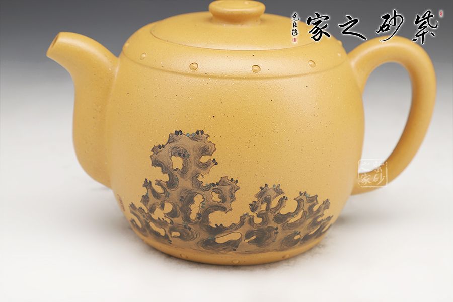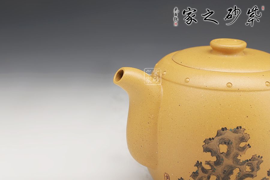 此壺將太極鼓融入紫砂壺中,展現(xiàn)中國傳統(tǒng)文化的非凡氣質和獨特內(nèi)涵,透露紫砂的精神內(nèi)涵和濃濃的東方韻味。作品壺身飽滿,似鼓,線條圓潤,彰顯太極文化的含蓄之美,壺嘴自腹向上胥出,圈把秀麗,壺鈕雕刻的陰陽太極圖,形成參透的人生境界,充滿傳統(tǒng)文化的氣息。底部、肩部乳釘紋裝飾與整個造型渾然一體,彰顯深厚古樸的韻味。