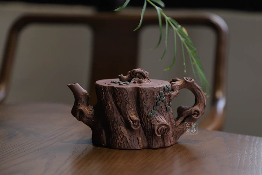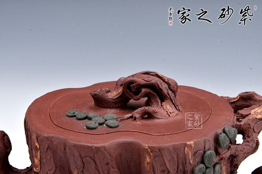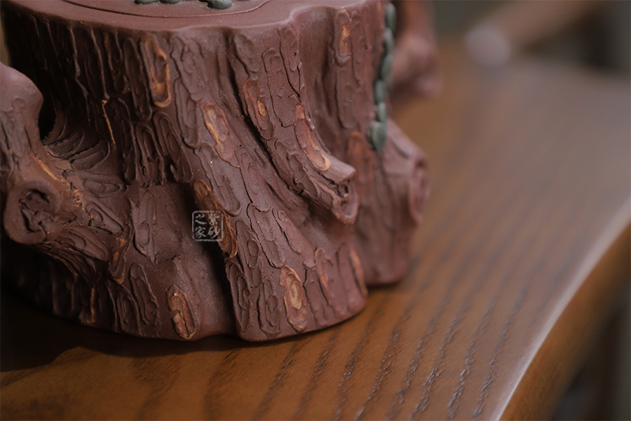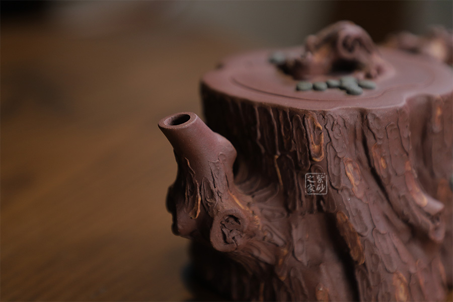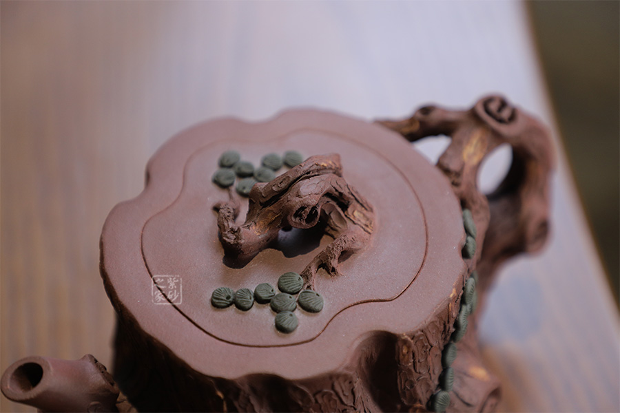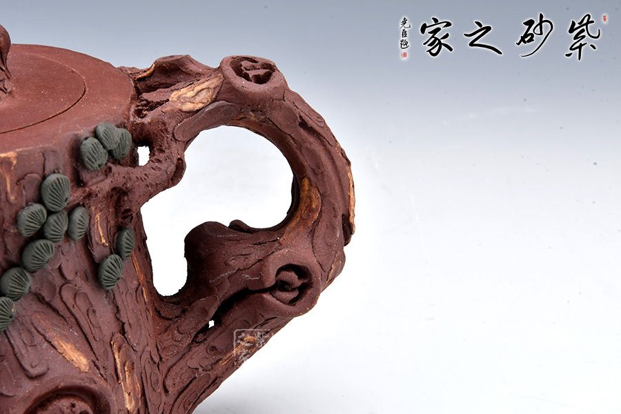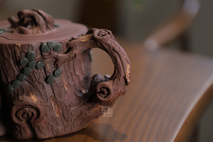 全器選用紫泥為胎,色澤顯得渾樸厚重、深沉淡雅。該壺通體作松樹樁形,樹皮剝落之處,斑駁嶙峋,惟妙惟肖。壺流與把手以松樹枝巧塑而成,枝干、樹癭刻劃精細(xì)入微,自然生趣。壺把處斜斜伸展出一截松枝,朵朵松針點(diǎn)綴,極其逼真。