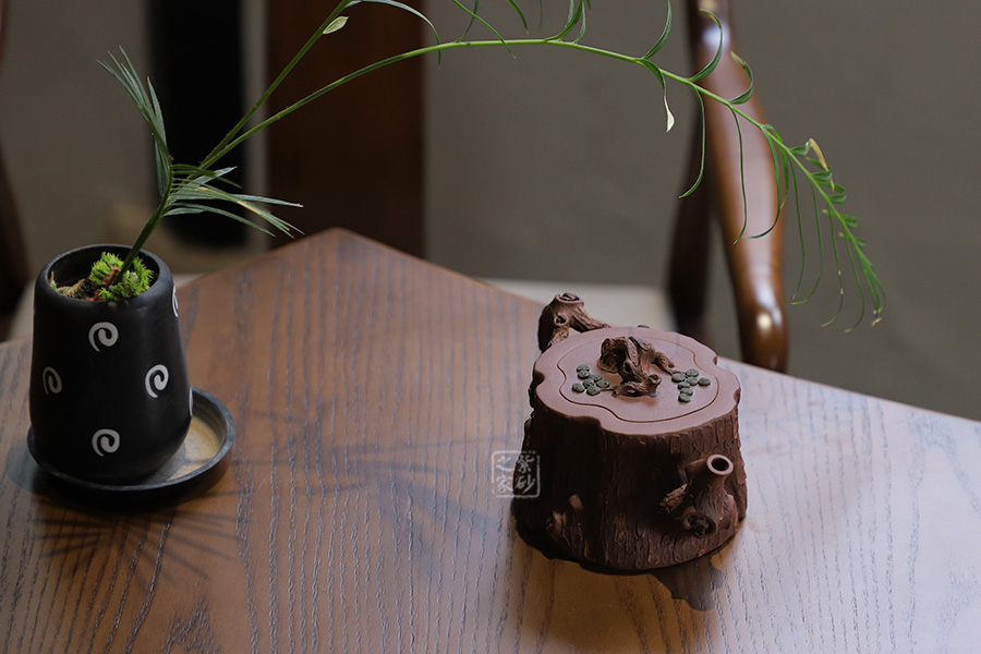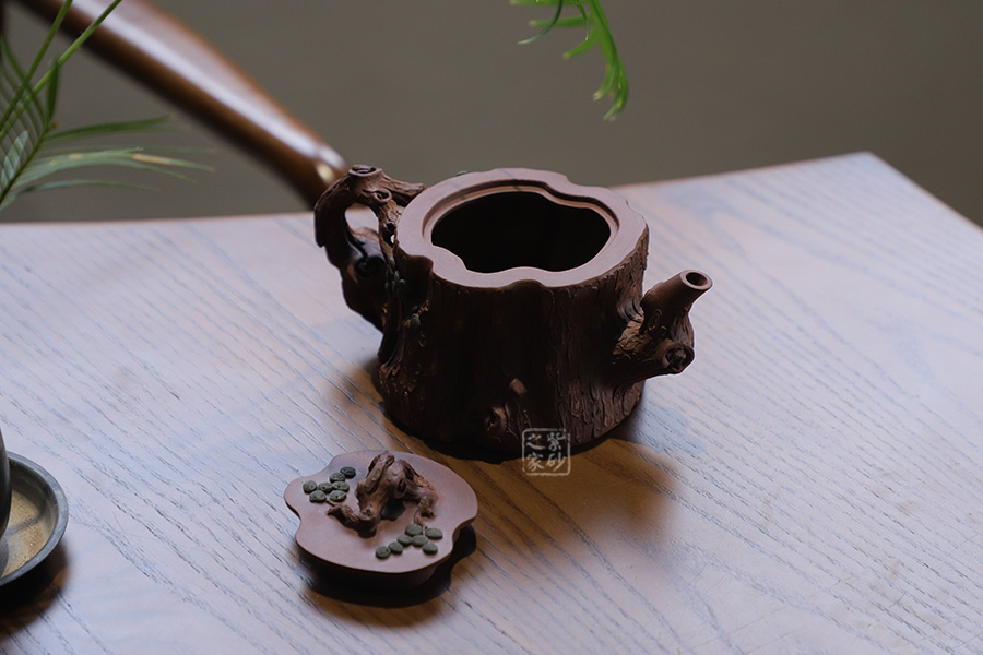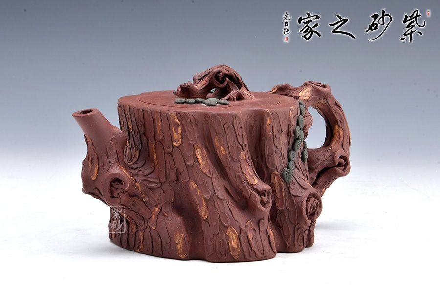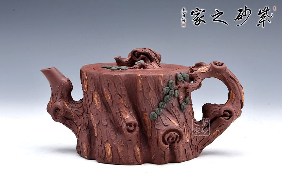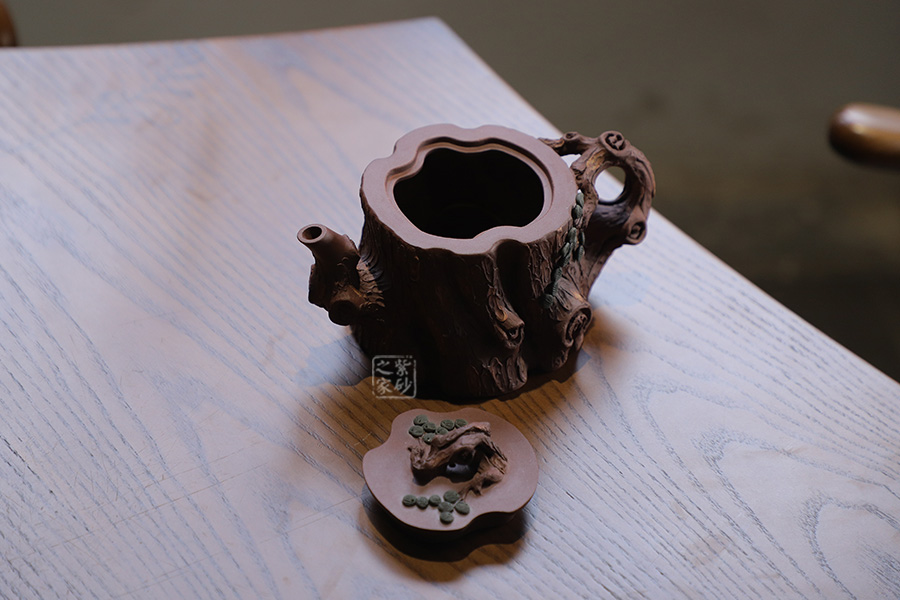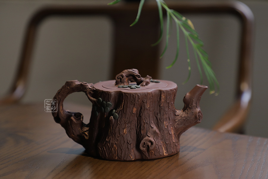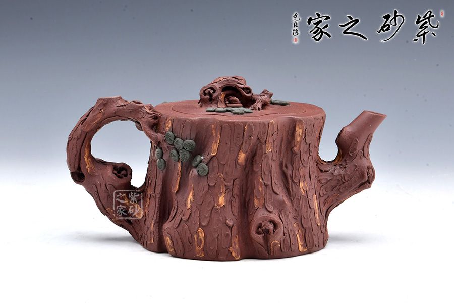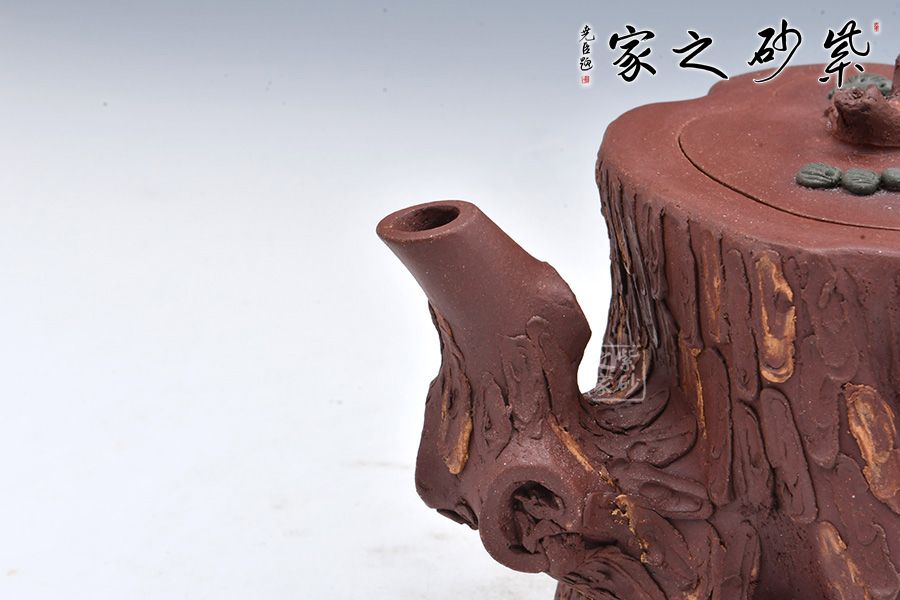 全器選用紫泥為胎,色澤顯得渾樸厚重、深沉淡雅。該壺通體作松樹樁形,樹皮剝落之處,斑駁嶙峋,惟妙惟肖。壺流與把手以松樹枝巧塑而成,枝干、樹癭刻劃精細(xì)入微,自然生趣。壺把處斜斜伸展出一截松枝,朵朵松針點(diǎn)綴,極其逼真。