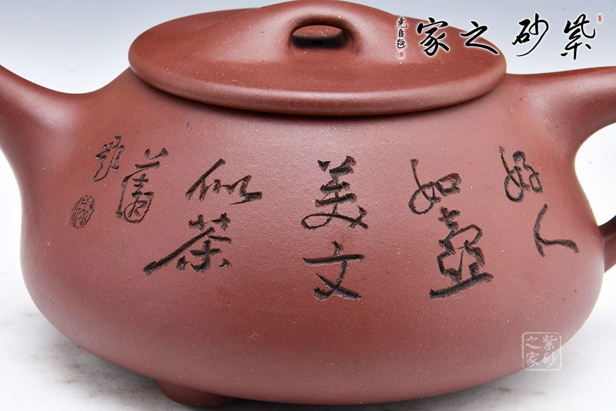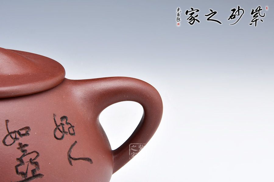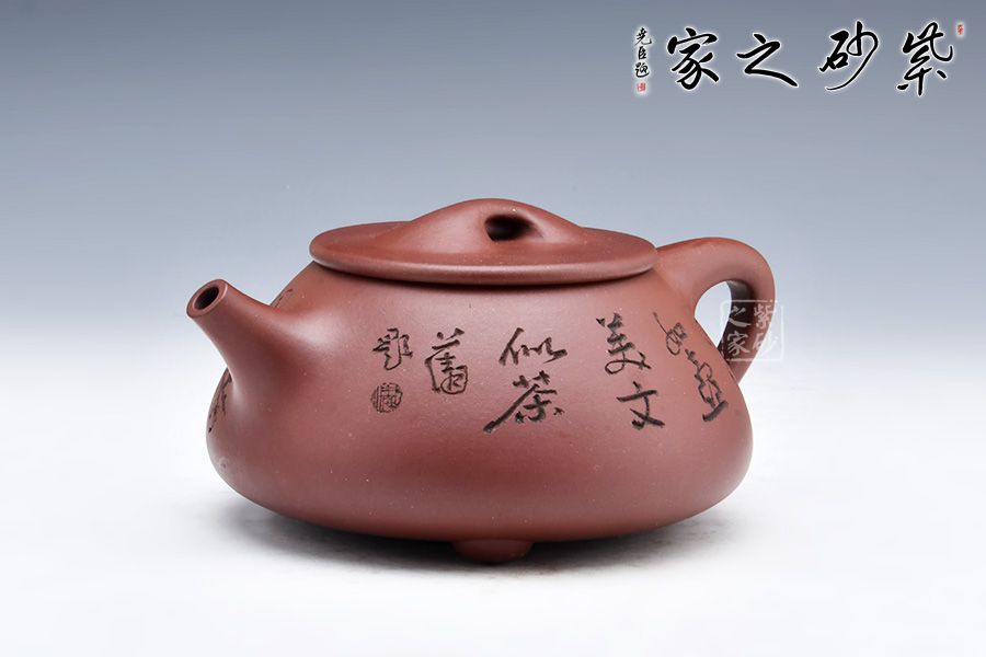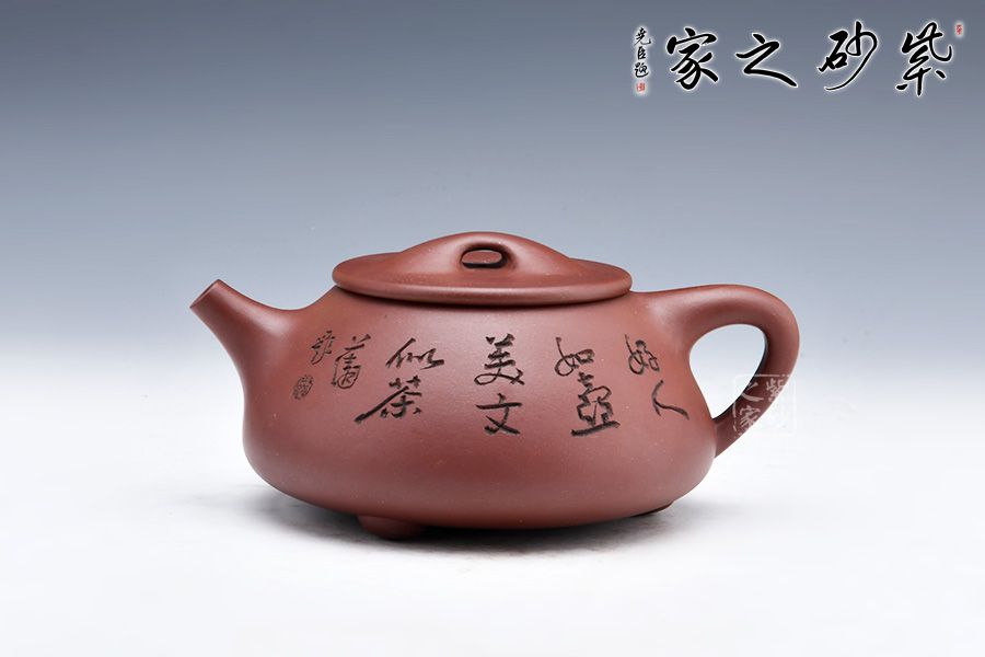 大滿瓢,經(jīng)典紫砂器形之一。壺身呈梯形,曲線柔和流暢,造型渾厚樸拙;釘足呈三角鼎立狀支撐,給人以輕靈而穩(wěn)重之感。壺嘴簡(jiǎn)潔見力度、壺把呈倒三角勢(shì),與壺身之型互補(bǔ),形成和諧的美學(xué)效果;平壓蓋及橋鈕干凈利索、比例恰當(dāng),充分體現(xiàn)出秀巧精工為上的特點(diǎn)。