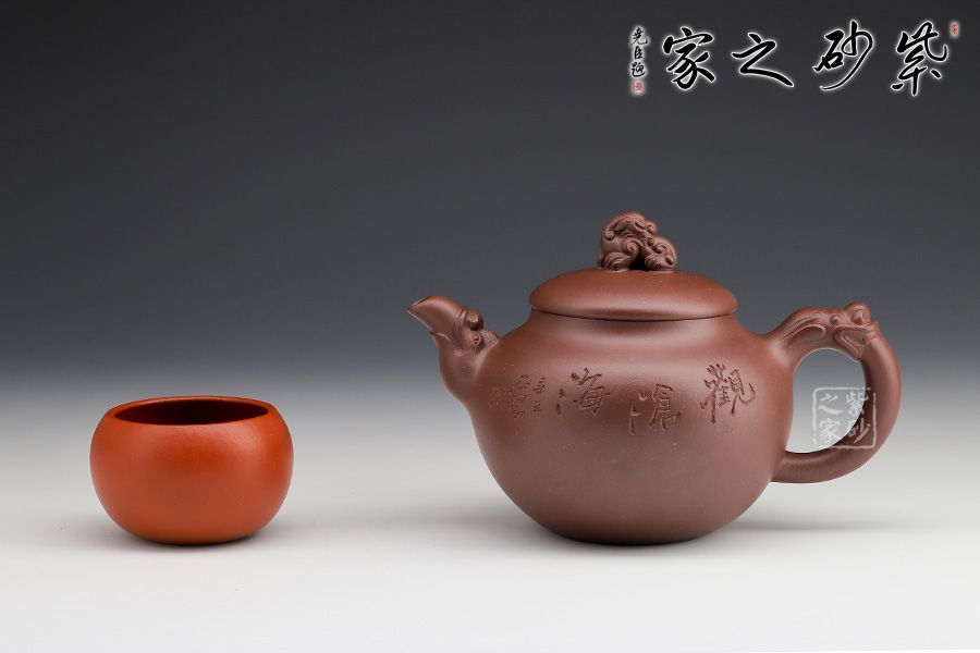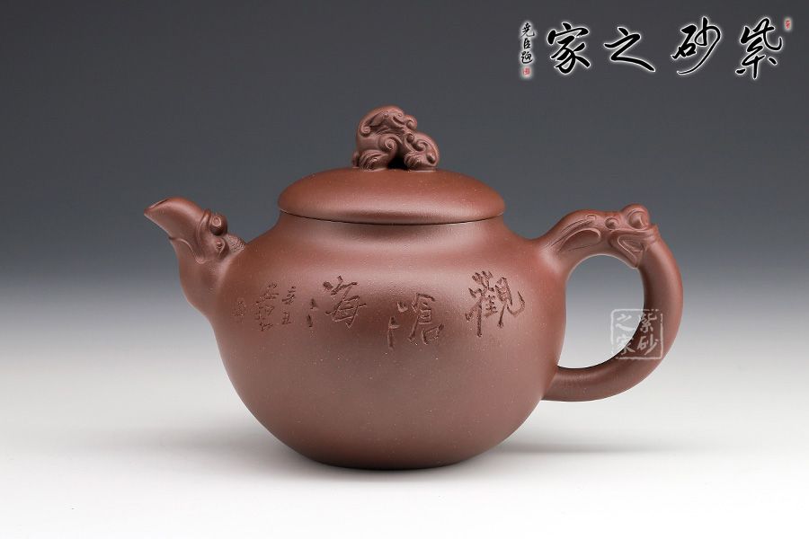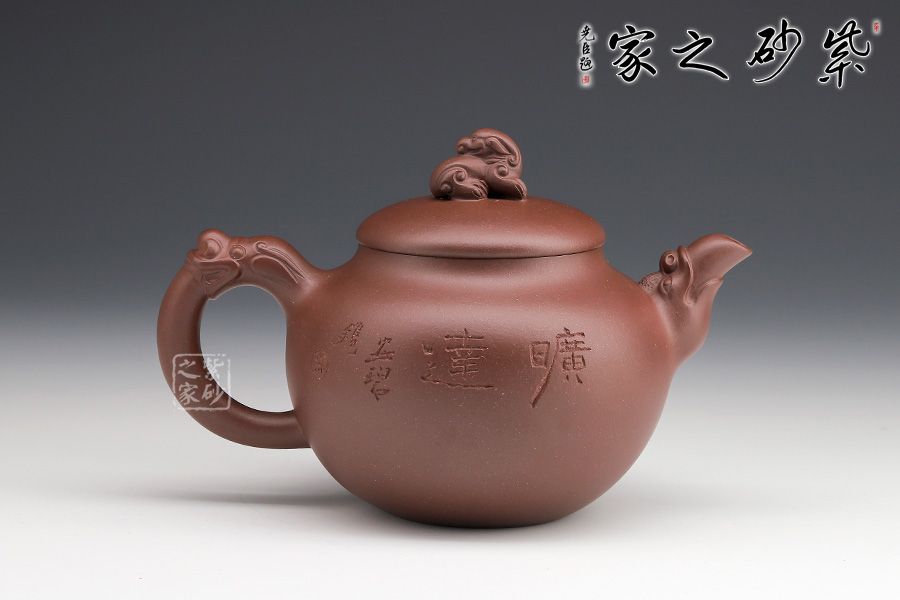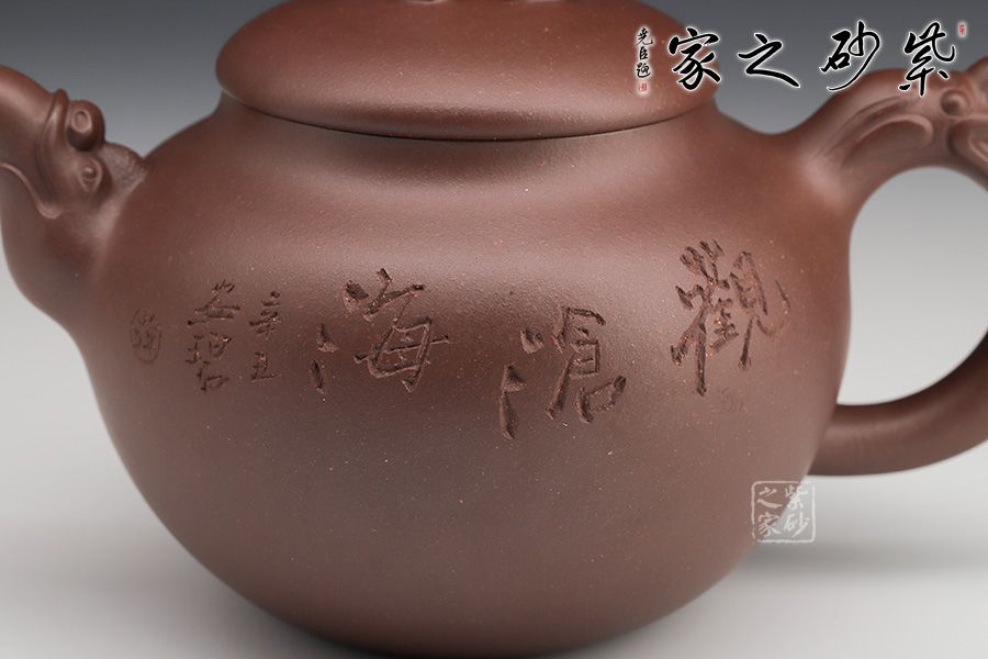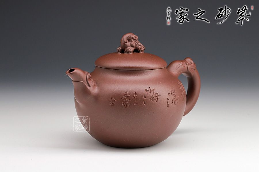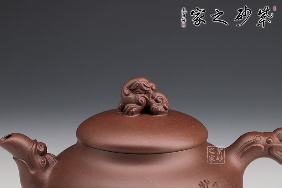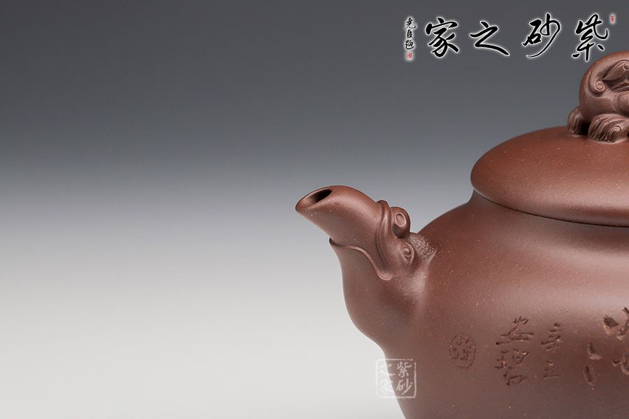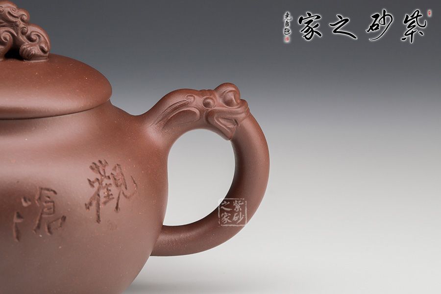 圓潤敦實(shí)的壺身,壺嘴壺把設(shè)計(jì)為龍嘴,曲線流暢,細(xì)節(jié)處處理精細(xì)。吸引人之處還有蓋面上的龍形鈕,自然別趣,且拿捏方便。