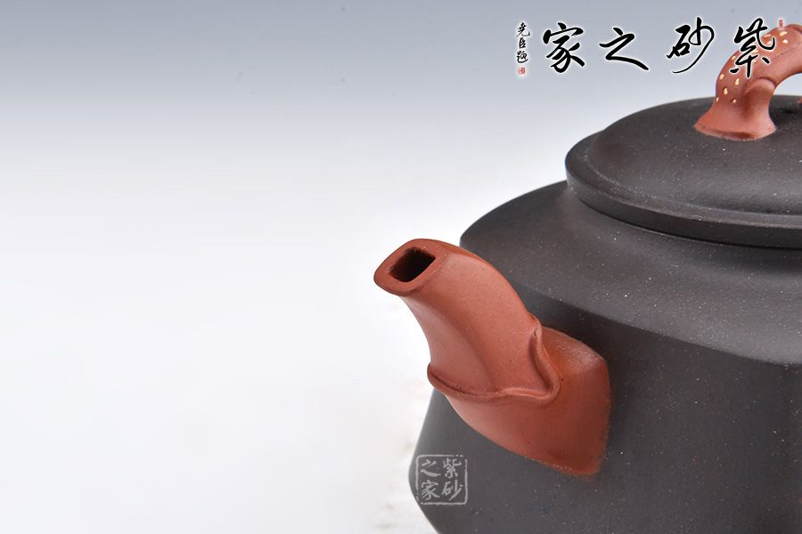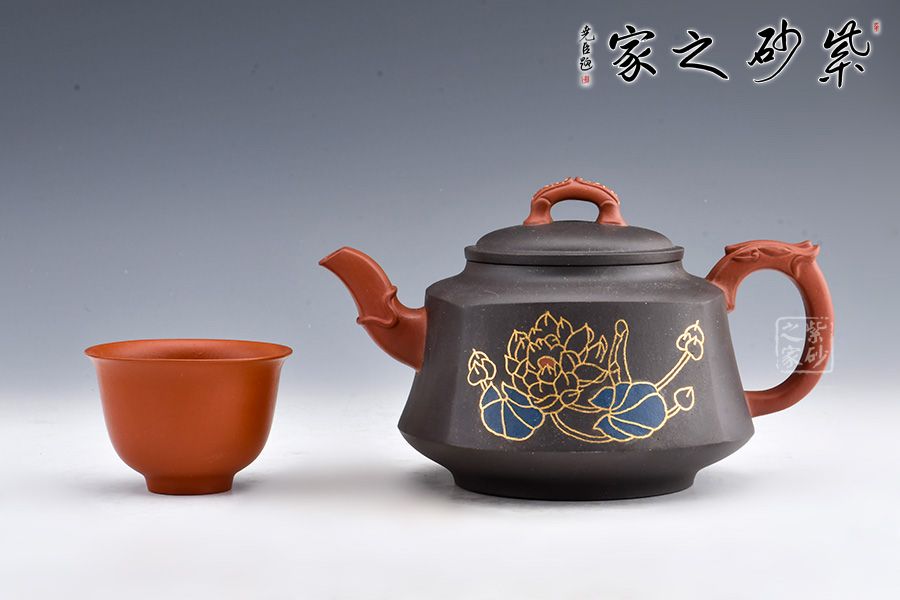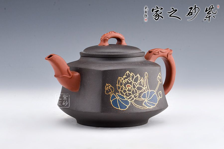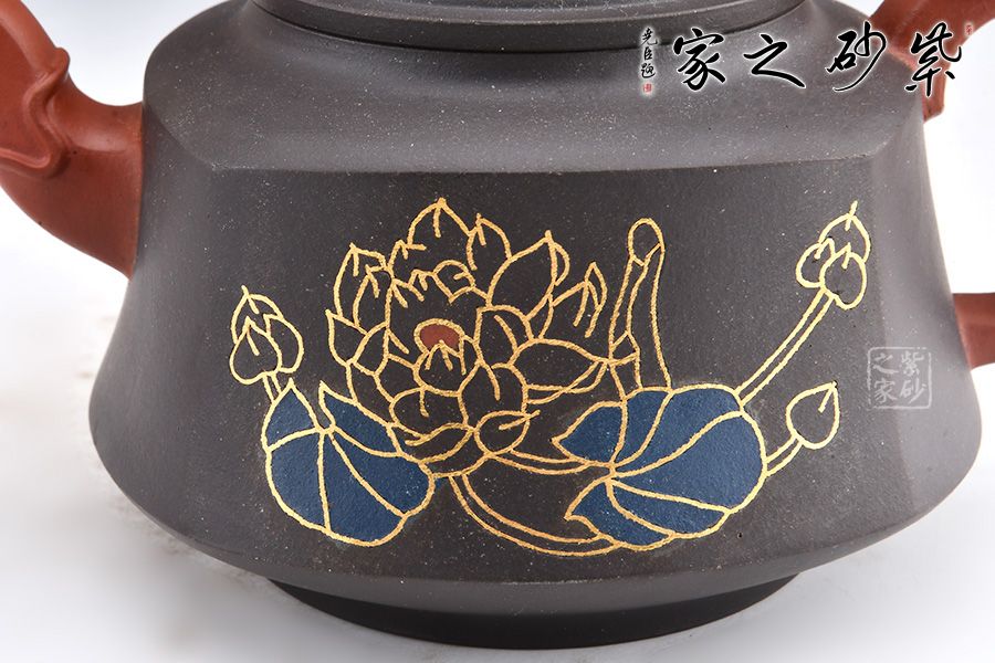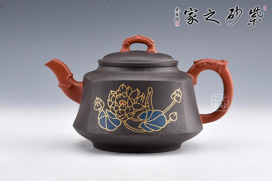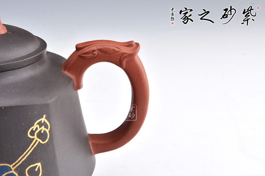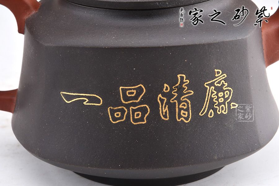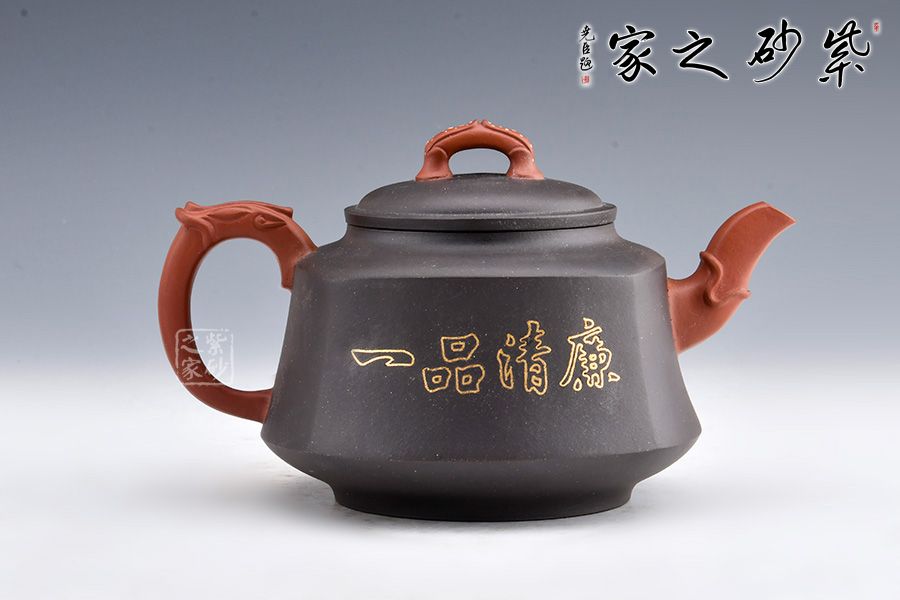 此壺壺身形態(tài)樸雅端莊,梯形漸變,足部平整。肩線以上到壺蓋分層過渡,沉墨內(nèi)斂巧妙,美感突出。壺嘴和壺把皆是方圓結(jié)合手法,壺嘴彎流粗細(xì)不同,龍形裝飾尤其古樸獨(dú)特。壺把飛出壺身,龍紋更加寫意自然。壺鈕似蓮花點(diǎn)點(diǎn),造型別致自然。鑲金手法裝飾對比深色壺身更顯耀眼,花朵鮮艷而字體古樸,正好“一品清廉”有感。