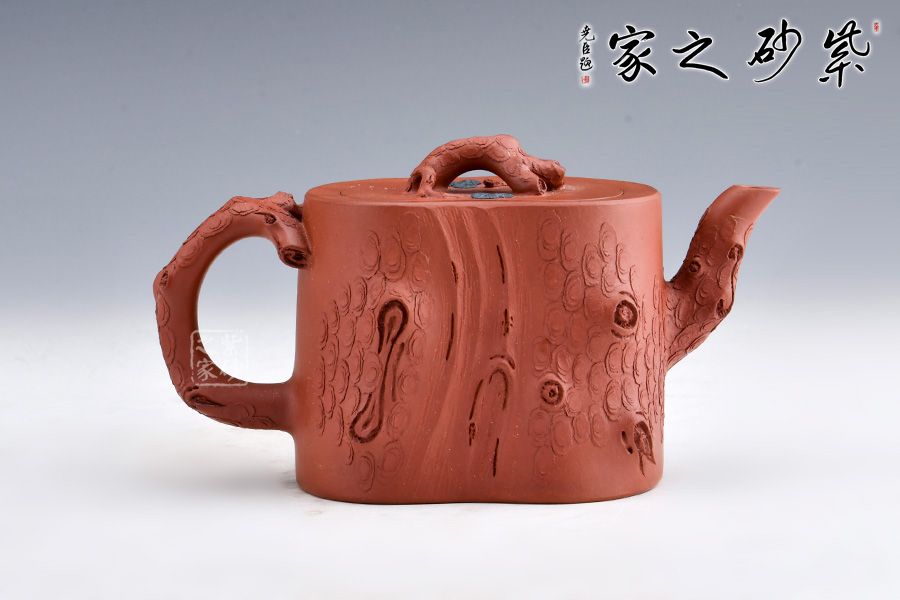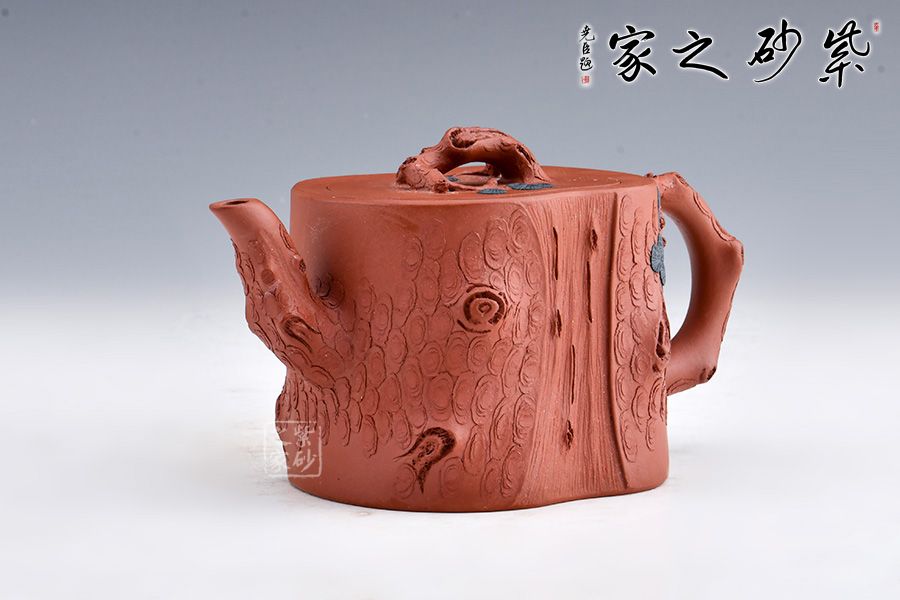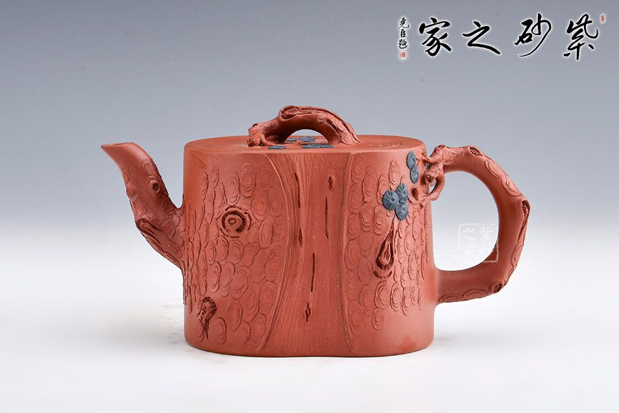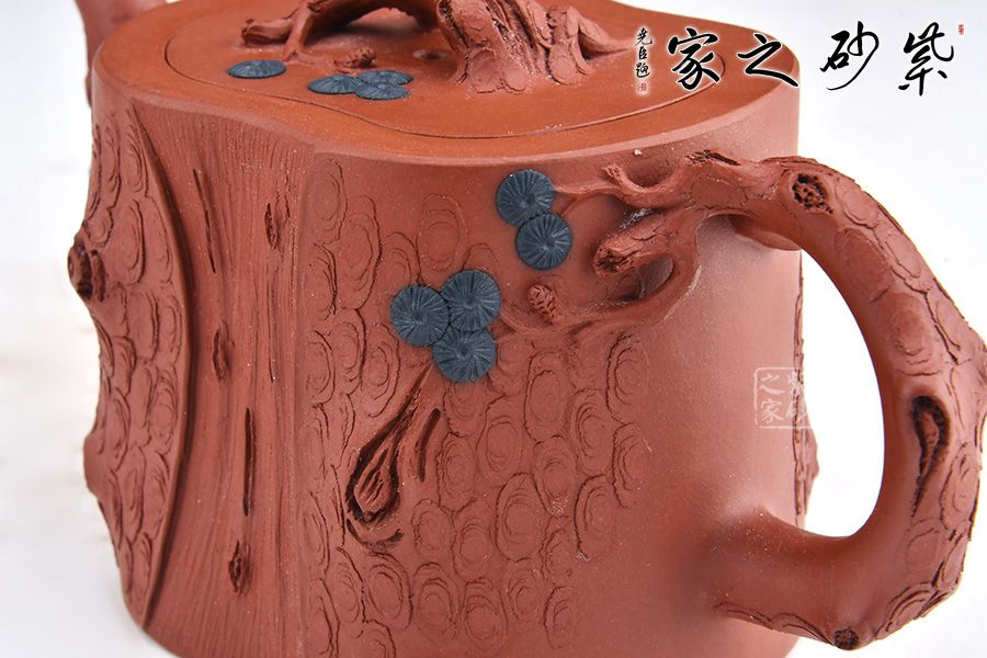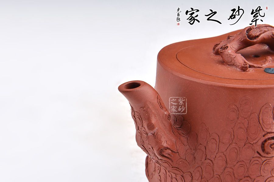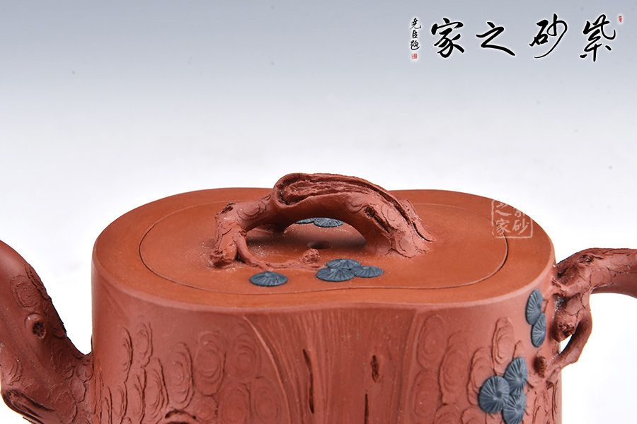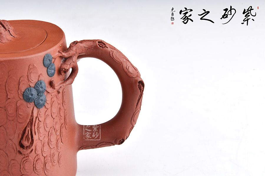 這是一件仿生作品,其造型古樸,壺身,流,把,蓋皆做松樹枝節(jié),平口,作淺圈足。整件松段壺泥塑工藝精美,層層迭迭,將古松蒼老之外皮塑造的分外相似。壺鈕更是巧取松節(jié)一段,匍匐貼合于蓋上,其上松針青綠,極其逼真。壺把亦有松針相連,生動(dòng)而形象。
