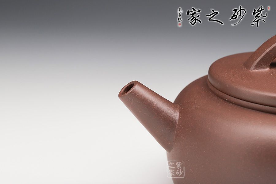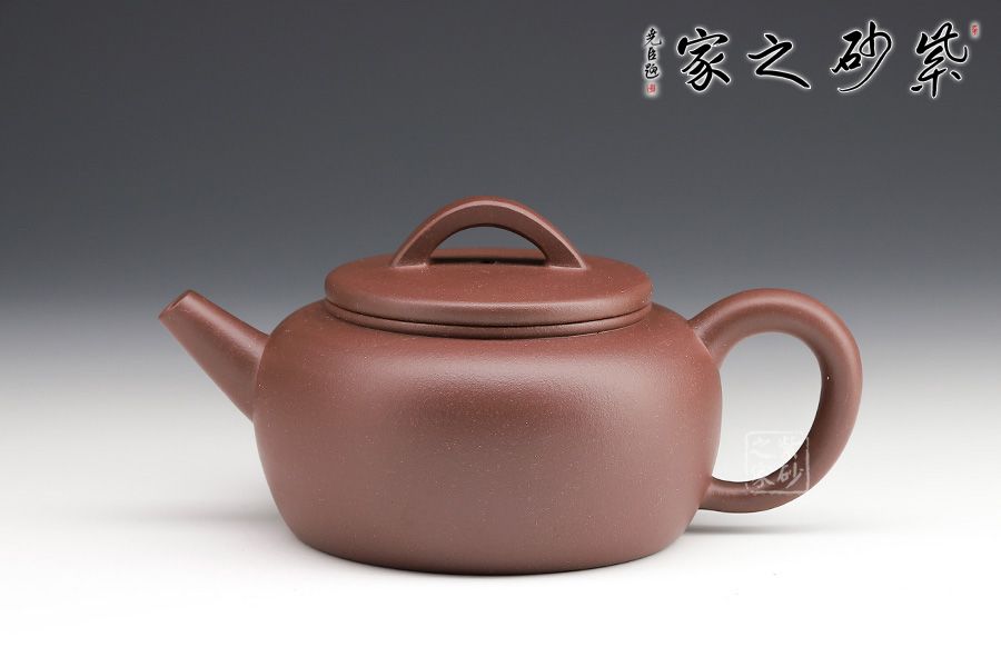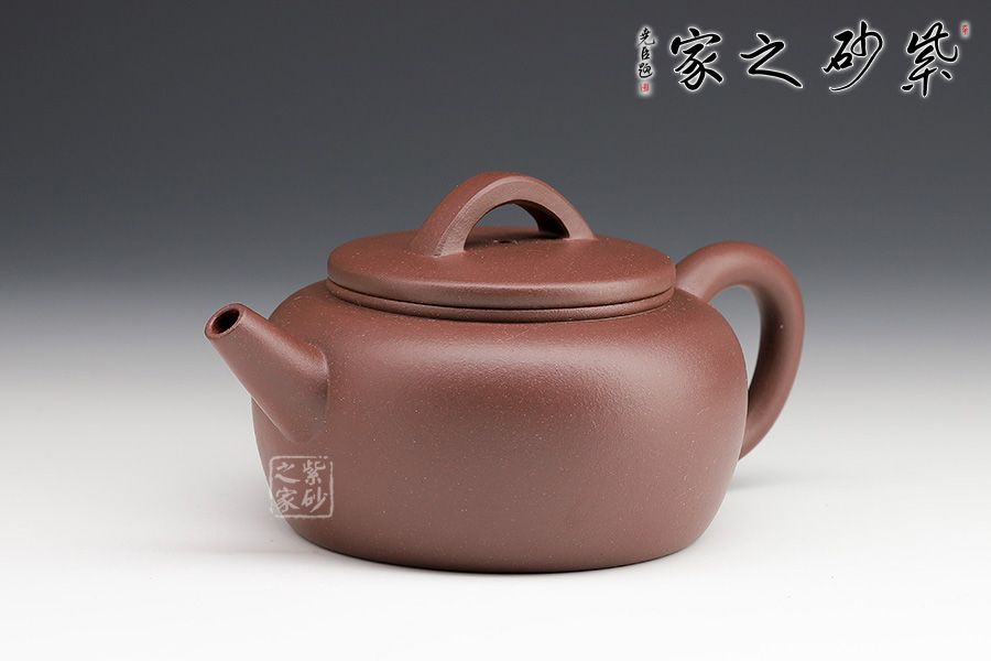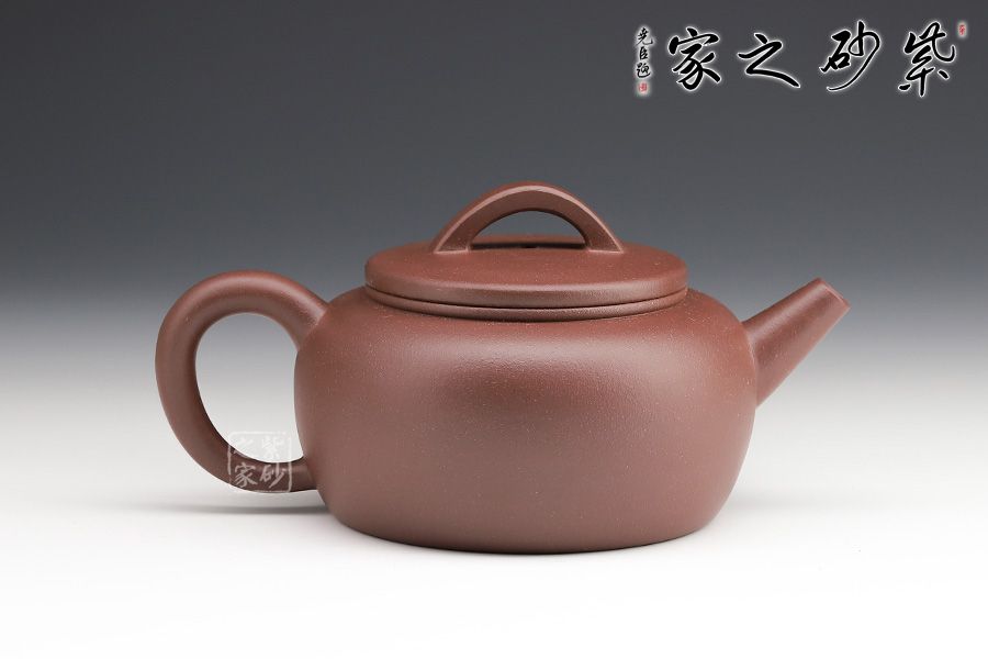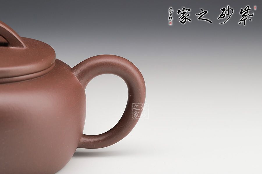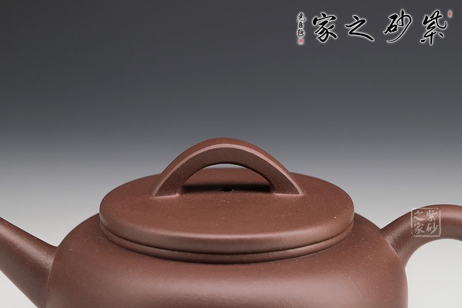 此壺壺身扁圓形,壺腹圓潤(rùn)飽滿,直流嘴出水干凈利落,耳形把端拿舒適,壓蓋設(shè)計(jì),氣密性強(qiáng),橋形鈕與壺身渾若一體,整體沉穩(wěn)厚重。