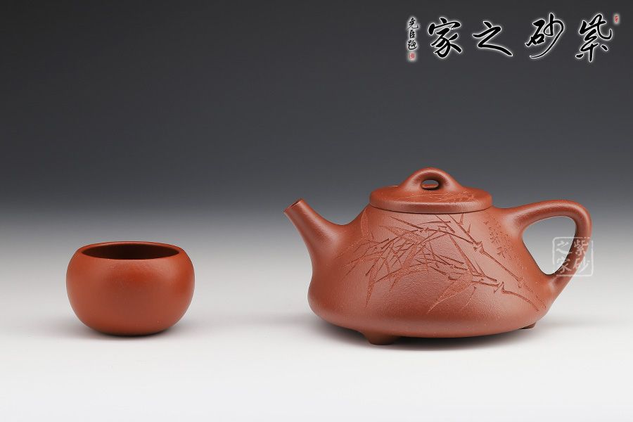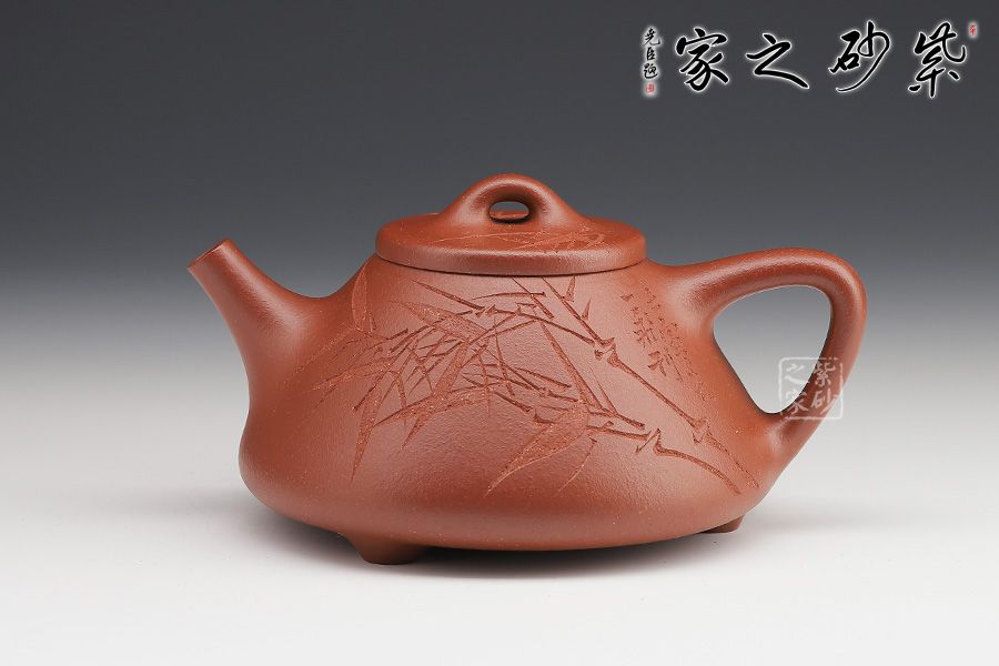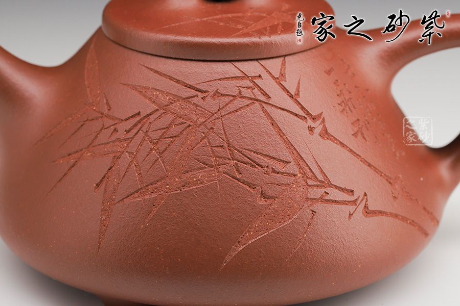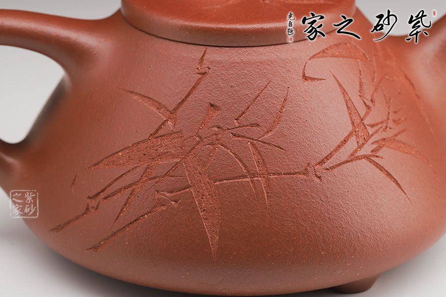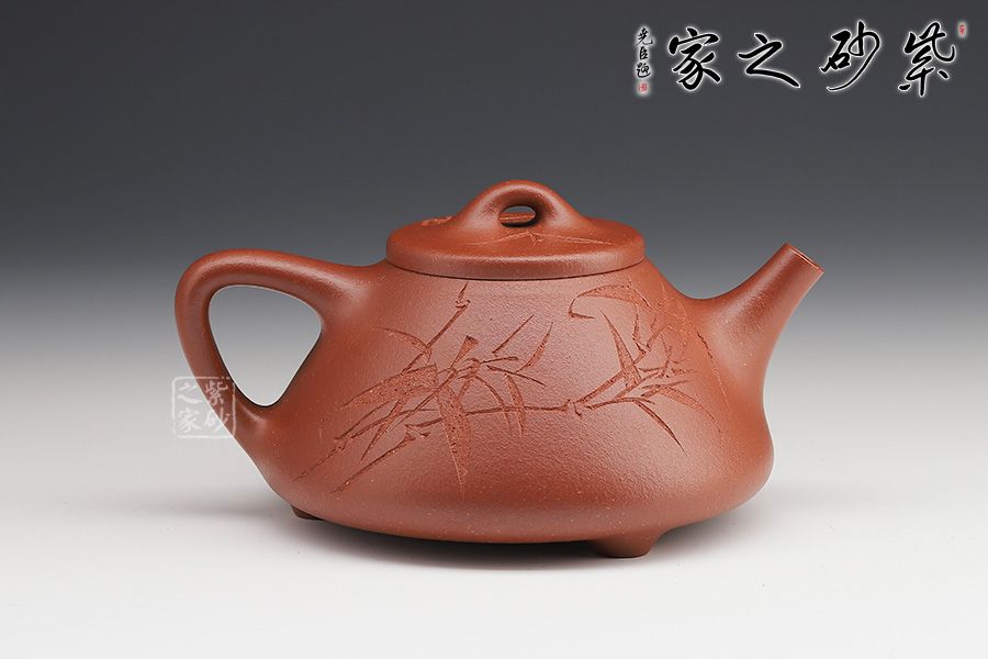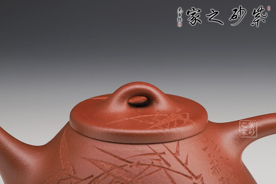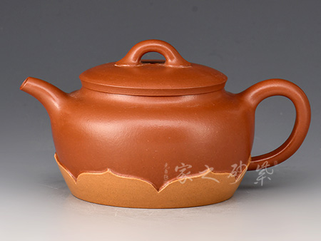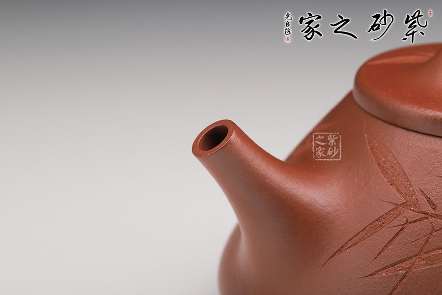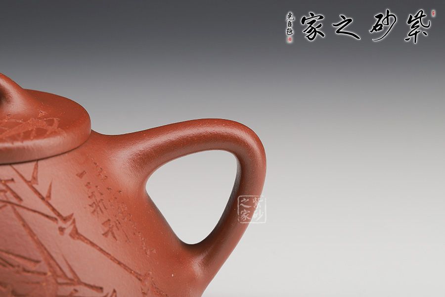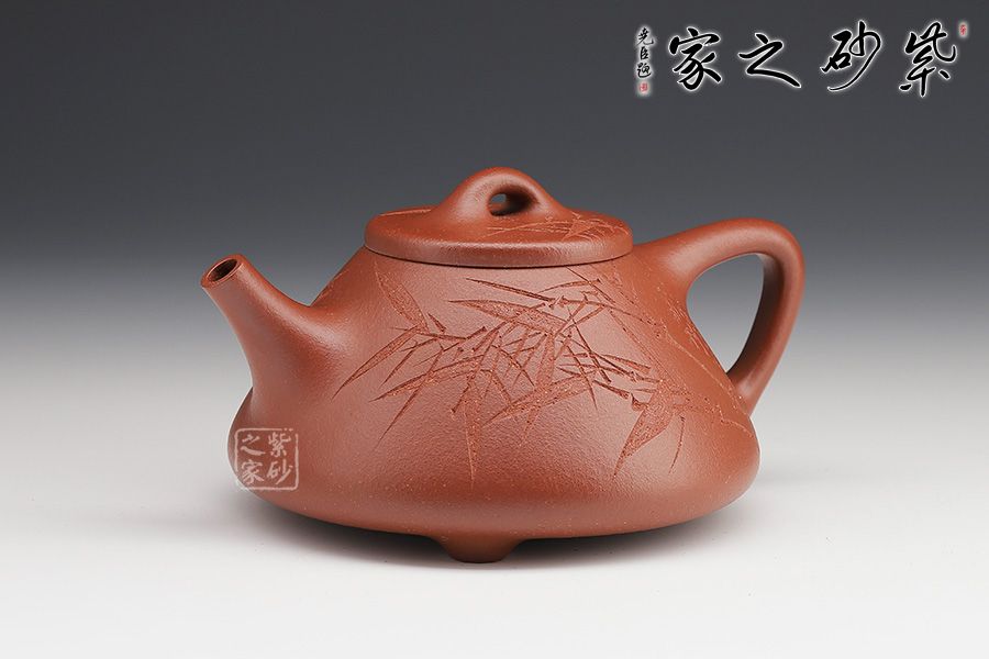 此壺下大上小呈三角形的石瓢形,周身皆以圓弧線條構(gòu)成,嘴、把、的處處銜接自然流暢,線條利落明確,起承轉(zhuǎn)合交待清楚。下以三圓足支起全身,使壺顯得挺括有神,沉靜而深意雋永。精選紅降坡泥制成,色澤紅潤。