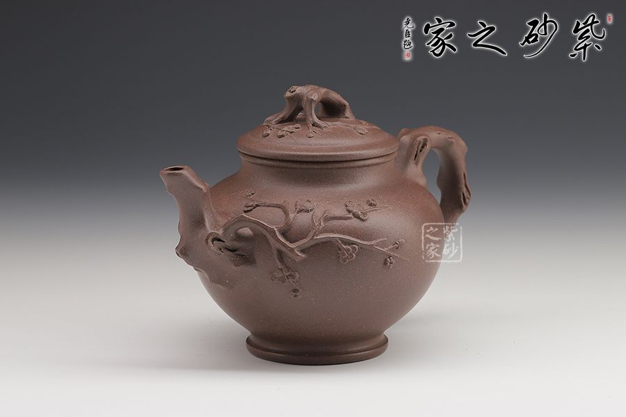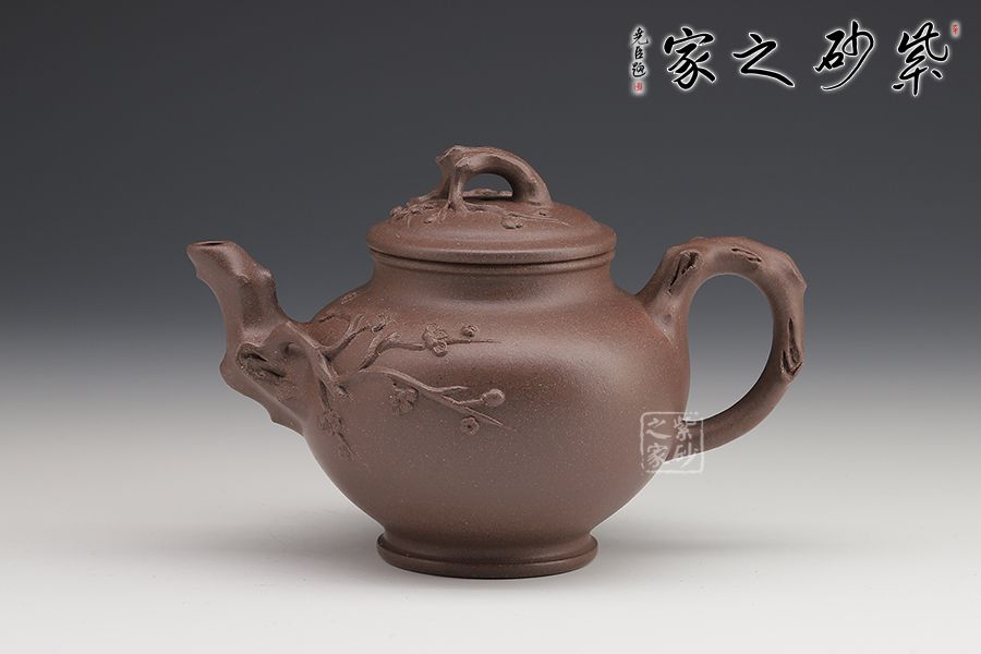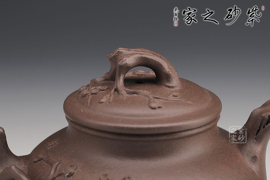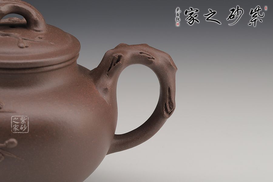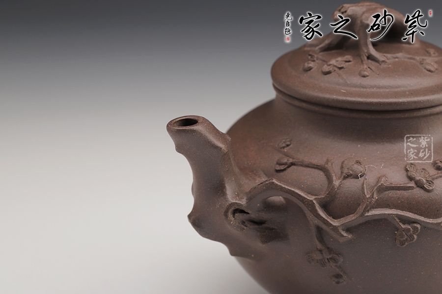 此壺以梅花枝梗作嘴、把、鈕,枝和節(jié)疤布置合理,伸展自然,暗香浮動(dòng)。在挺秀飽滿的圓形壺身上,貼塑出幾縷梅花,昂然綻放。此壺運(yùn)用多種手法,生動(dòng)地刻畫了梅花不畏風(fēng)霜嚴(yán)寒,俏麗優(yōu)雅的姿態(tài),兼具實(shí)用性和觀賞性,值得收藏。