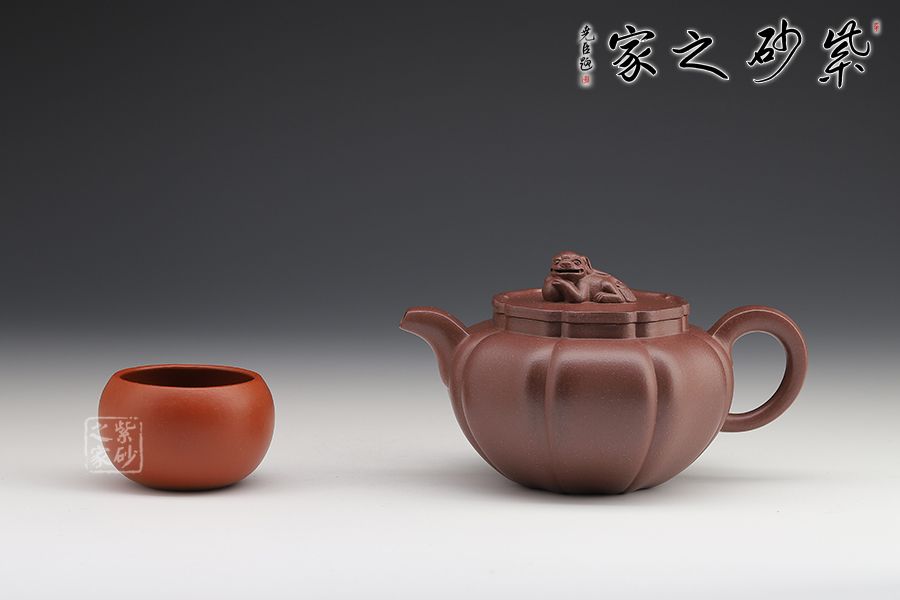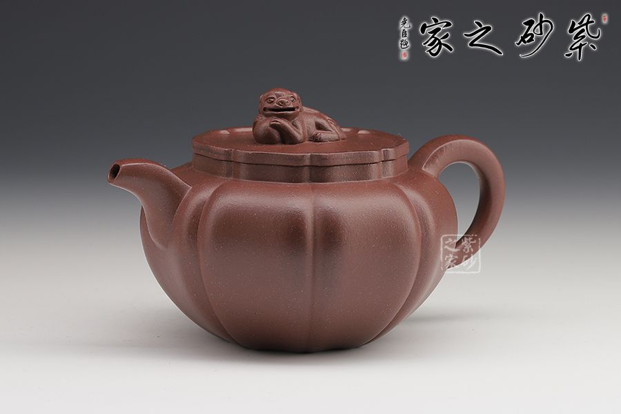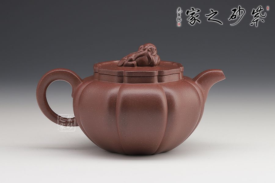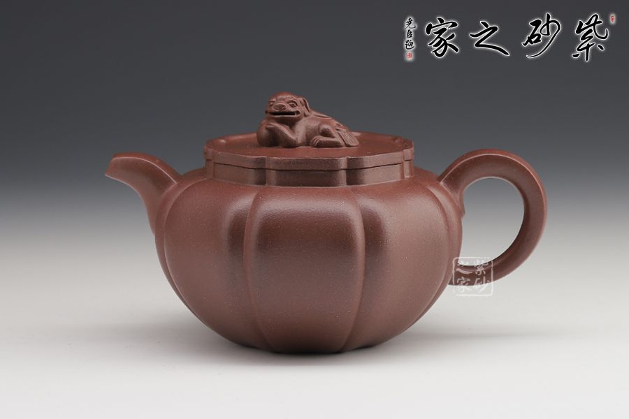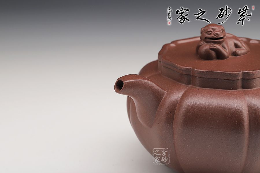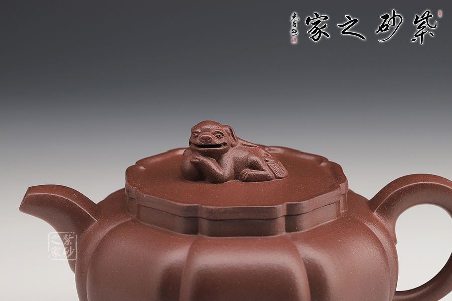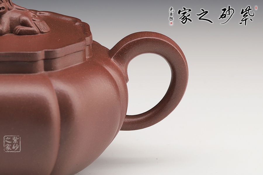 此壺筋紋等分,比例均勻,下調(diào)流暢。柔和的線條之間又有股挺拔的氣勢,非常耐看,整器協(xié)調(diào)統(tǒng)一,制作精巧,落地穩(wěn)重!壺蓋與壺身應(yīng)和,呈菱花造型。獅子玩繡球造型為壺鈕,直流長嘴,柔潤優(yōu)美,耳形環(huán)把隨勢,與壺嘴相呼應(yīng),氣韻舒暢。