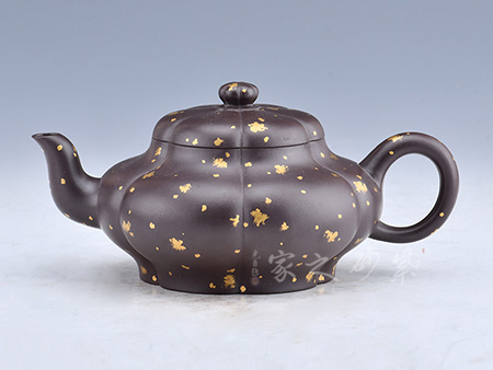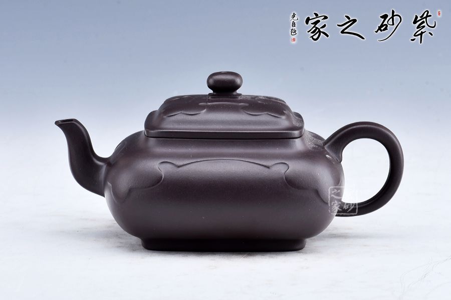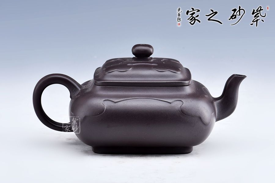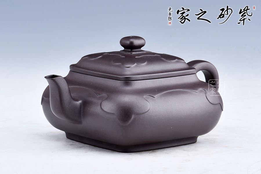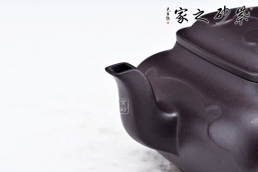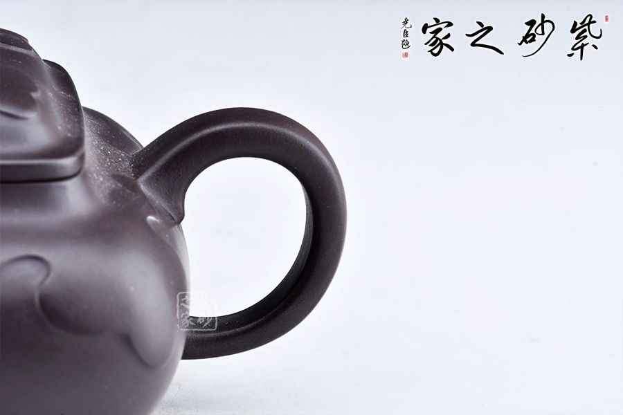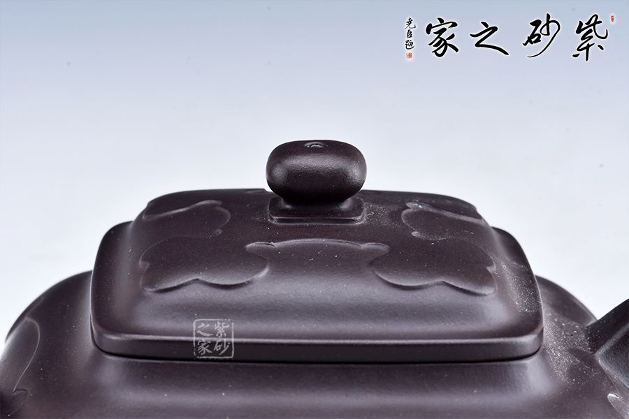 此壺方中見圓,肅靜雅致,過渡自然和緩,毫無凝滯之感。壺身為混方造型,略顯扁圓狀,矮而敦實,渾厚有力。三彎嘴胥出,耳形把隨身勢。扁柱形鈕與壺身呼應,蓋面及壺身裝飾如意紋樣,凹凸有致,極其動人,表現出如意吉祥的寓意來。