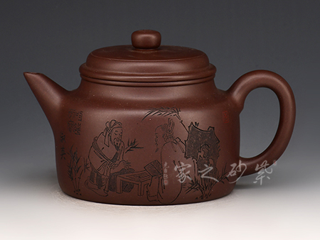 詩畫饋贈,領略文人之風:其作品多以厚重的文化底蘊和精巧的刻繪工藝見長,這得益于其對書畫的極高造詣,一字一景耐人品評,若能解其中之味,便能一語道破壺中天機。不時 有題詞或畫作贈予壺友,互相交流學習。王濤之壺,文人之壺,茶香和著詩韻,乃是壺的精髓所在。近年來的紫砂作品傳統(tǒng)為主,力圖創(chuàng)新,具有鮮明的個性和文化特征。