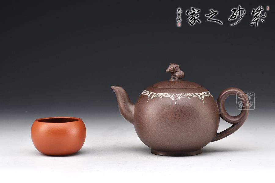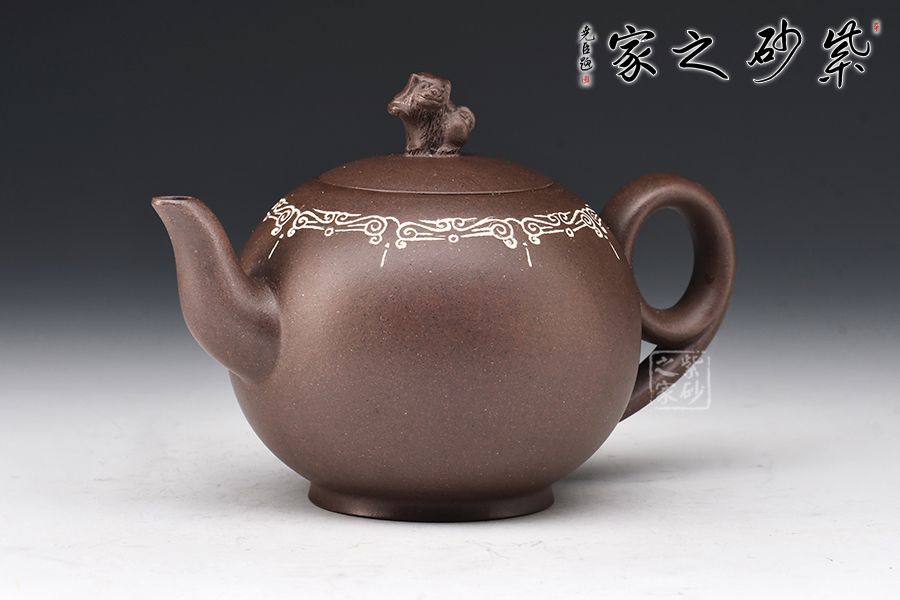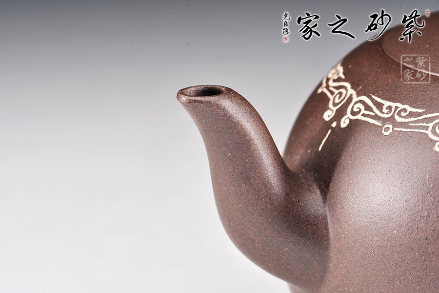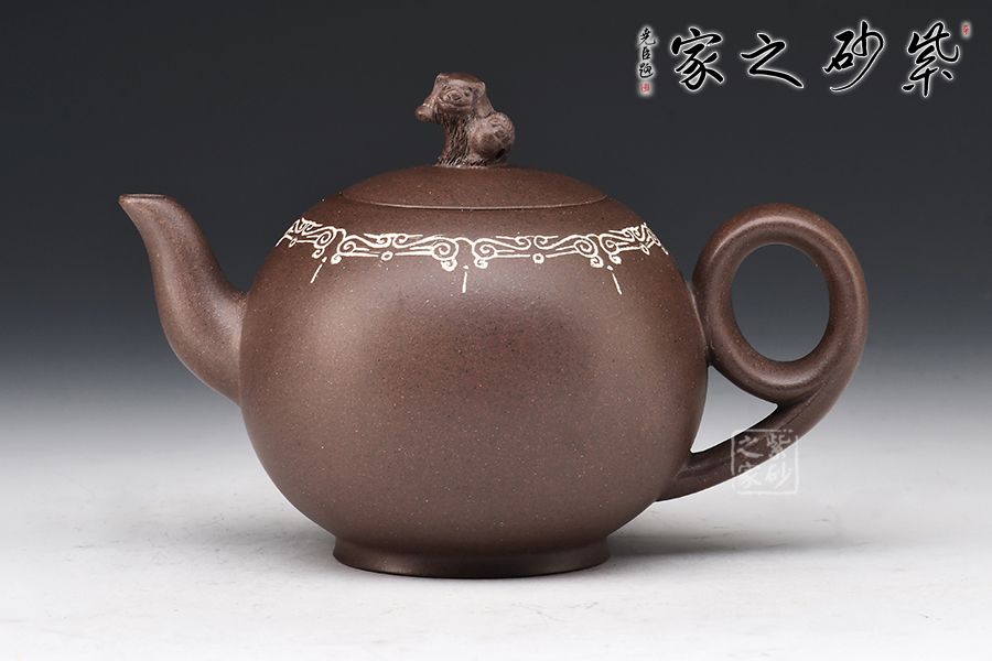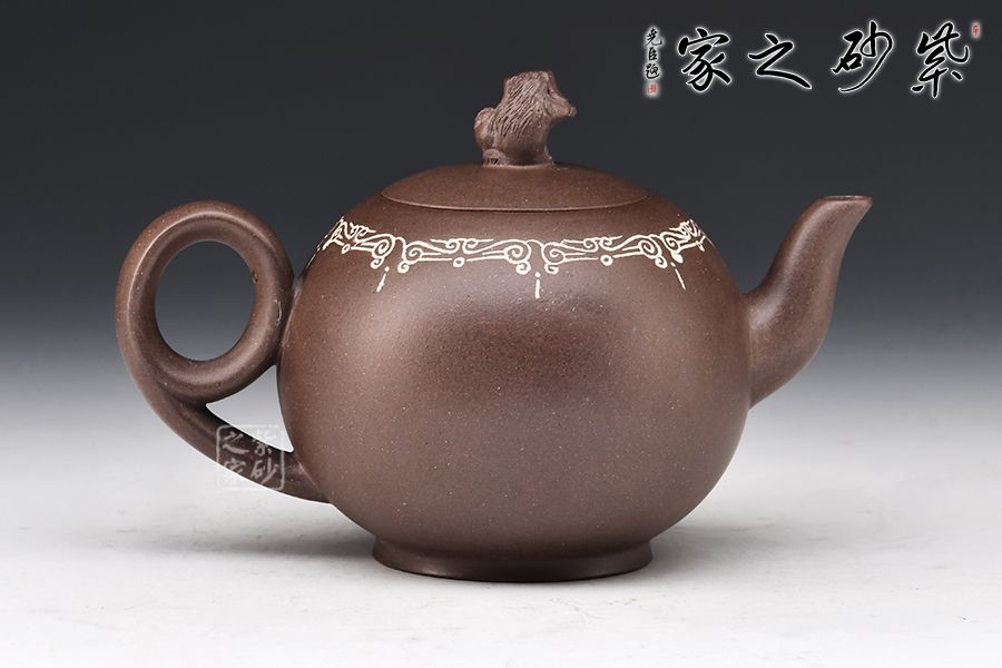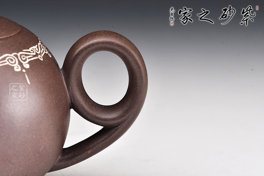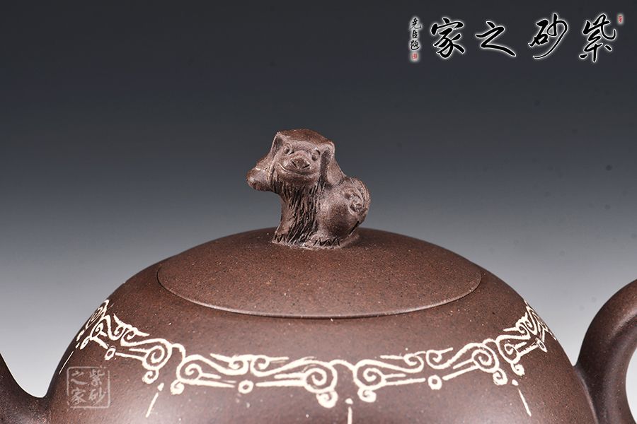此壺為陳維老師原創(chuàng)設(shè)計(jì)款,器形圓潤飽滿,線條感十足,尤其壺把的設(shè)計(jì),新穎別致,拿捏舒適,壺口處做嵌銀絲裝飾,更顯富態(tài)。鈕以“獅”為形,采用雕塑工藝,彰顯主題,寓意瑞獸迎祥。