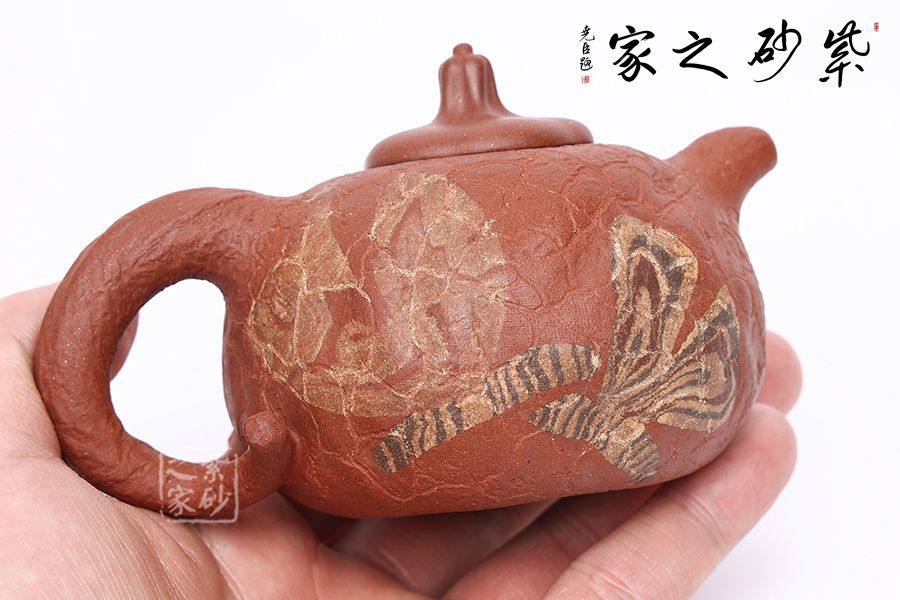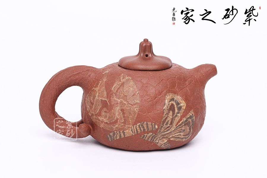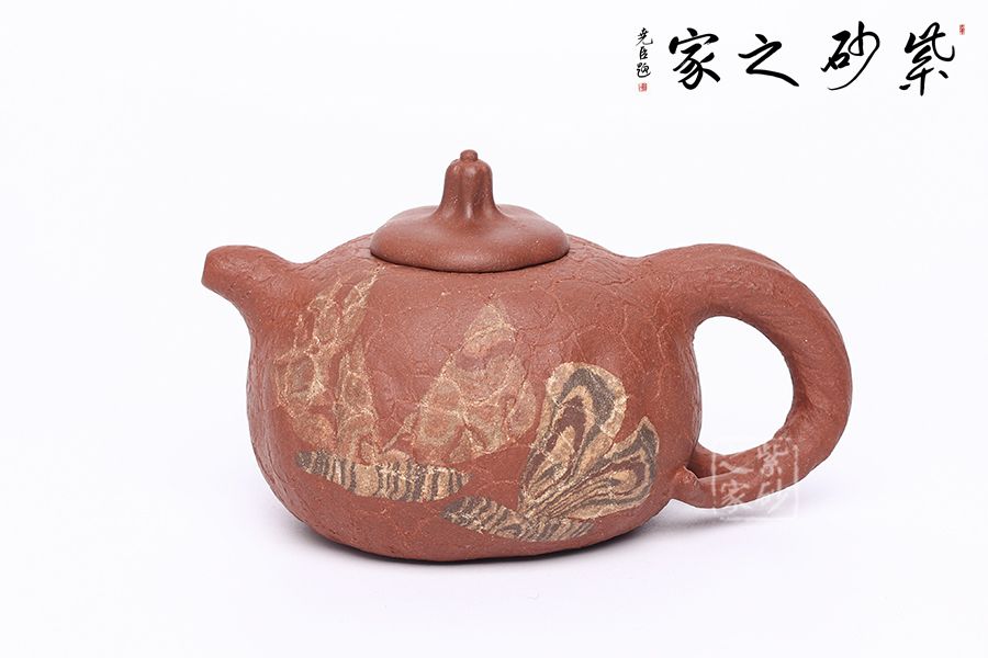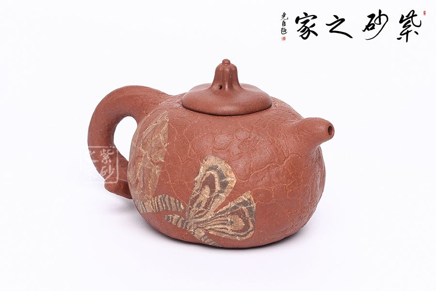 老師在原有供春的基礎(chǔ)上加入自己的創(chuàng)新,壺身裝飾兩只彩蝶,上下翻飛,整件作品動靜結(jié)合,一件好的紫砂作品總能帶給人精神上的享受。