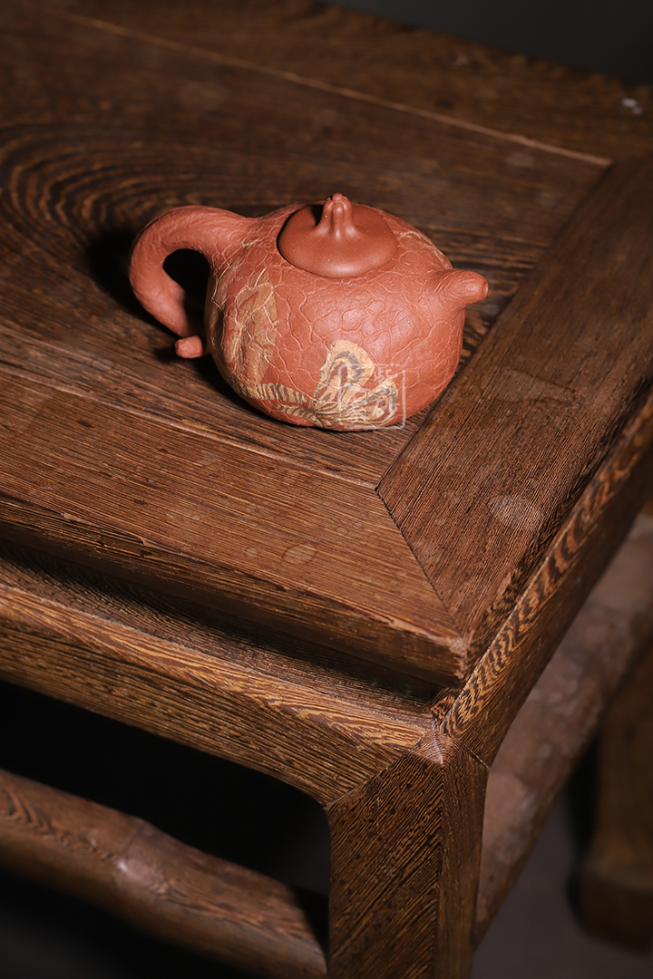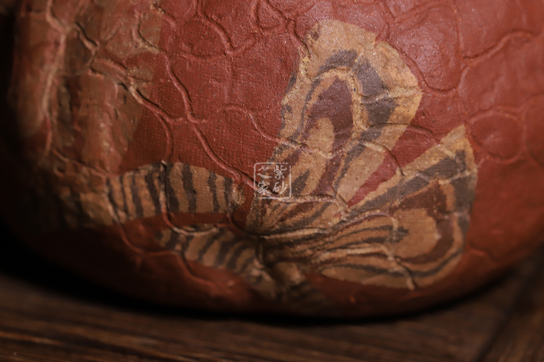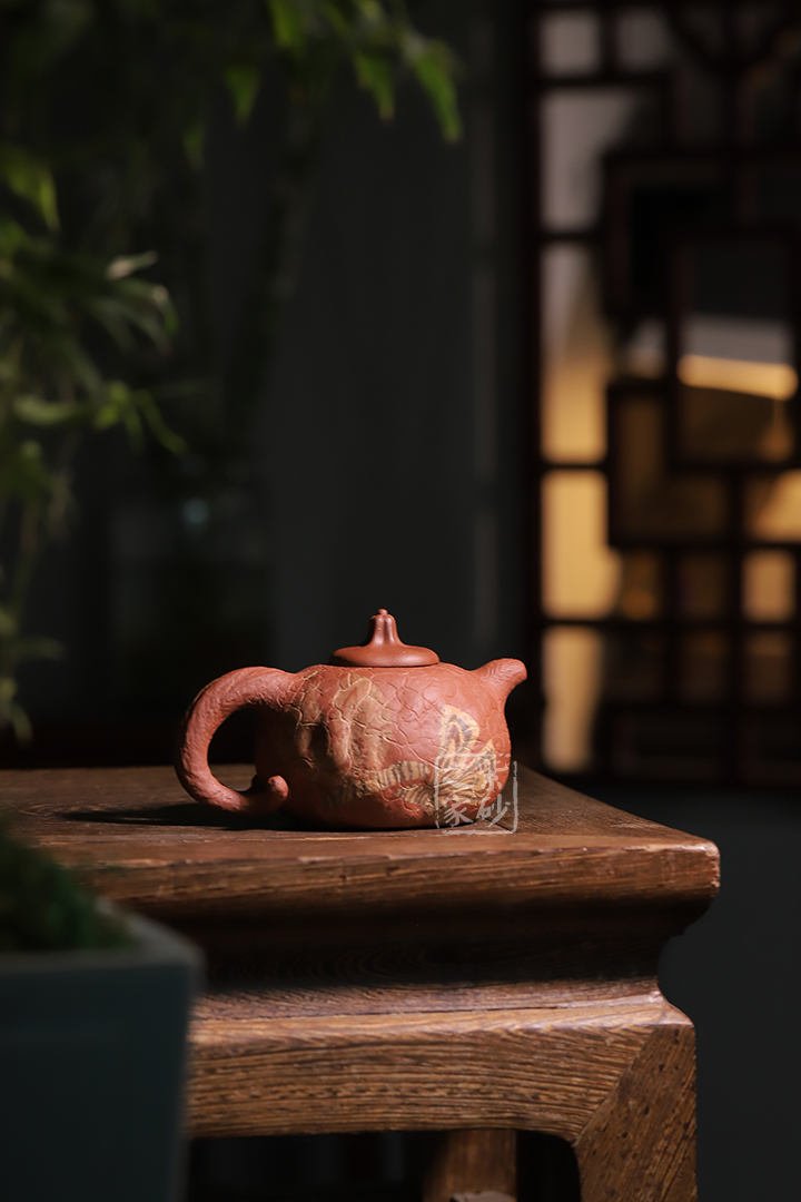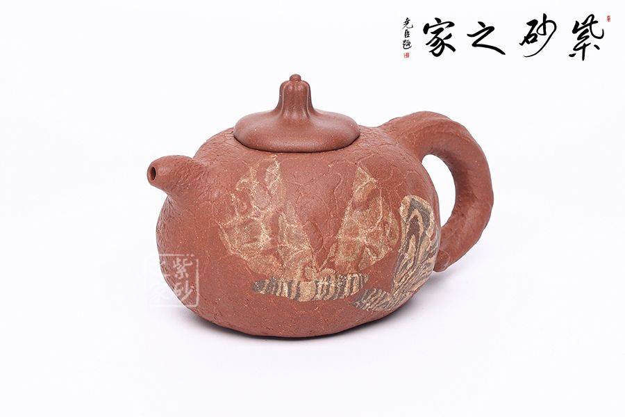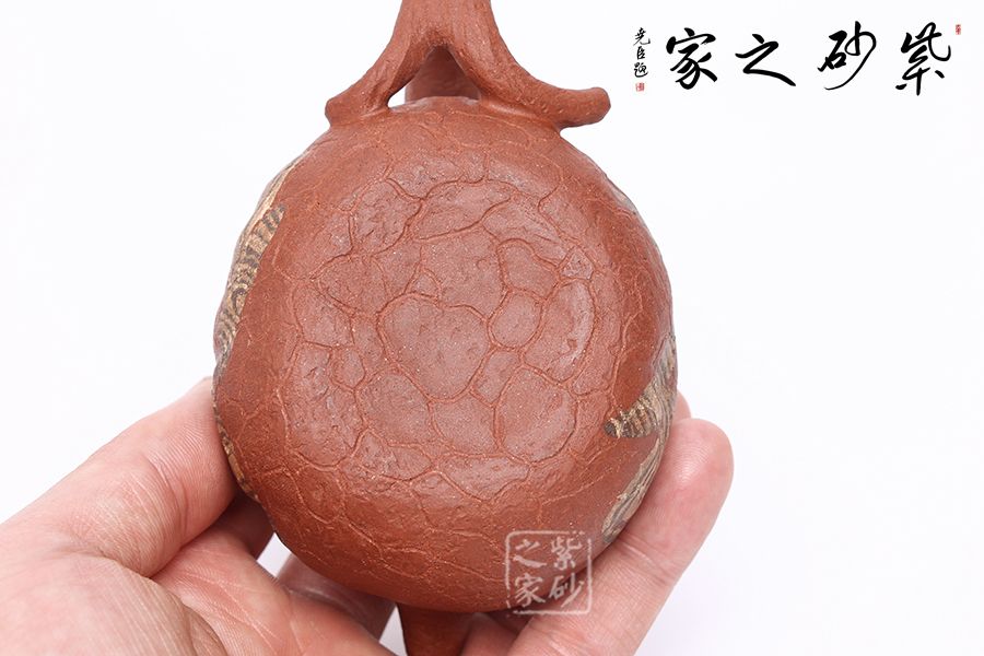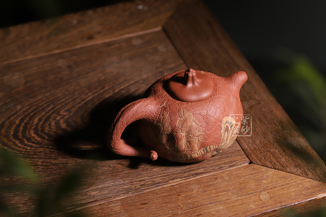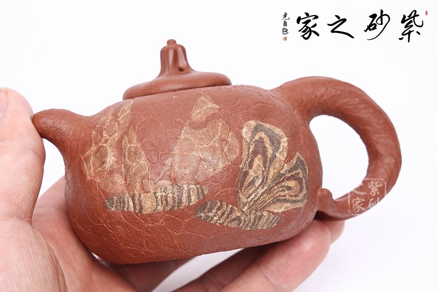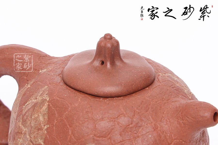 壺身斑駁,紋理錯雜繚繞,色澤渾樸,古韻優(yōu)雅。瓜蒂式壺鈕,大有返璞歸真之意境。壺身輕巧,端握舒適,凹凸自然,渾身紋路密集卻不繁亂,老味十足;壺嘴精巧胥出,嘴口圓潤,出水流暢;端把粗細均勻,支撐力更強,更加穩(wěn)固。