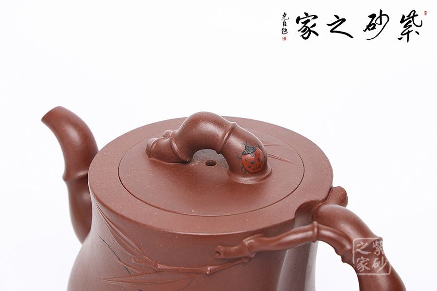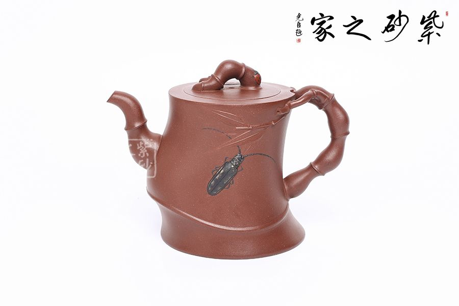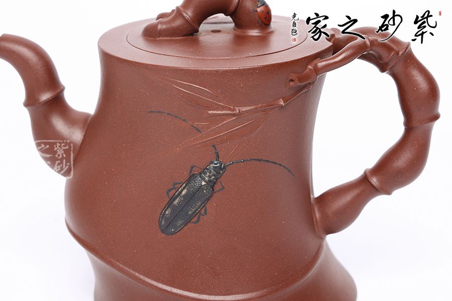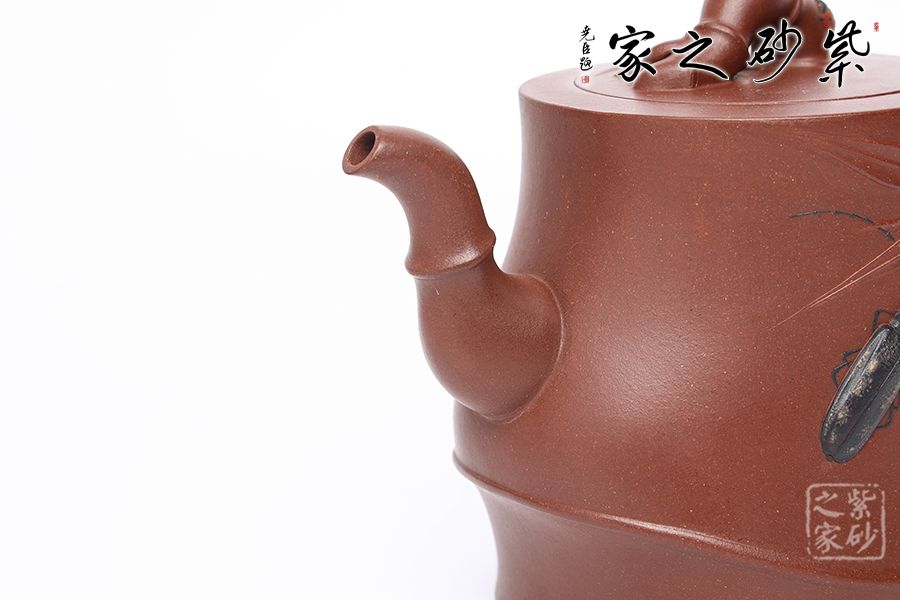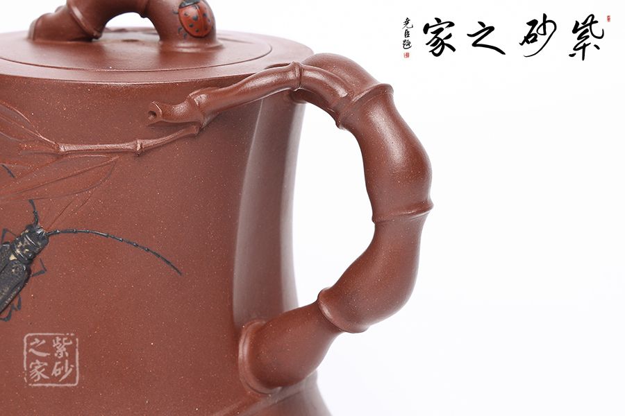 竹,清雅、高:節(jié)、素潔凌云。竹引牽牛壺以“竹”為題材,壺身似一個(gè)扭曲的竹節(jié),壺鈕為兩只竹節(jié)交錯(cuò)而成,貼于壺蓋。壺把亦是兩節(jié)細(xì)竹枝盤(pán)桓而成,細(xì)致優(yōu)雅,神采奕奕,更顯高風(fēng)亮節(jié)。三彎流由四節(jié)竹節(jié)蜿蜒而成,彎流胥出挺拔有力,嘴頭平向伸出,足見(jiàn)穩(wěn)健。壺身加入裝飾,更顯生動(dòng)。