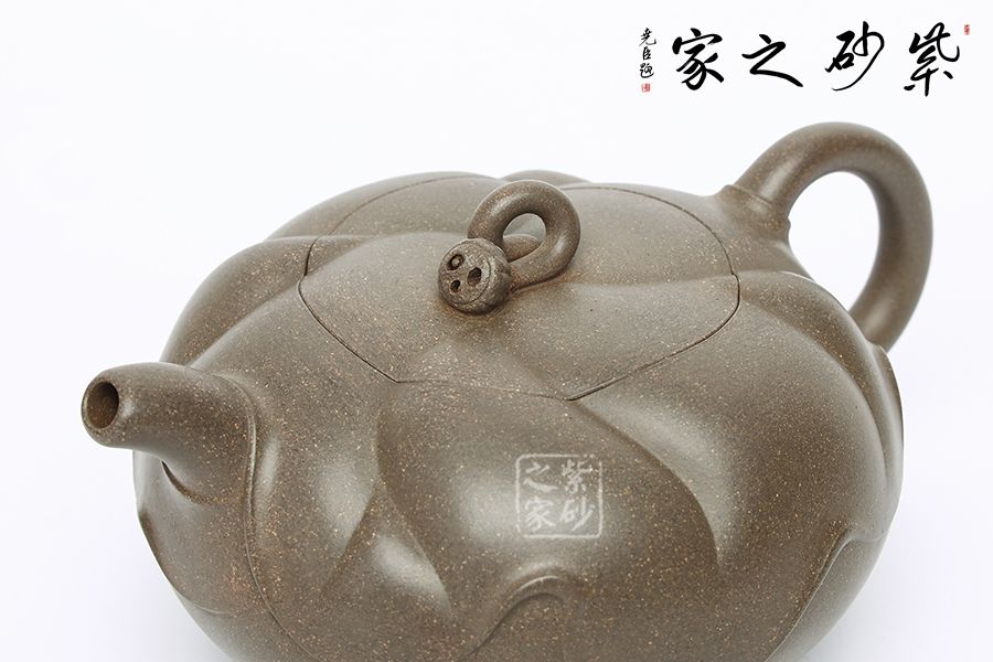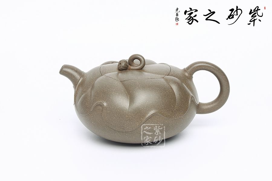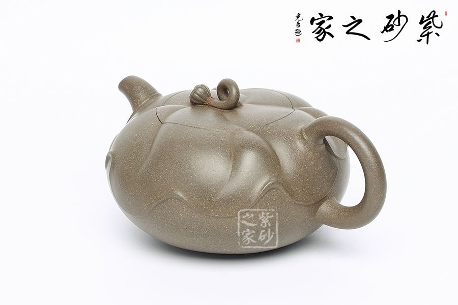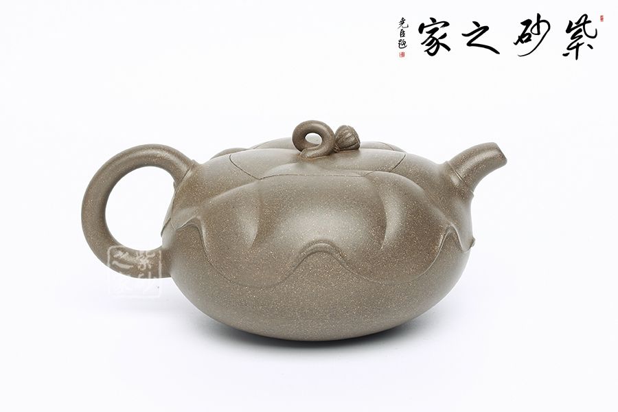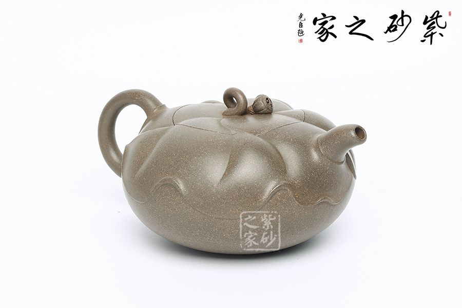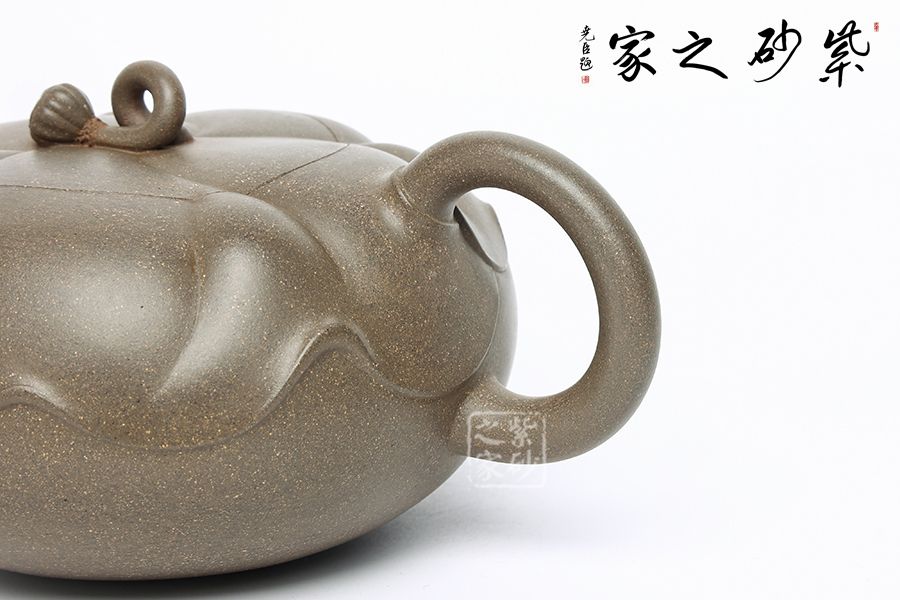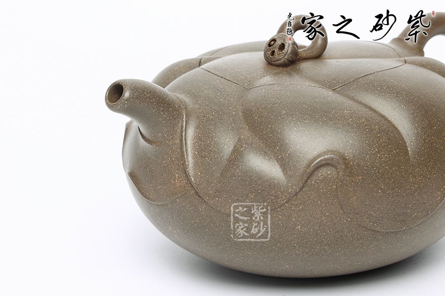 此壺為作者富有創(chuàng)新之作,以青段為胎,色澤鮮明。壺體扁圓,壺體以淺浮雕裝飾手法以荷葉,蓮蓬、蓮花等內(nèi)容。壺蓋上一片清荷隨風(fēng)擺動(dòng),一只蓮蓬臥于葉上,顯得清雅清趣。傳統(tǒng)優(yōu)美的造型,決定著它的日用功能的完備。