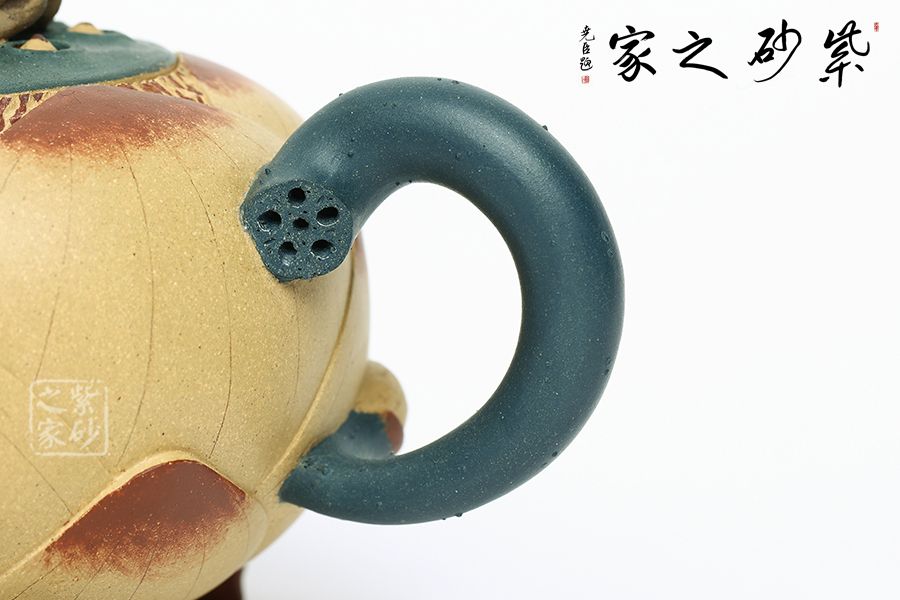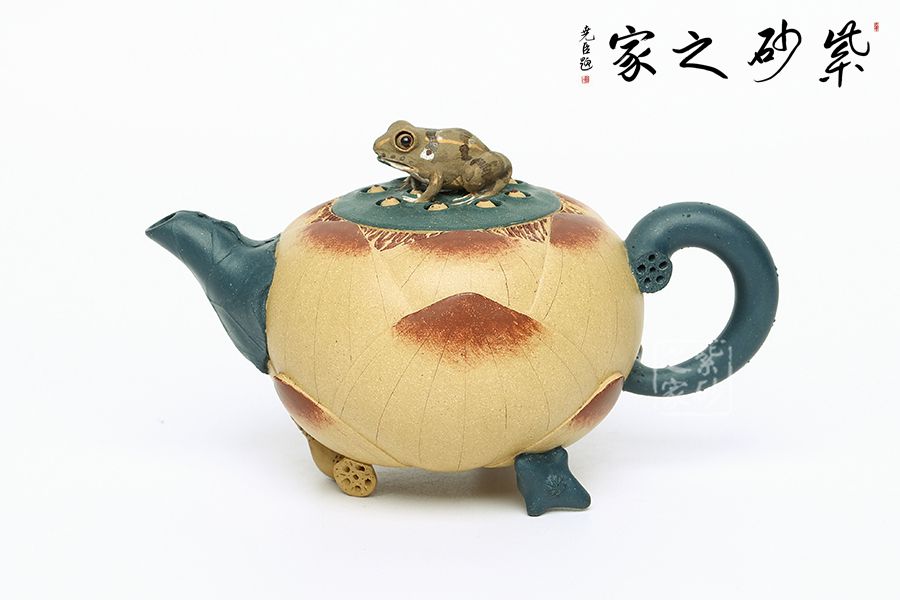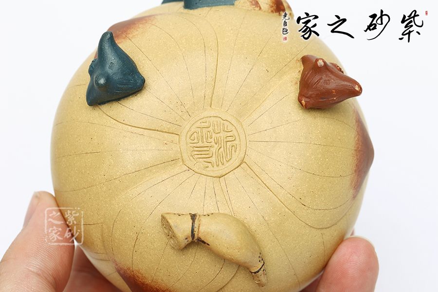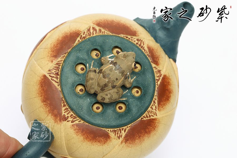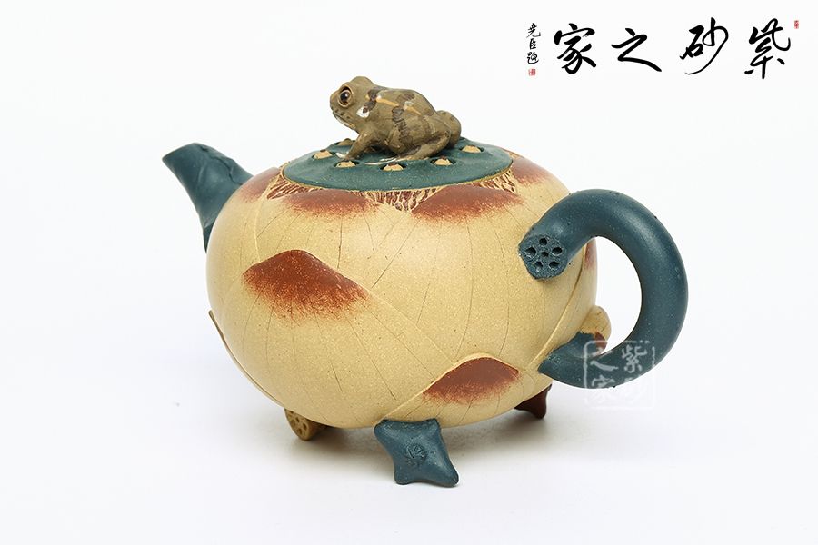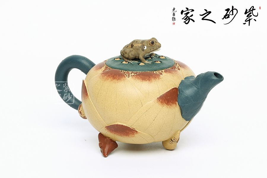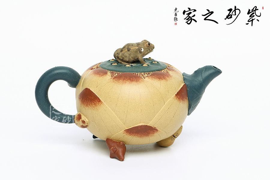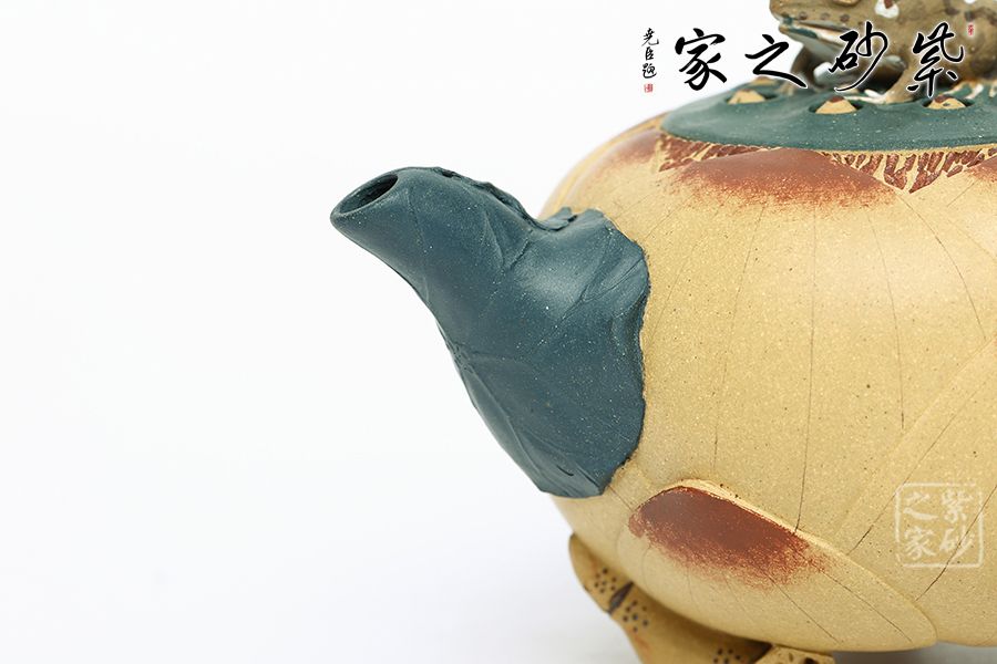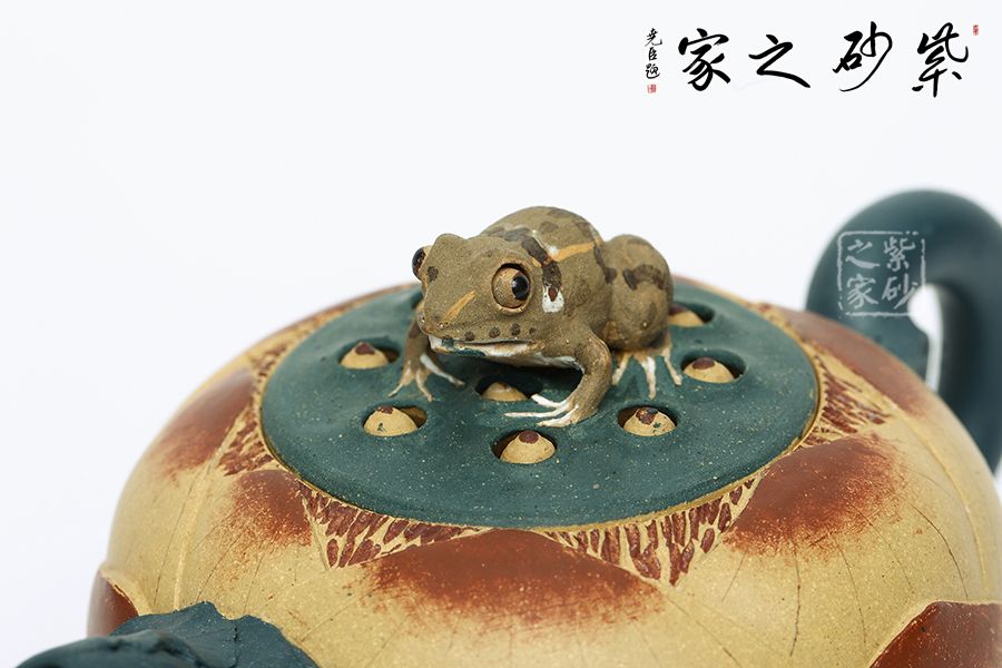 壺型以荷花為基礎,輔以各種荷塘元素制作,趣味斐然。壺身為荷花,段泥制作色澤鮮亮動人,更加逼真;壺把為莖葉,綠色泥料加上逼真造型,讓其似是真的一般;壺嘴為荷葉,葉片卷曲,還有紋理裝飾,更顯做工;壺鈕為青蛙,通身翠綠色趴在一團蓮子上,眼神警惕,像是能活過來;更巧妙的是壺底三足,以兩個菱角和一段蓮藕制作,用心巧妙,讓人由衷贊嘆。