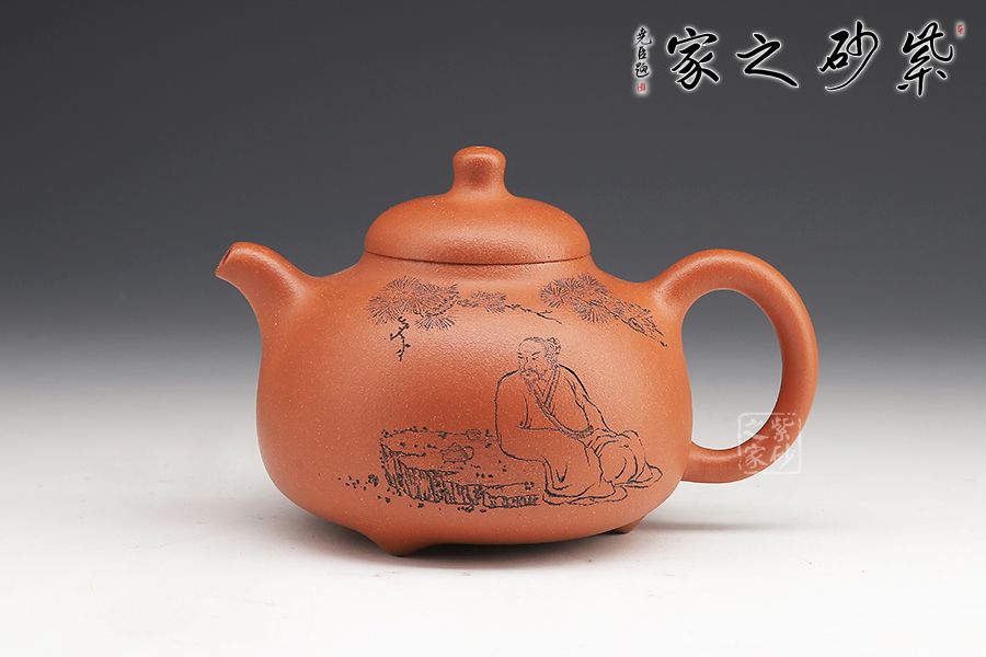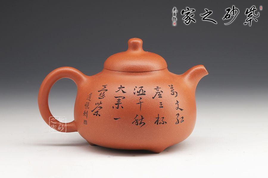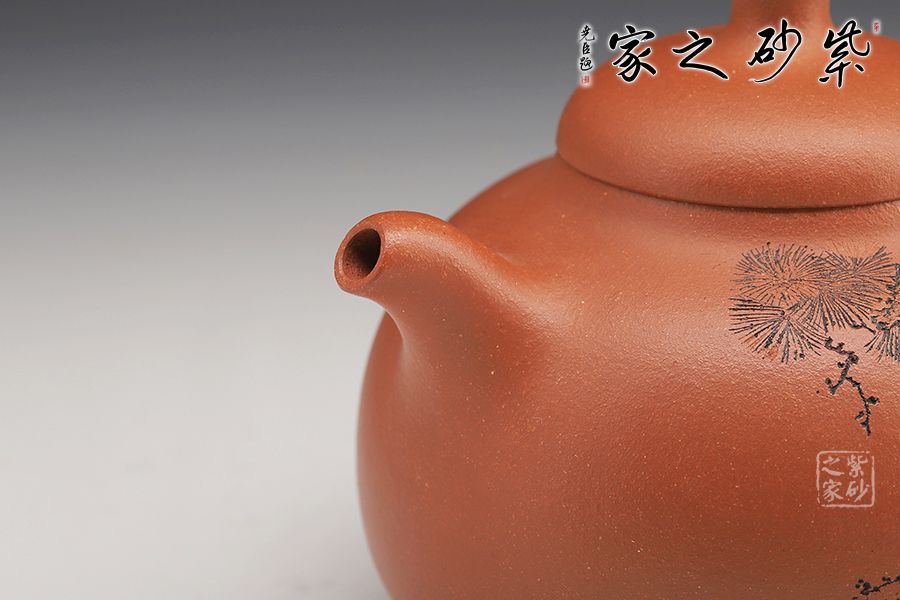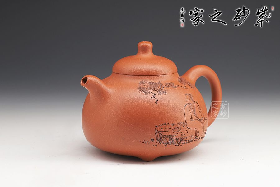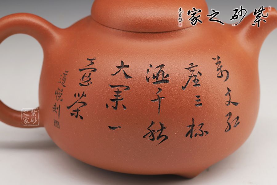 此壺豐滿圓潤,線條挺括流暢。壺身形體飽滿,形若匏瓜,壺嘴、壺把、壺鈕與壺身搭配協(xié)調、比例勻稱。擺設三足乳鼎,寓意一切將有的開始,用來象征吉祥。