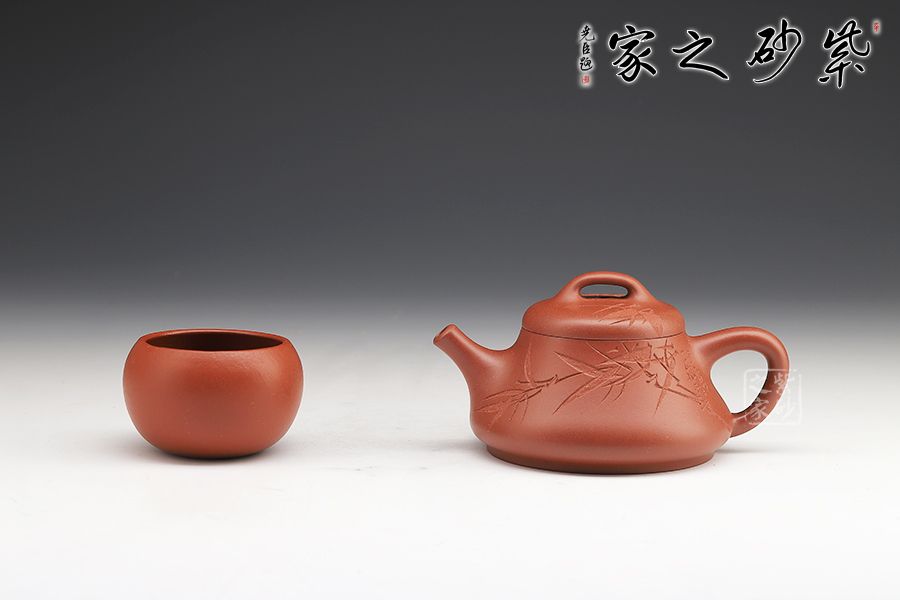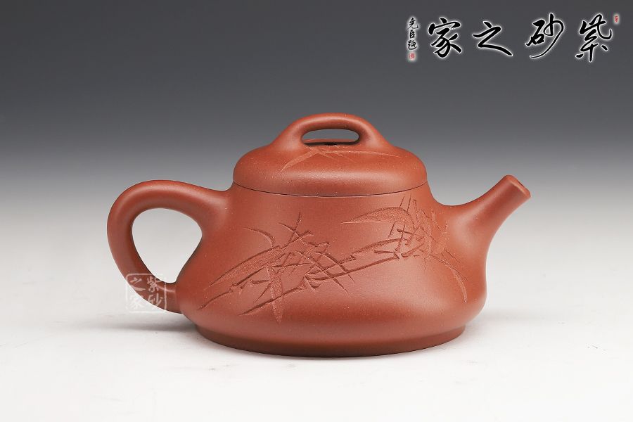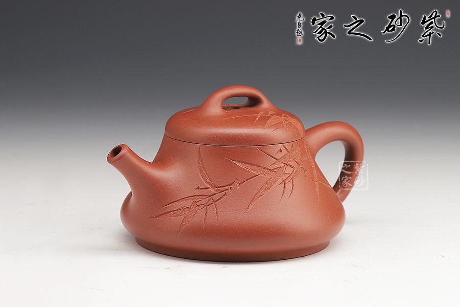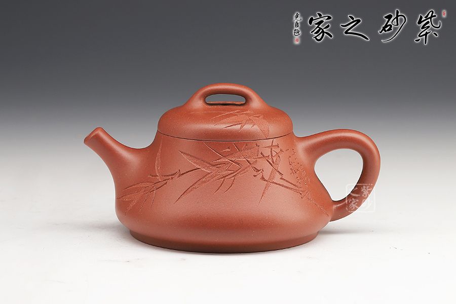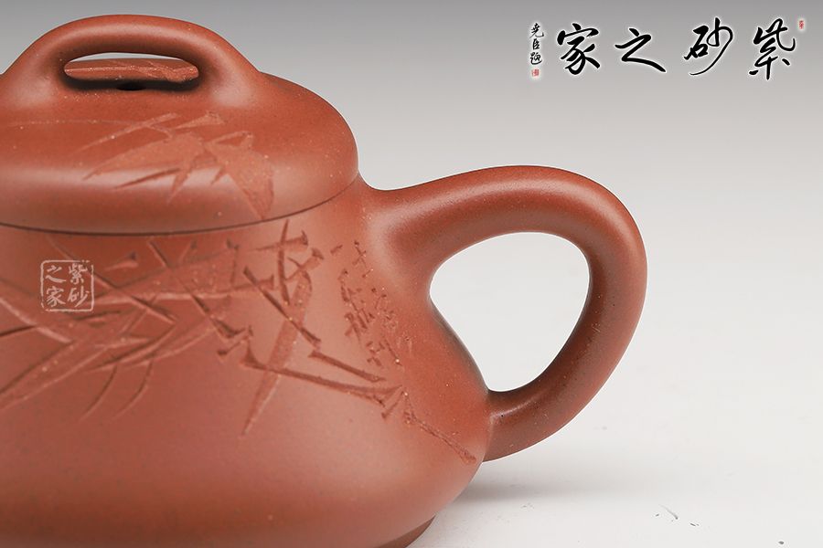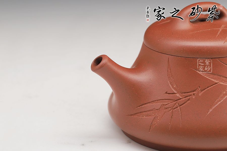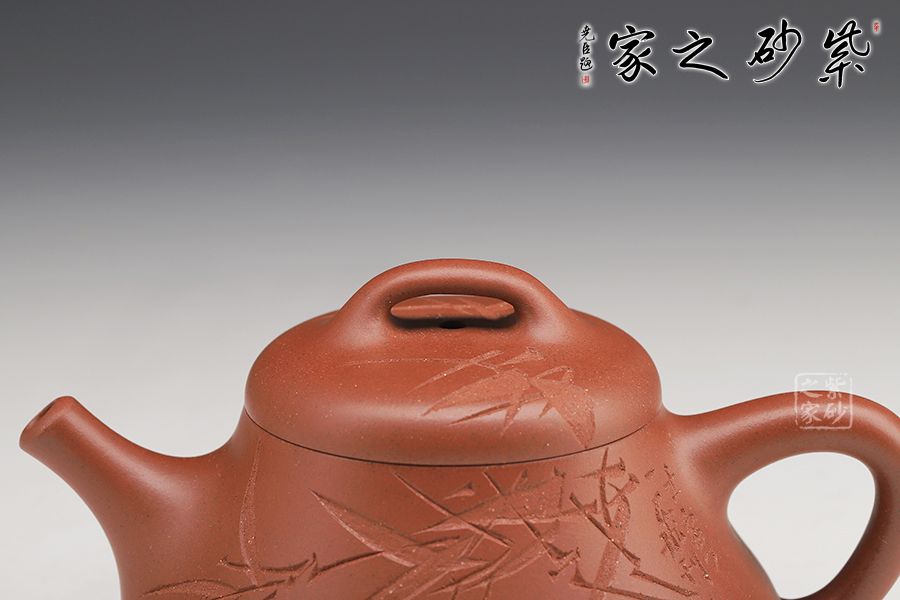 此壺壺身上斂下豐,口蓋略大,直流壺嘴出水爽利,實(shí)用性很好。壺身由劉一飛老師刻繪,青竹細(xì)刻,韻味尤佳!