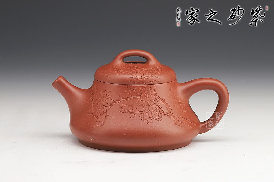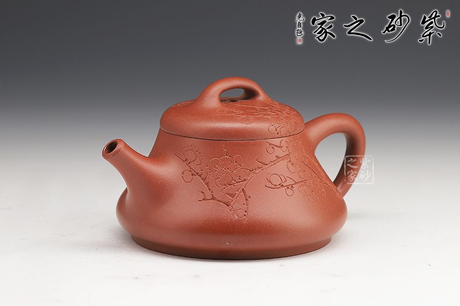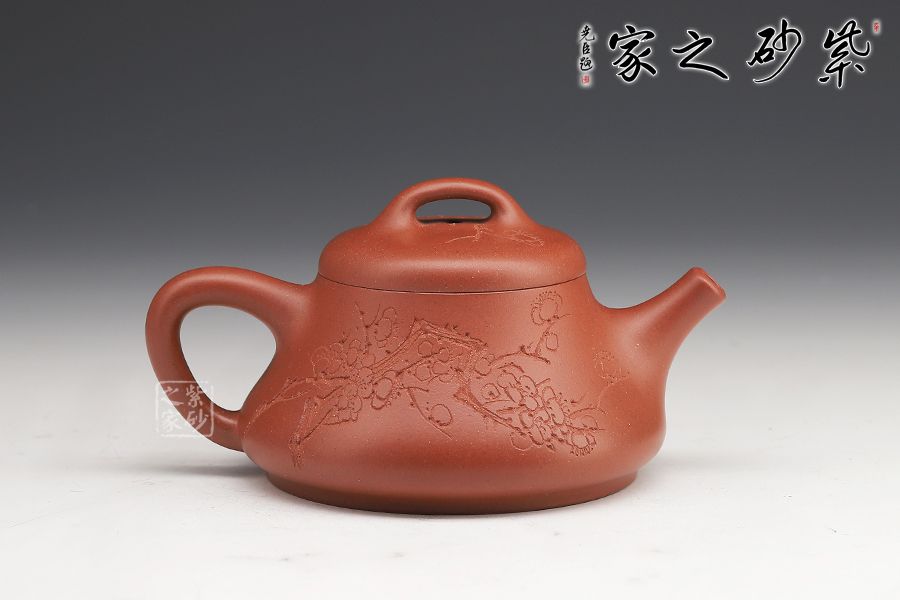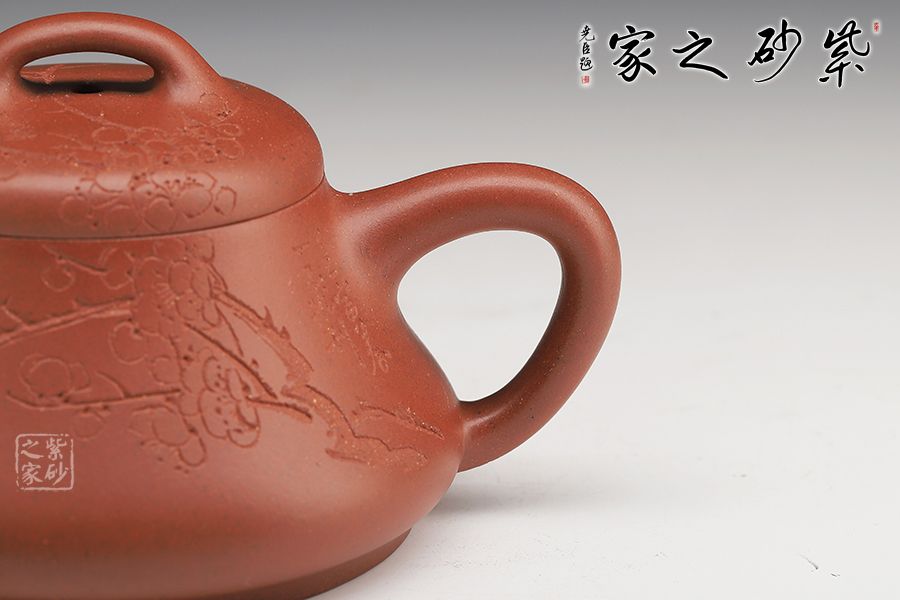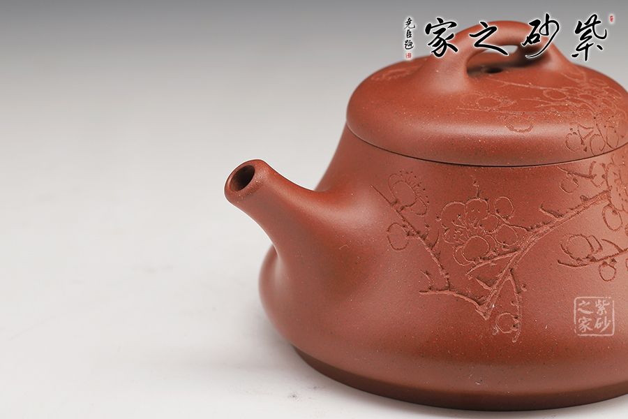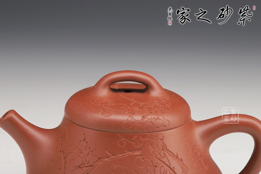 此壺壺身上斂下豐,口蓋略大,直流壺嘴出水爽利,實(shí)用性很好。壺身由劉一飛老師刻繪,梅花枝干充盈整個壺身,顯清素典雅,極具收藏價值。