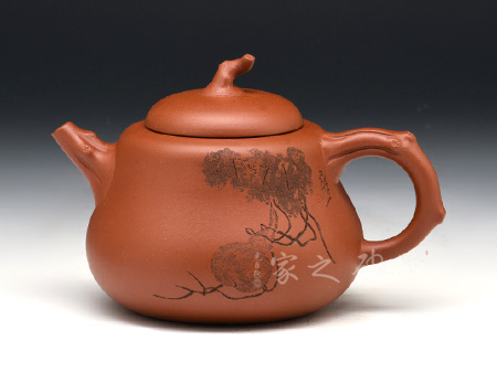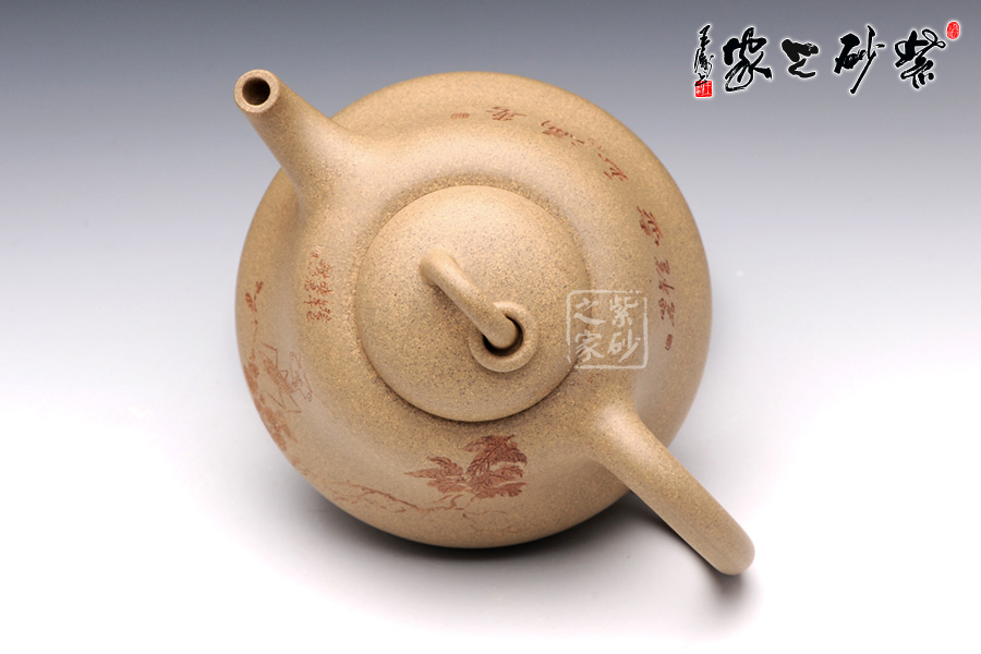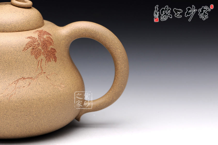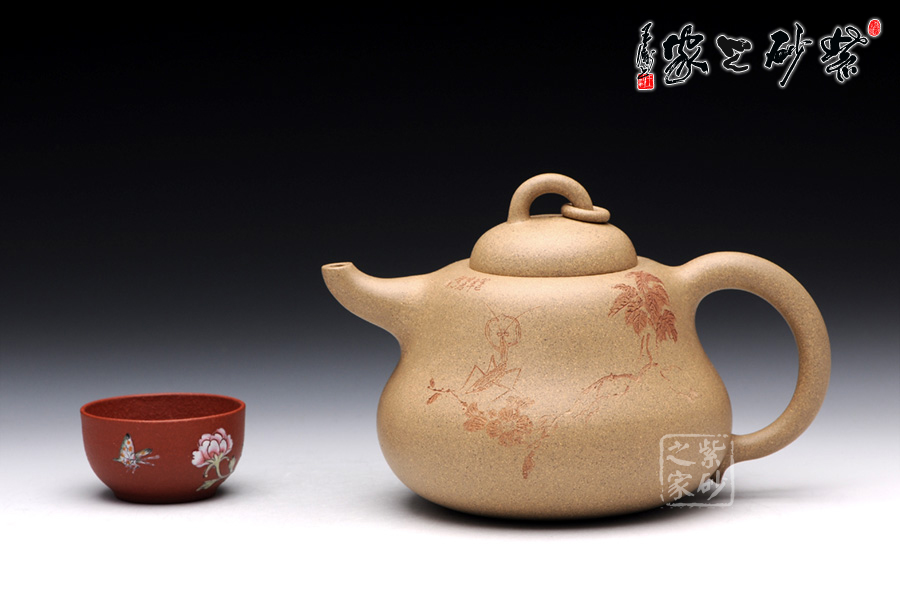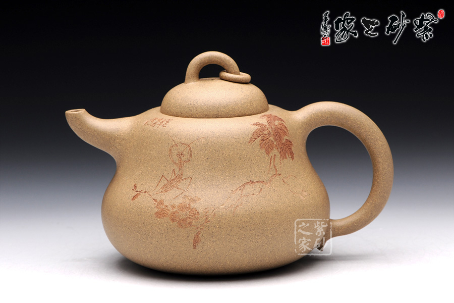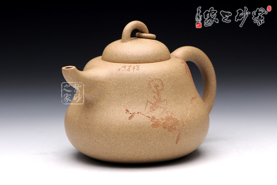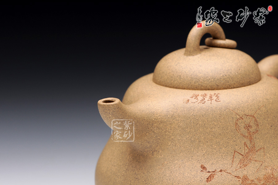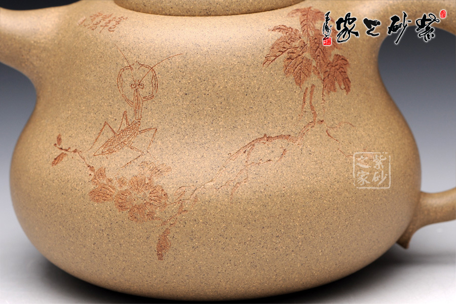 A面: 裝飾: 蟲(chóng)趣圖 裝飾者:周小軍(曉君) 裝飾內(nèi)容: 此壺裝飾、篆刻由國(guó)家工藝美術(shù)師周小軍操刀,壺身正面刻繪為曲折蜿蜒的藤蔓、花開(kāi)得嬌艷欲滴,葉青翠欲滴,須莖卷曲自然,一只蟈蟈立于藤蔓的花葉之上,顯得極為輕巧靈動(dòng),閉眼傾聽(tīng),仿若能聽(tīng)到蟈蟈輕微的鳴叫聲,不要懷疑,那就是春天的聲音。