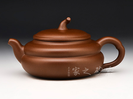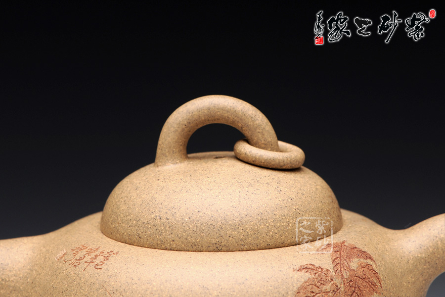 壺體設(shè)計(jì)新穎。造型呈葫蘆狀,壺流短直而微向上翹,把成半環(huán)形,蓋頂設(shè)有套環(huán)鈕裝飾,把玩之時(shí)輕敲其丁當(dāng)之音不絕,就好像是細(xì)聲送去祝福。整器形制的線條以渾圓為主,十分流暢,段泥泥料給作品增添了份穩(wěn)重,呈米黃色調(diào),結(jié)構(gòu)疏松,空氣對(duì)流順暢;日久使用,漸露鋒芒。