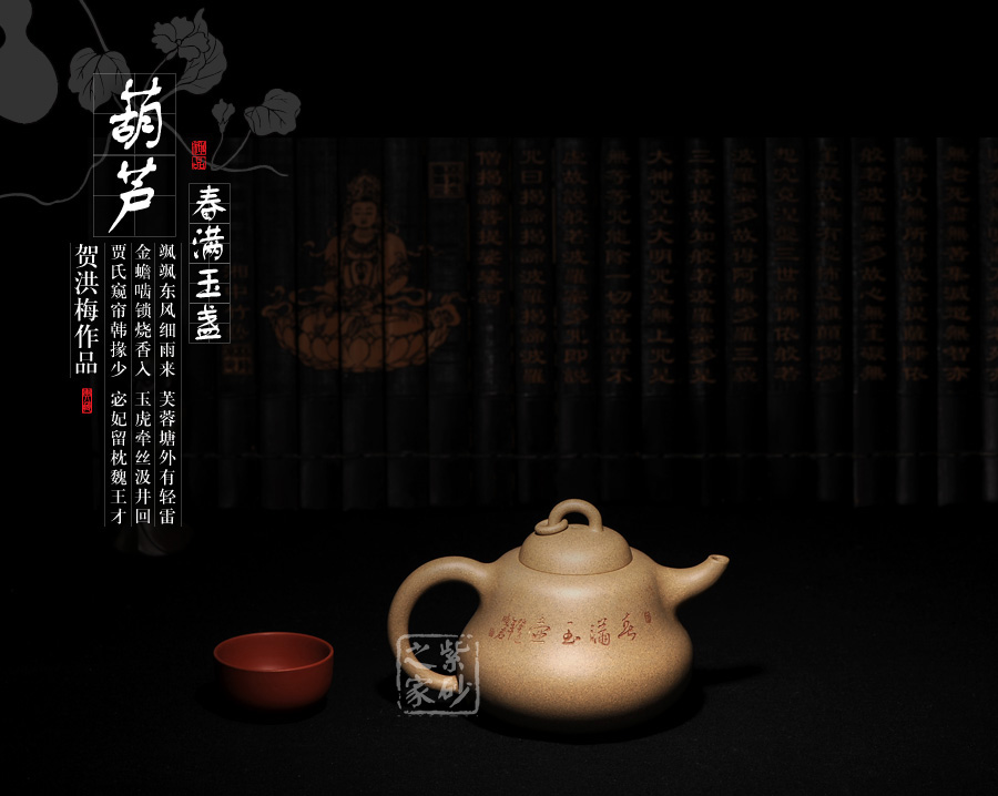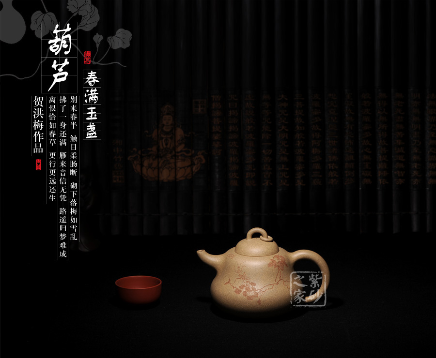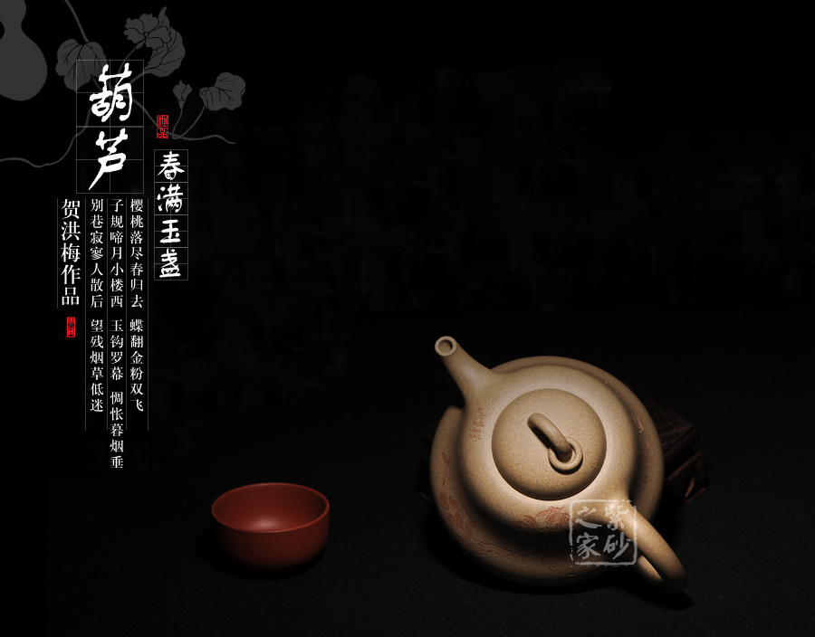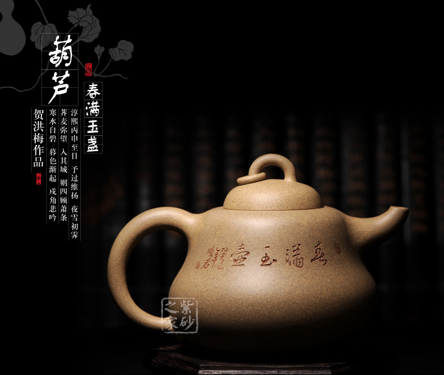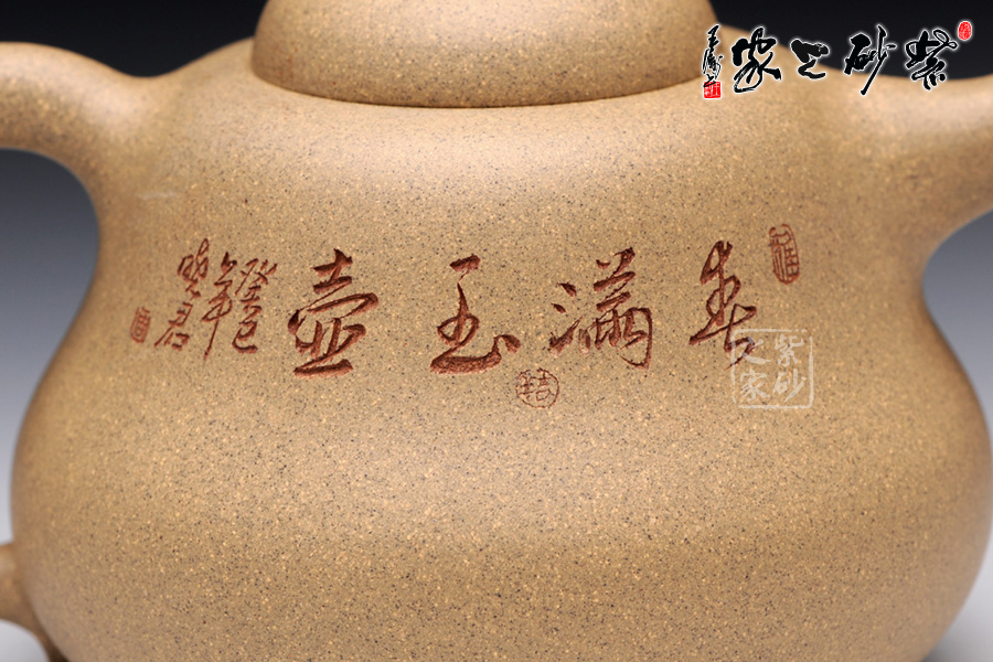 B面: 裝飾: 詩(shī)詞 裝飾者:周小軍(曉君) 裝飾內(nèi)容: 此壺裝飾、篆刻由國(guó)家工藝美術(shù)師周小軍操刀,壺身反面刻繪為“春滿玉盞”四字,春的韻味和情調(diào)就像一杯美酒一般,滋味綿長(zhǎng),回味無(wú)窮,春天是最浪漫的季節(jié),到處都是詩(shī)情畫(huà)意一般的景象,令人無(wú)限向往。