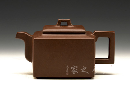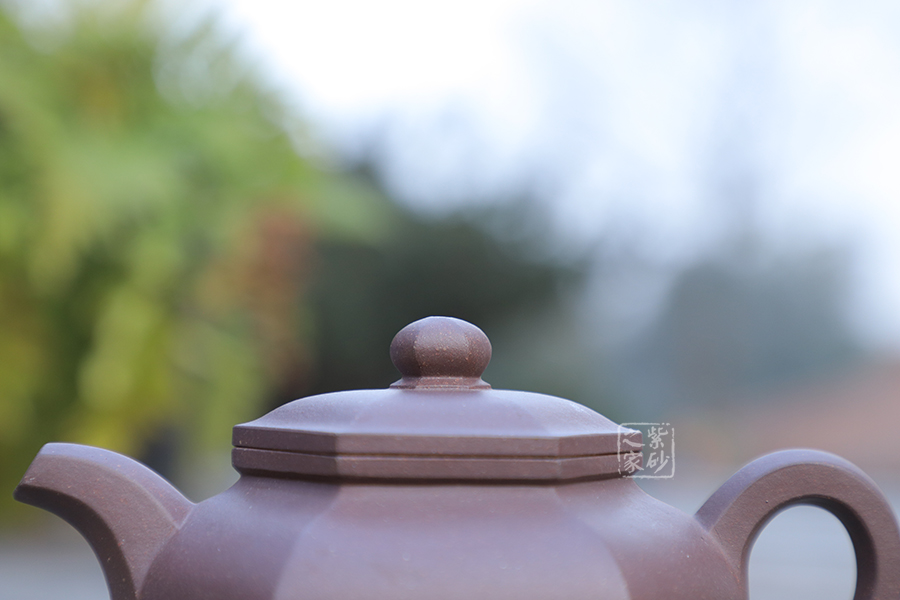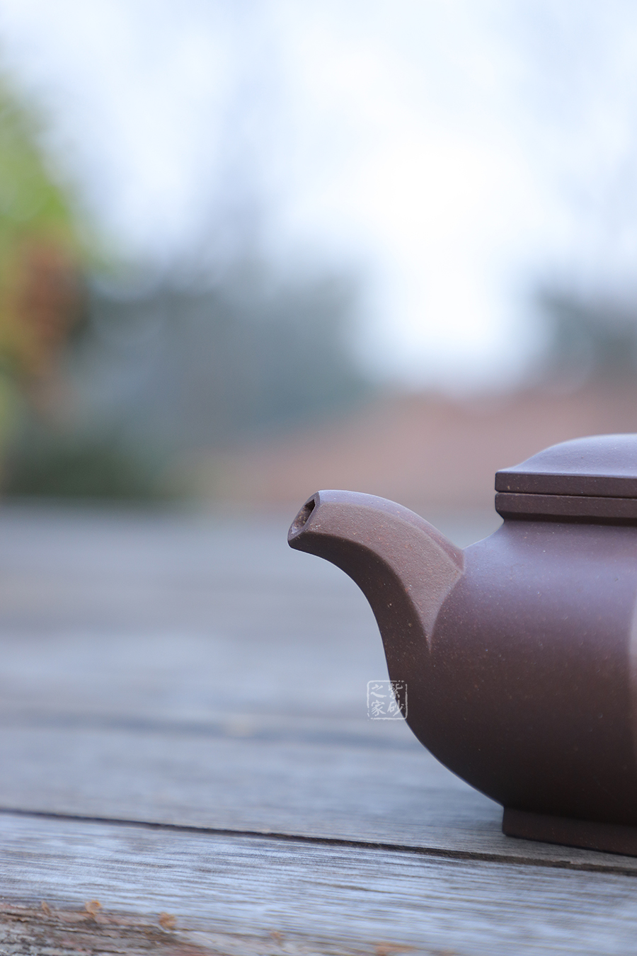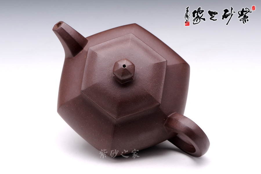 俯視壺體,棱角分明又不顯銳利,造型敦厚,壺嘴、壺鈕、壺把三點(diǎn)一線,壺型規(guī)整,工藝獨(dú)到。