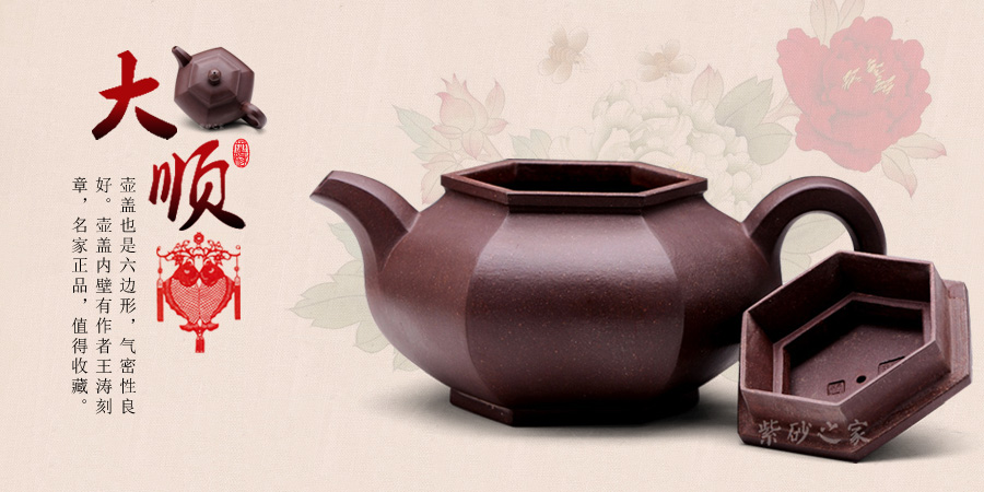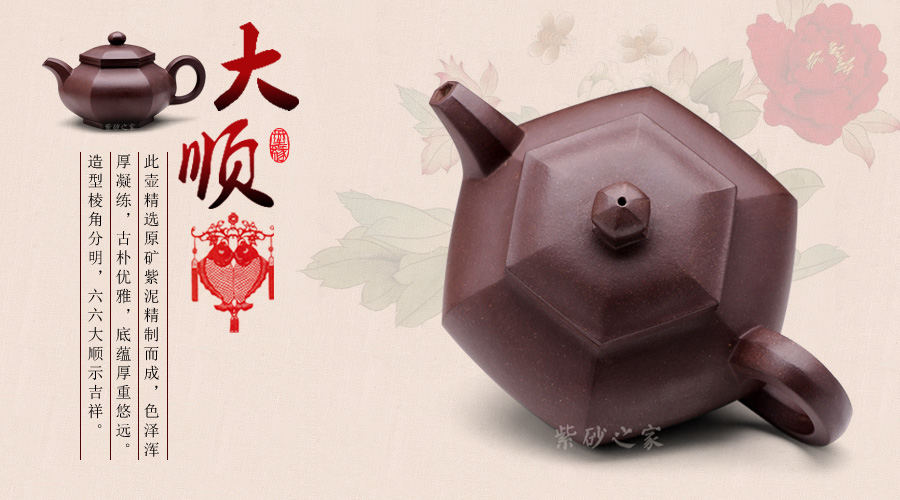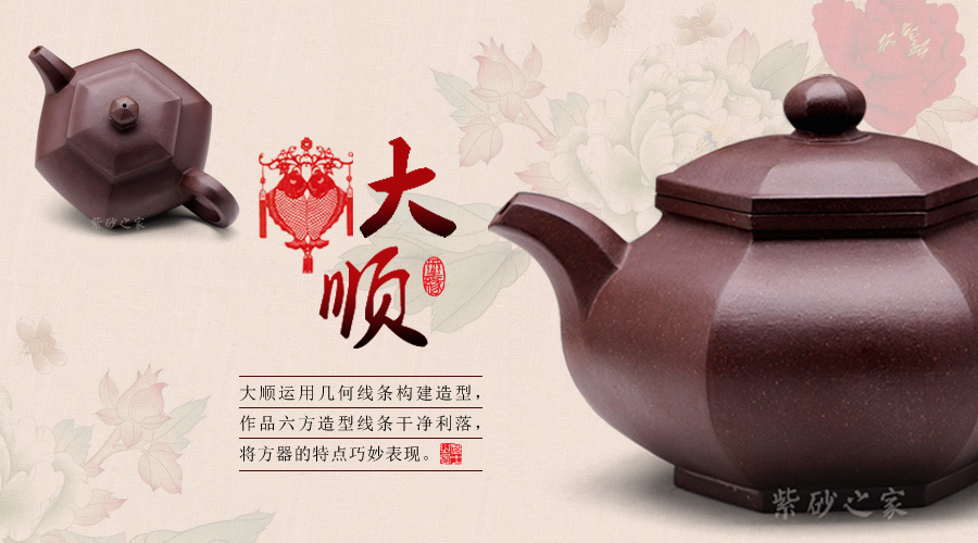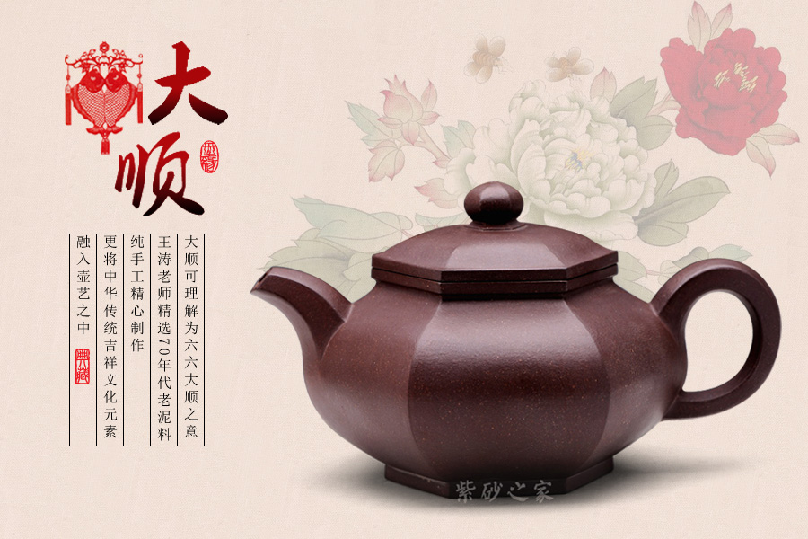 大順可理解為六六大順之意。 王濤老師精選70年代老泥料 ,純手工精心制作。 更將中華傳統(tǒng)吉祥文化元素 融入壺藝之中。