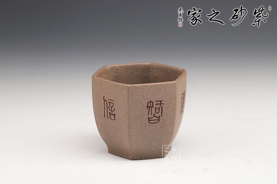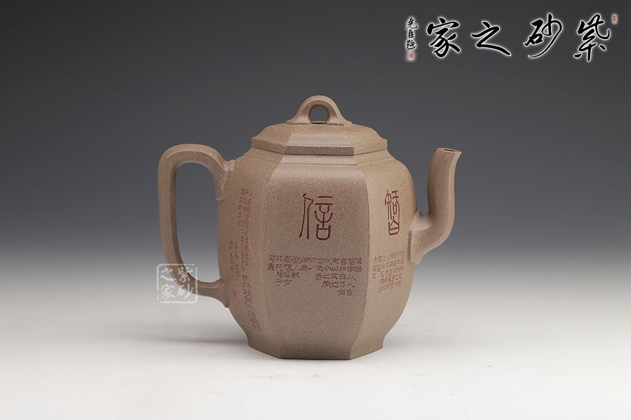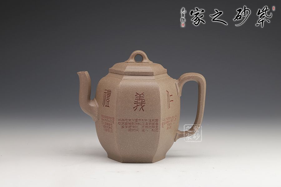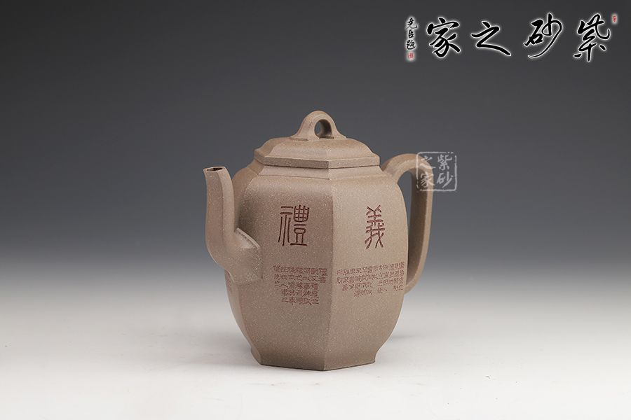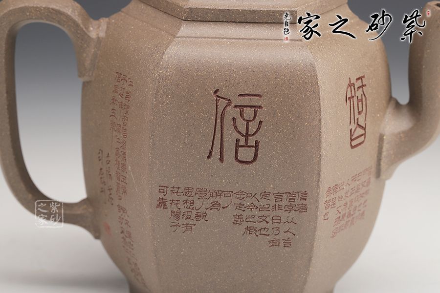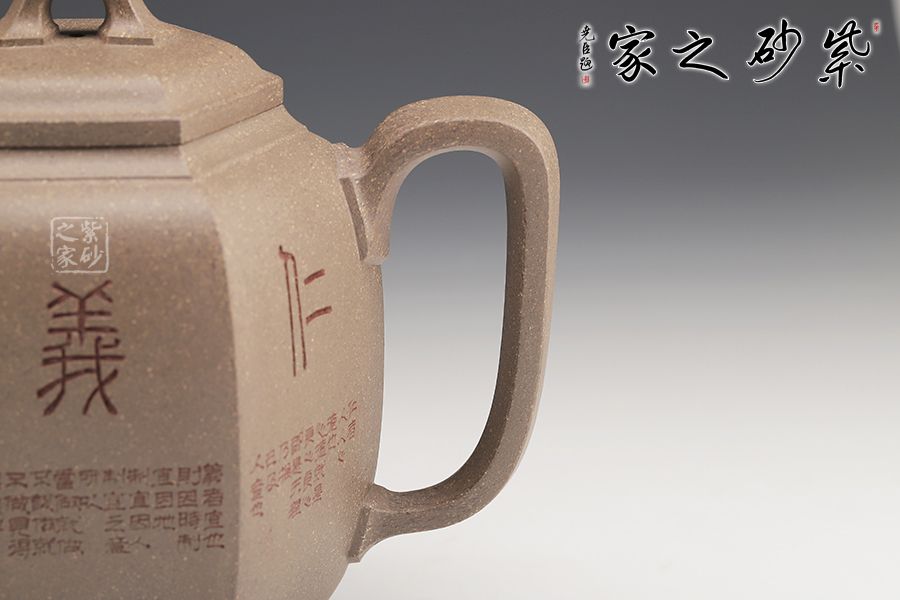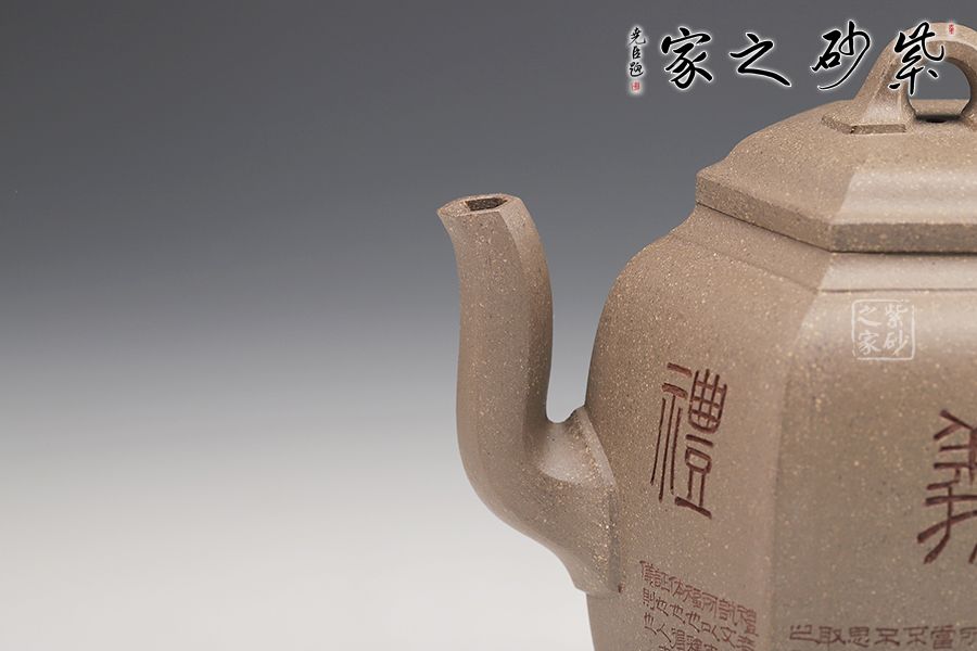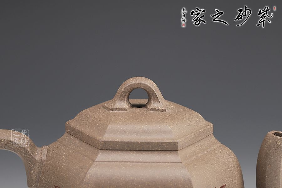 壺體以六方呈現(xiàn),輪廓優(yōu)雅,上下收斂,氣度飽滿。拱橋壺鈕,小巧可愛。蓋、頸、身皆為六方,氣韻通貫。三彎流出水爽利,耳天把端握舒適。此壺線條鮮明有力,比例協(xié)調(diào),工藝精美,成型難度頗大,足見作者功底之深厚。