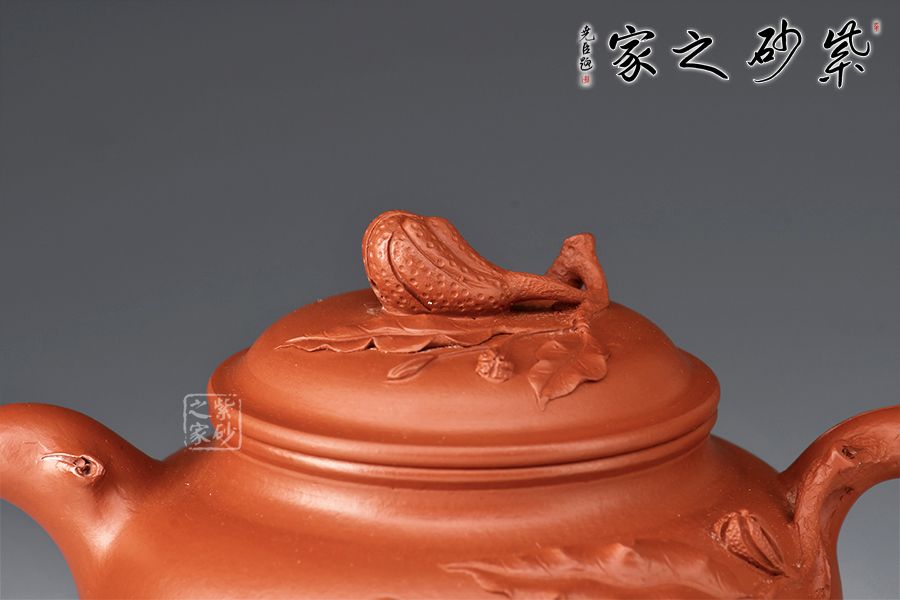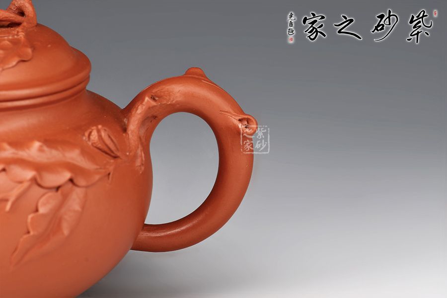 此佛手壺壺體鼓腹,上收至壺口,下收至圈足,高壺頸、外包口沿,子母線吻合嚴密,氣密性好,壺蓋向上鼓起,蓋上貼塑佛手為壺鈕,并有兩片綠葉襯托;短彎流,耳形把前后相應,節(jié)疤分布合理;壺把底部伸出嫩枝,并貼塑綠葉,與壺身相應,更顯風姿。整器造型端莊古雅,仿生自然,色澤鮮麗,320cc壺體,實用舒適,值得推薦!