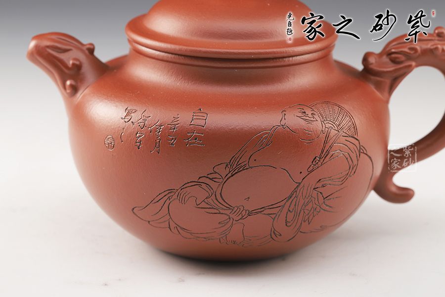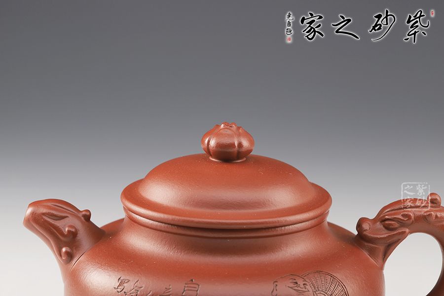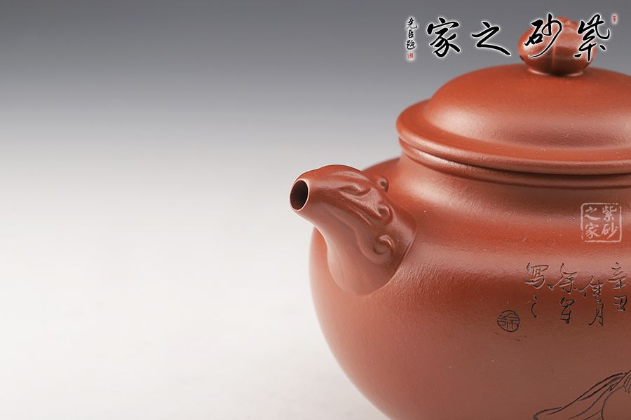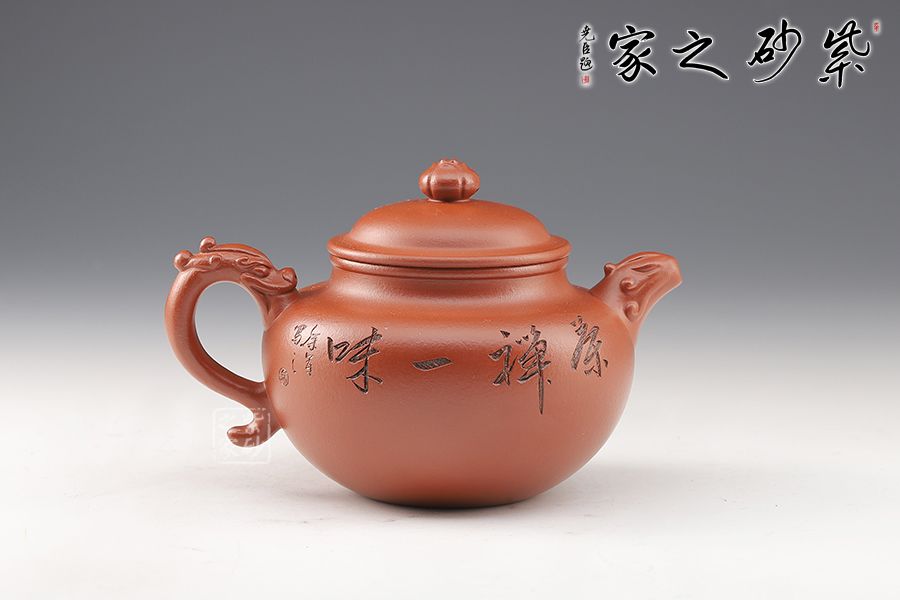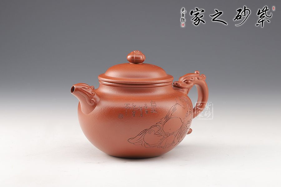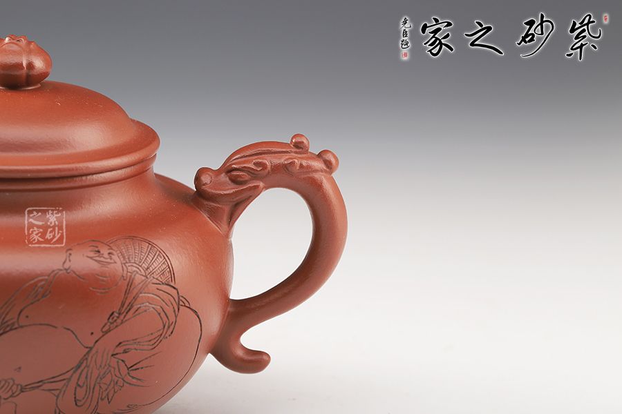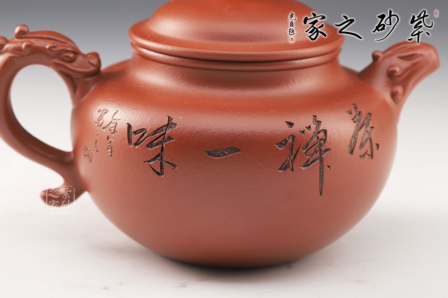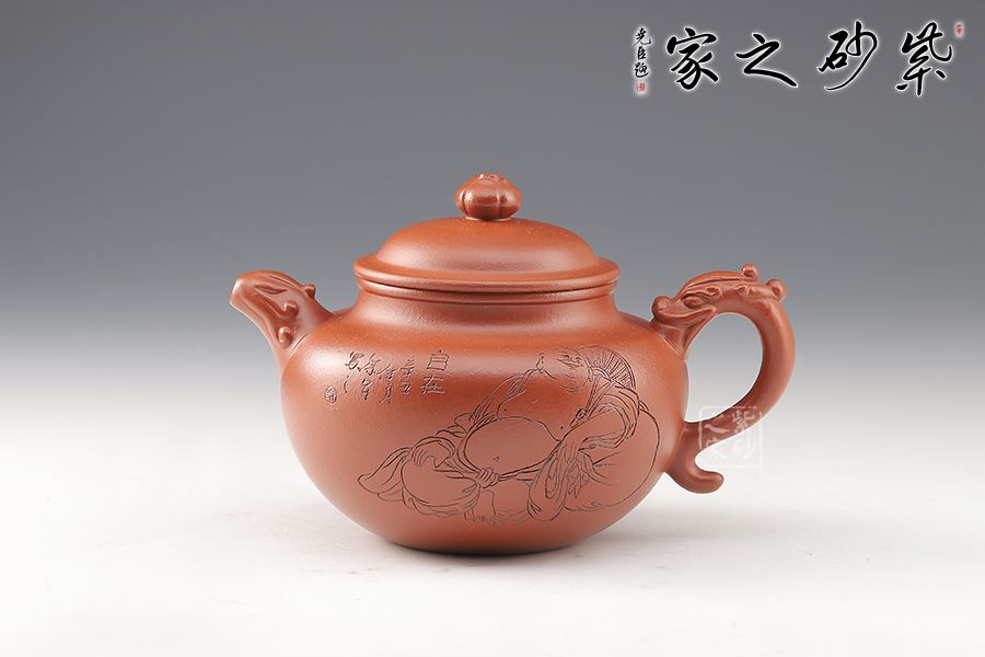 此壺精巧玲瓏,色澤純正。壺身飽滿圓融,豐腴優(yōu)雅,半圓的壺蓋邊沿修平,與子口組成子母線,呈天壓地之勢(shì),保證了壺身的氣密性。嘴、把雕刻龍形圖案,將中國(guó)傳統(tǒng)文化融為其中,圓珠壺鈕點(diǎn)在蓋頂中央。整器自然美觀,古典雅致,值得收藏。